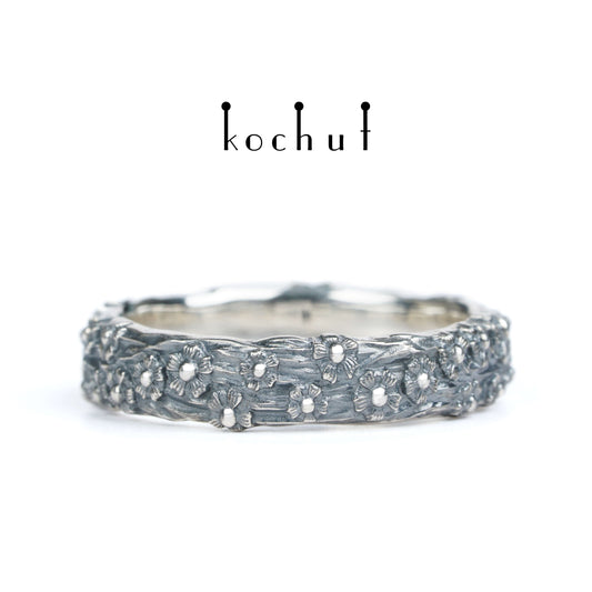 Winterzweig — Ring aus Weißgold mit Granat, beschichtet mit schwarzem Rhodium
