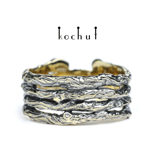 Breiter Zweig — Ring aus Gelbgold mit Diamanten, beschichtet mit schwarzem Rhodium