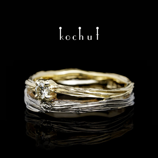 Das Auge des Waldes – Weiß- und Gelbgold-Ehering mit einem Diamanten, überzogen mit schwarzem Rhodium
