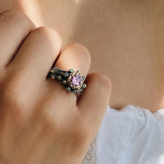 Der Triumph des Lebens — Ring aus oxidiertem Silber und Gelbgold mit Amethysten und Smaragden