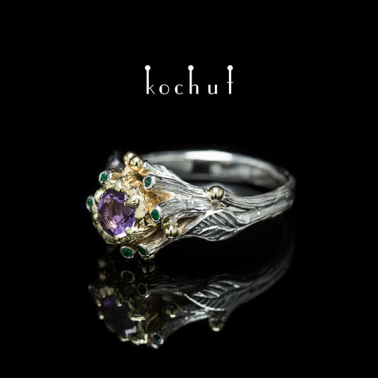 Triumph des Lebens — Ring aus Weiß- und Gelbgold mit Amethysten und Smaragden, überzogen mit weißem Rhodium