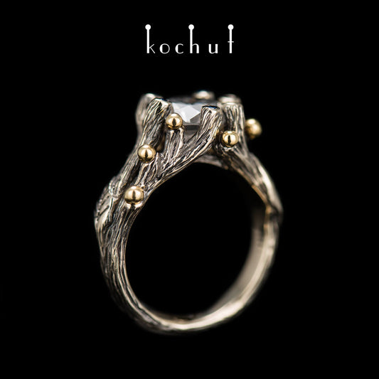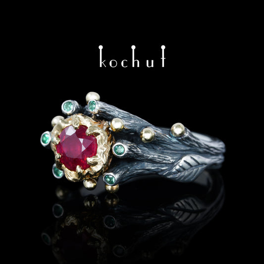 Triumph des Lebens — ein Ring aus oxidiertem Silber und Gelbgold mit Rubin und Smaragden