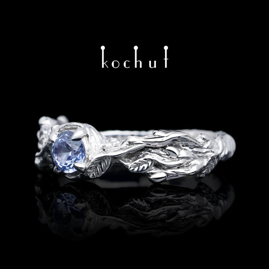 Sprossen — silberner Ring mit Kornblumen-Saphir, beschichtet mit Weißgoldrhodiumm.