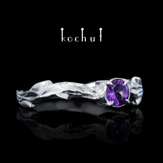 März Zweig — ein Ring aus Weißgold, plattiert mit weißem Rhodium und Amethyst