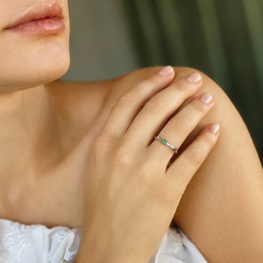 Zartes Zweig — silberner Ring mit Smaragd, überzogen mit weißem Rhodium