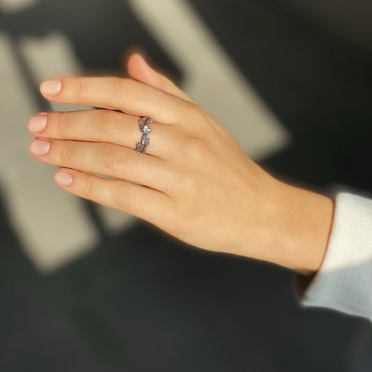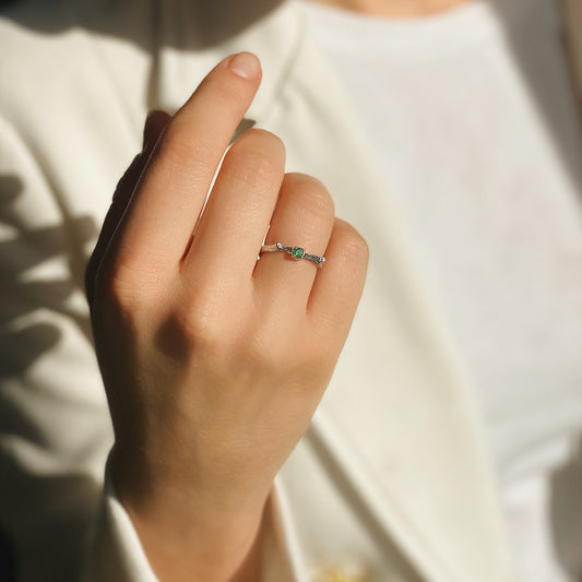 Zerbrechlicher Zweig — Ring aus oxidiertem Silber mit einem Smaragd