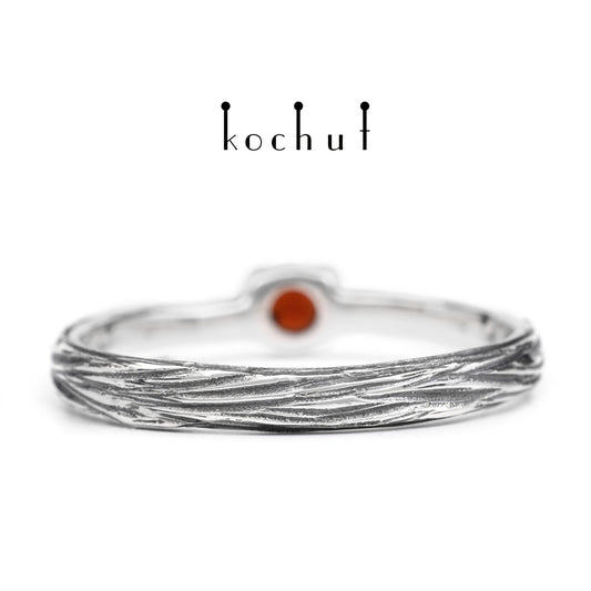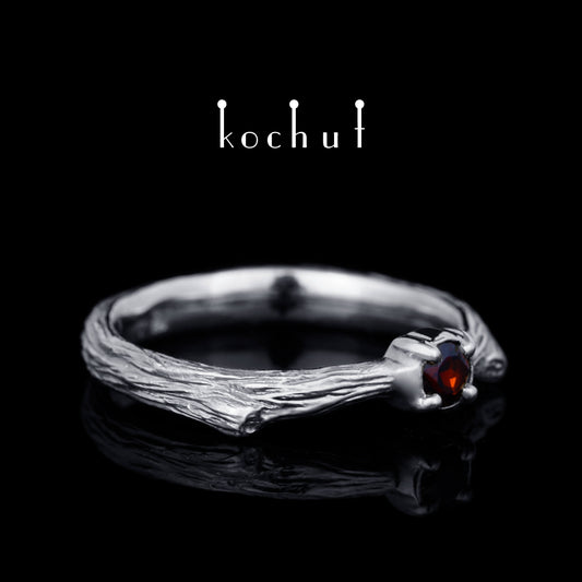 Zartes Zweig — ein silberner Ring mit Weißrhodium und einem Granat