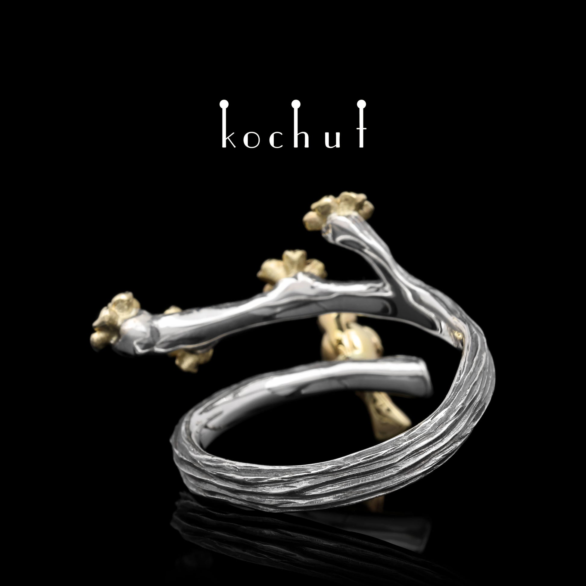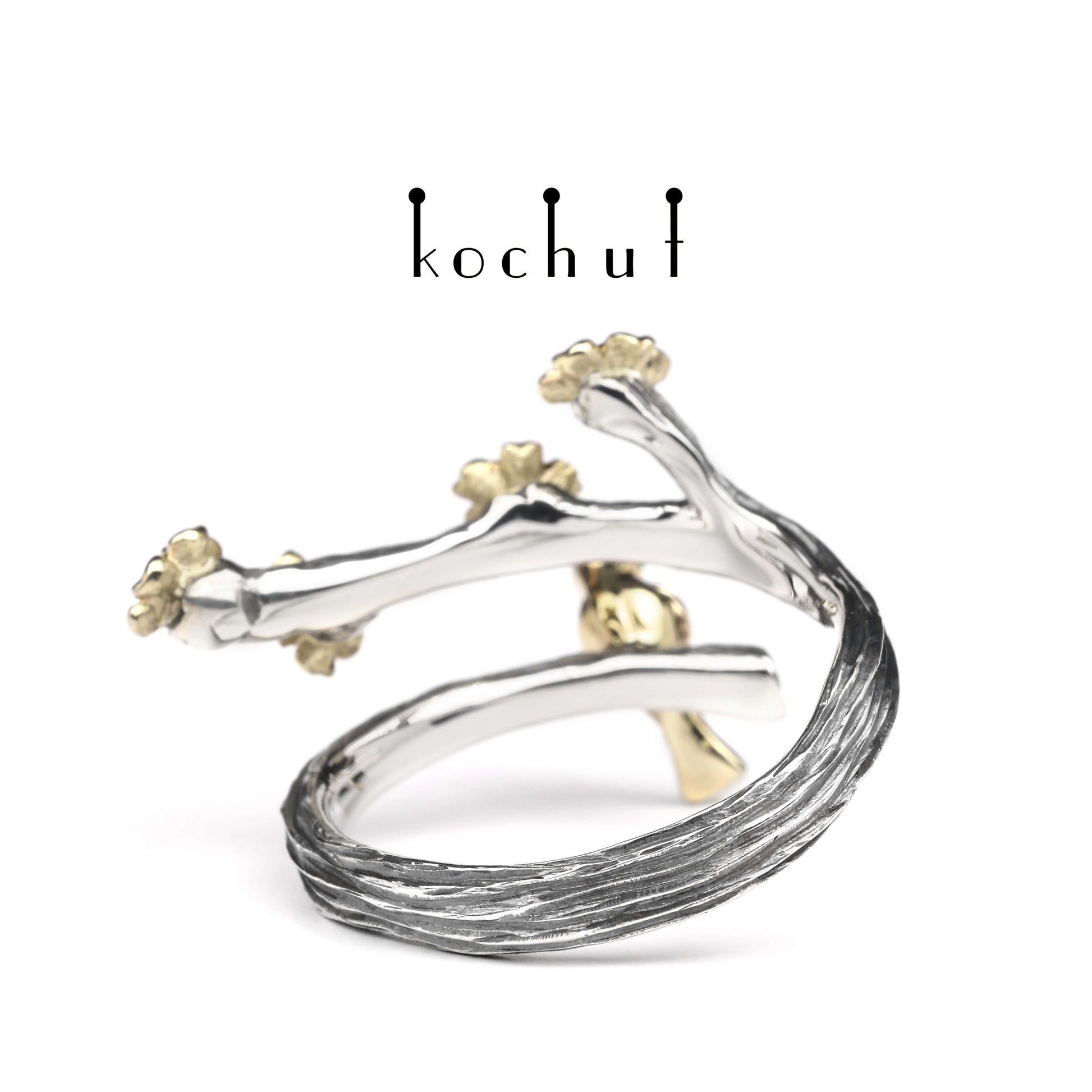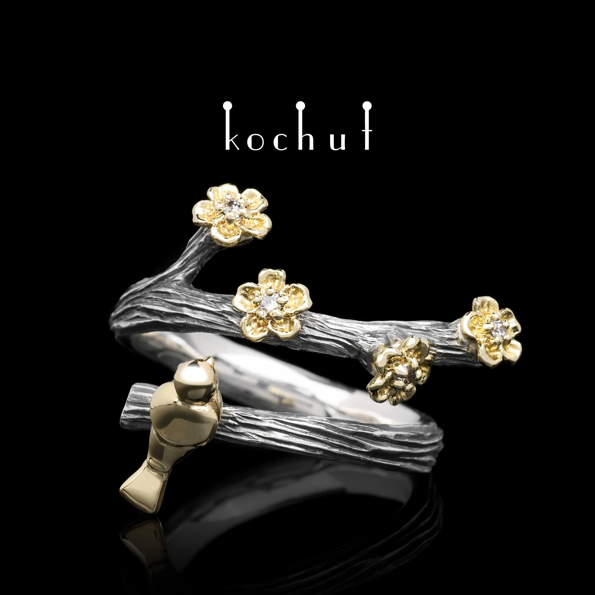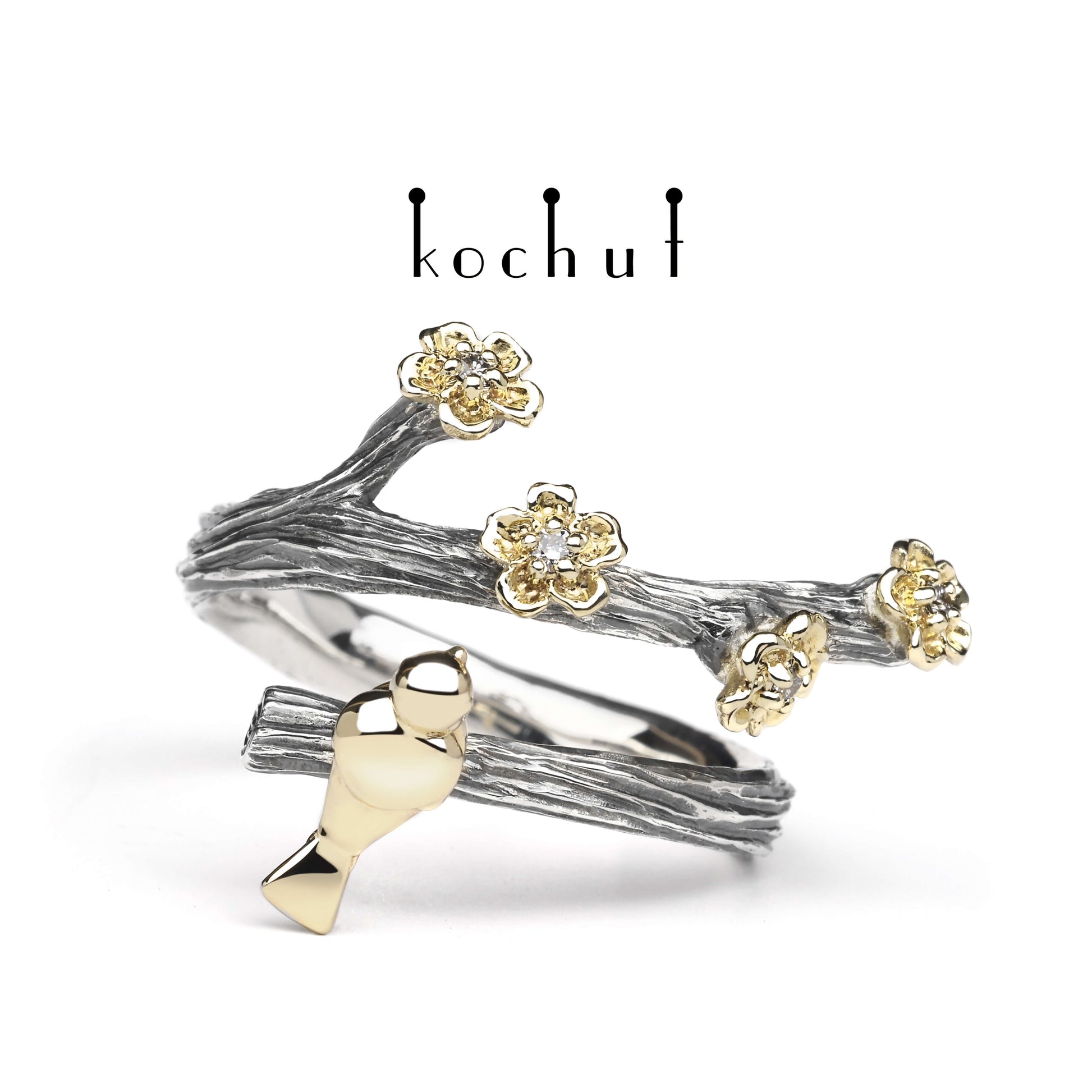 Vögelchen auf dem Zweig — Ring aus oxidiertem Silber und Gelbgold mit Diamanten