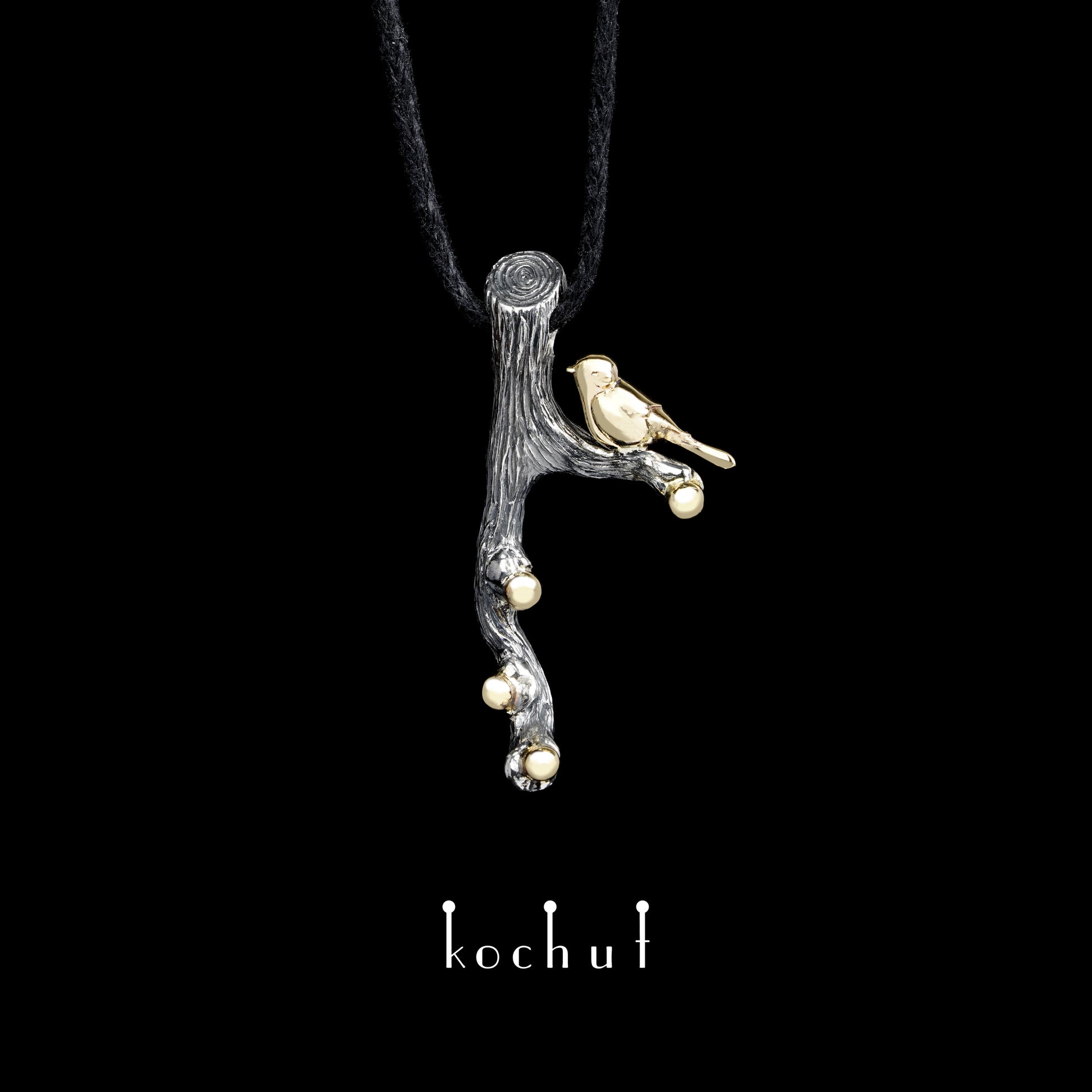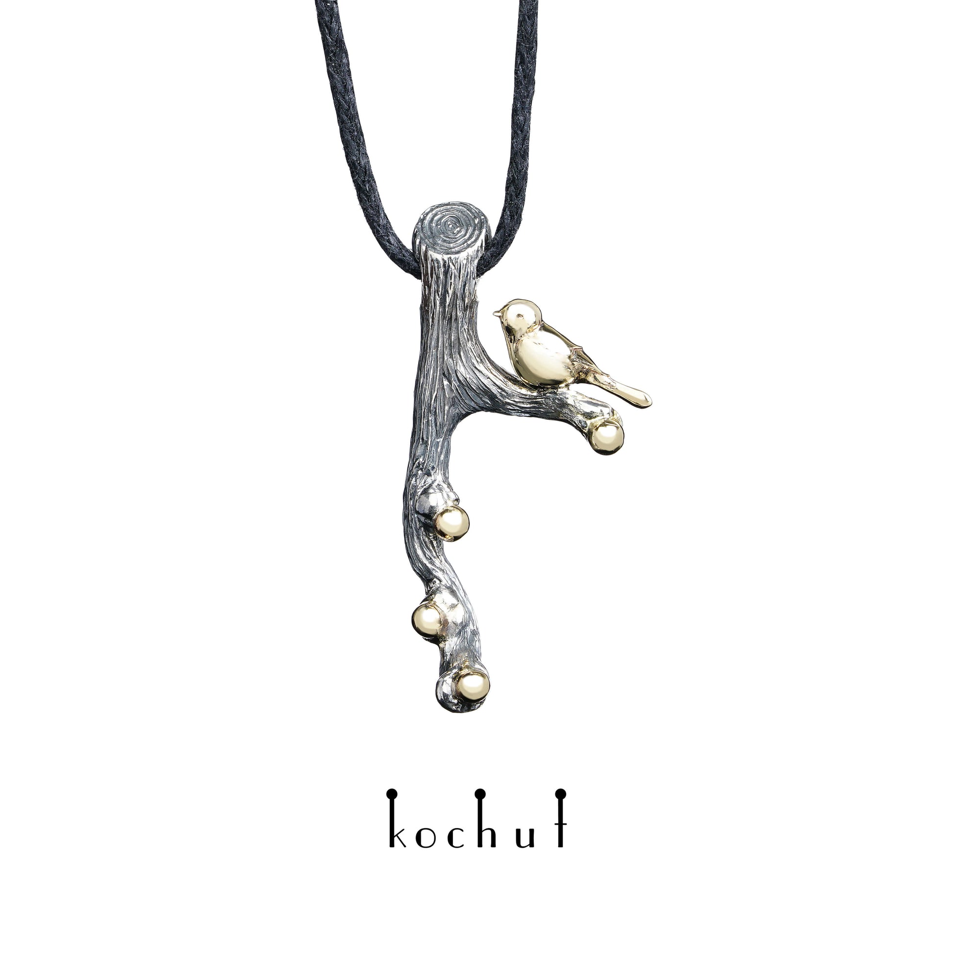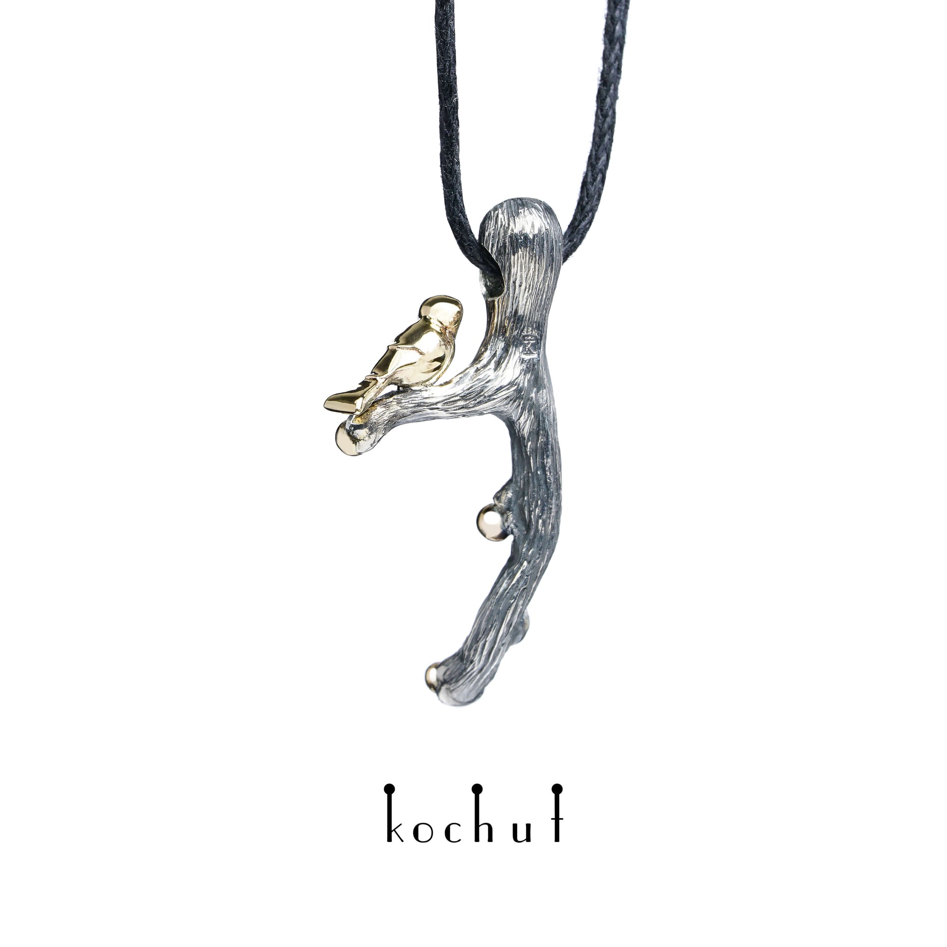 Vögelchen auf dem Zweig — Anhänger aus oxidiertem Silber und Gelbgold