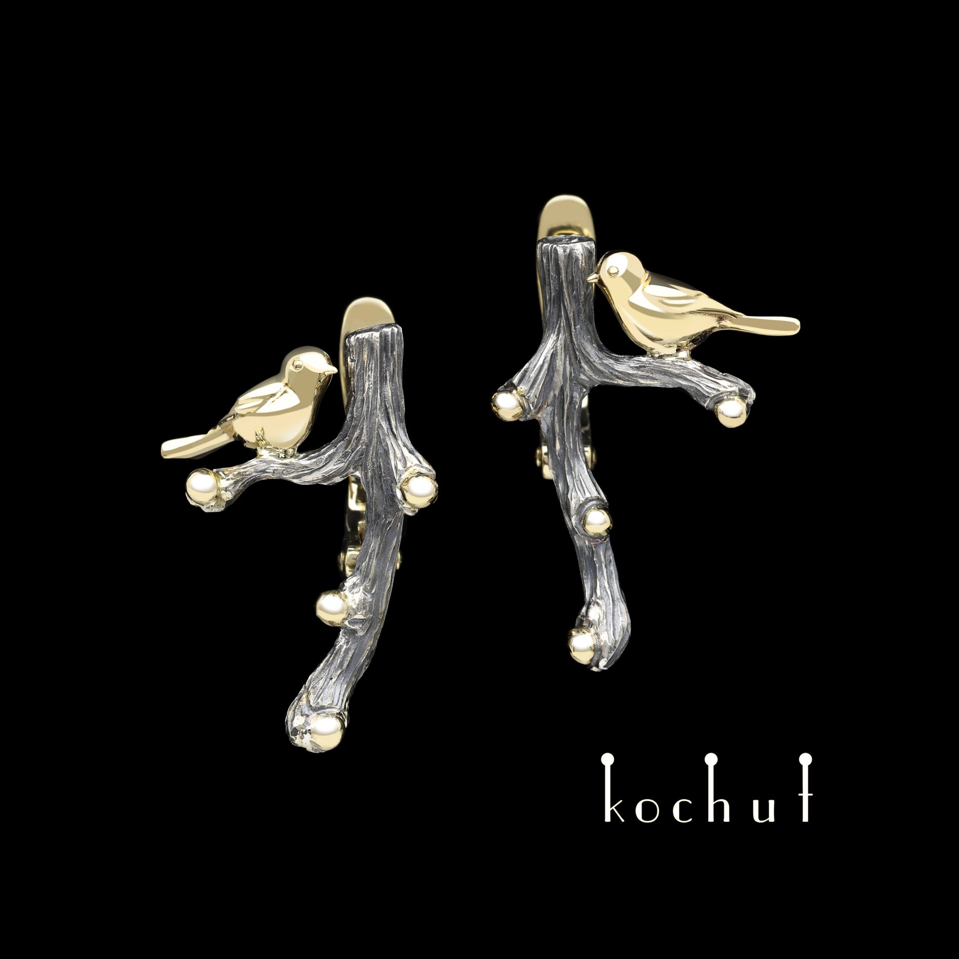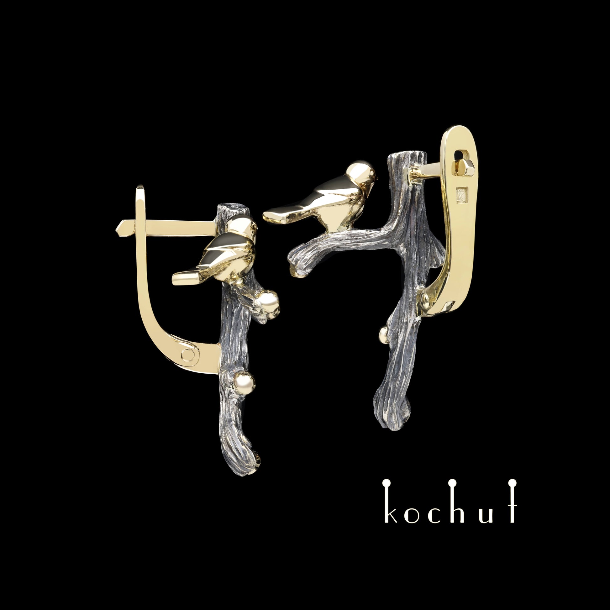 Vögelchen auf dem Zweig — Ohrringe aus oxidiertem Silber und Gelbgold