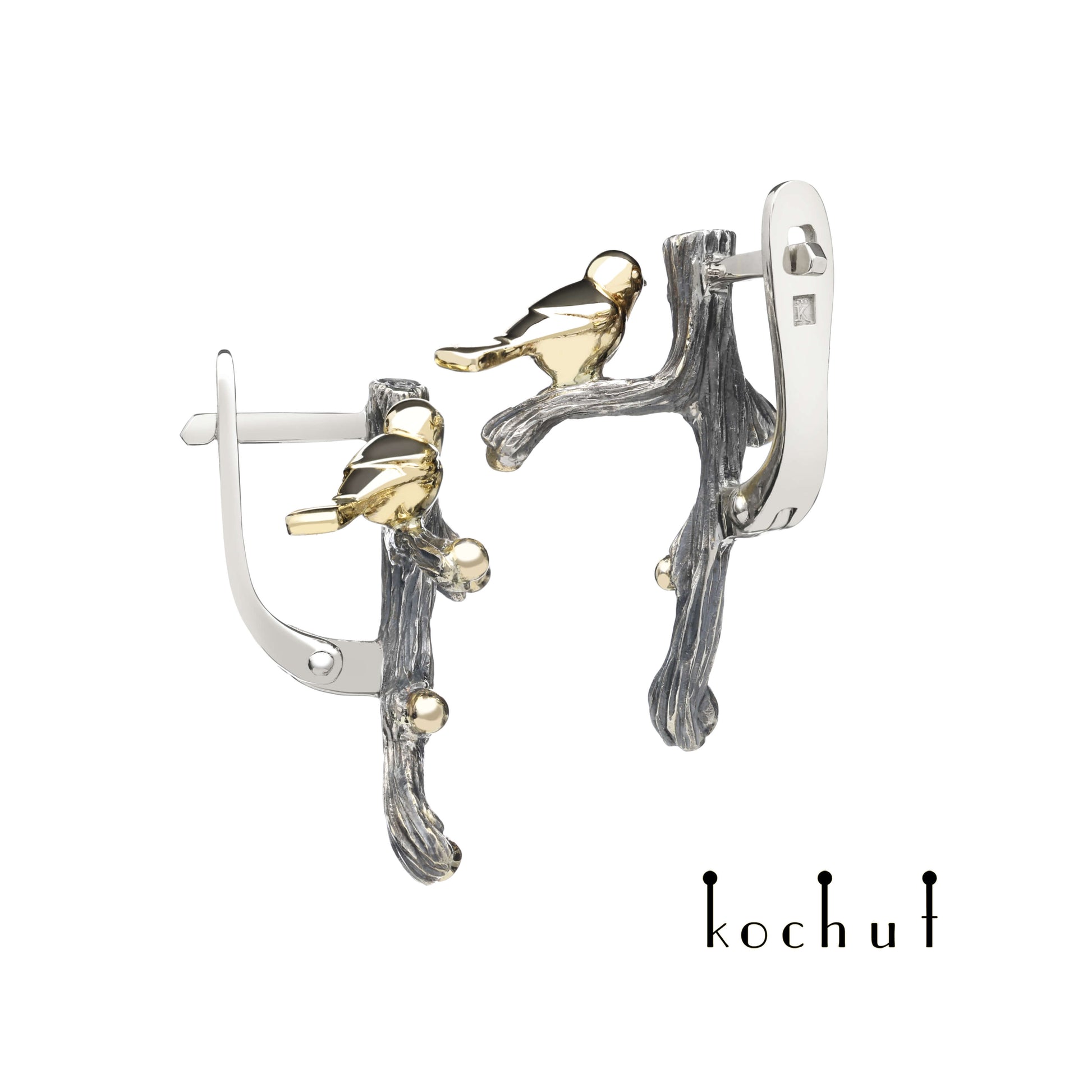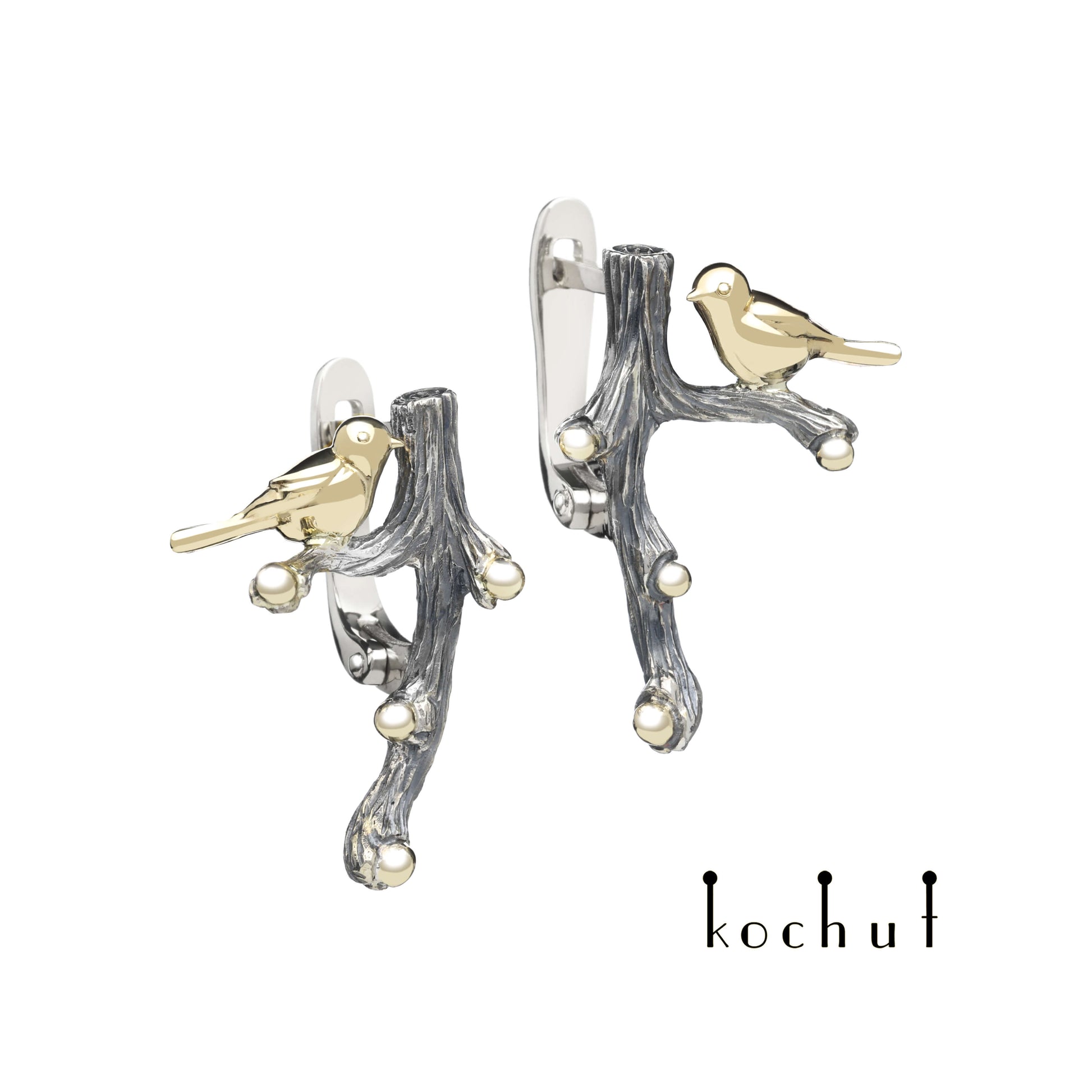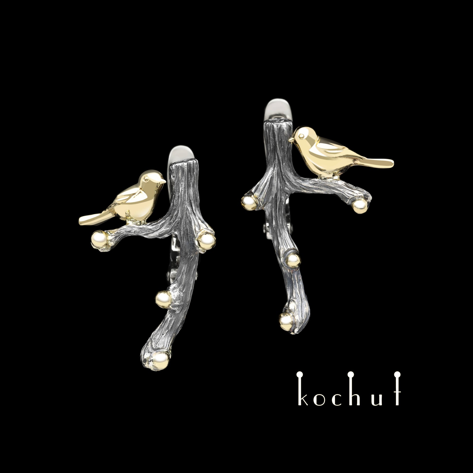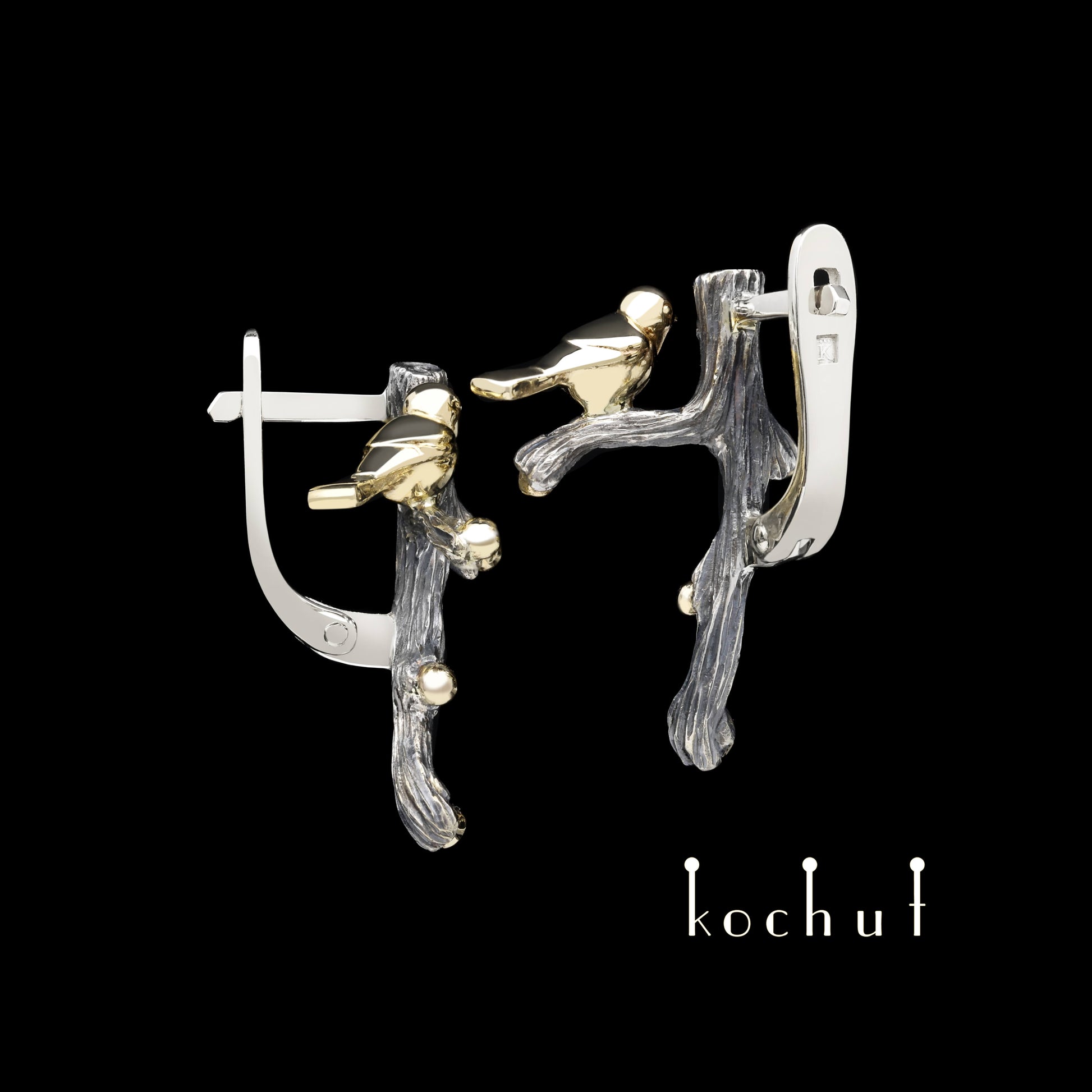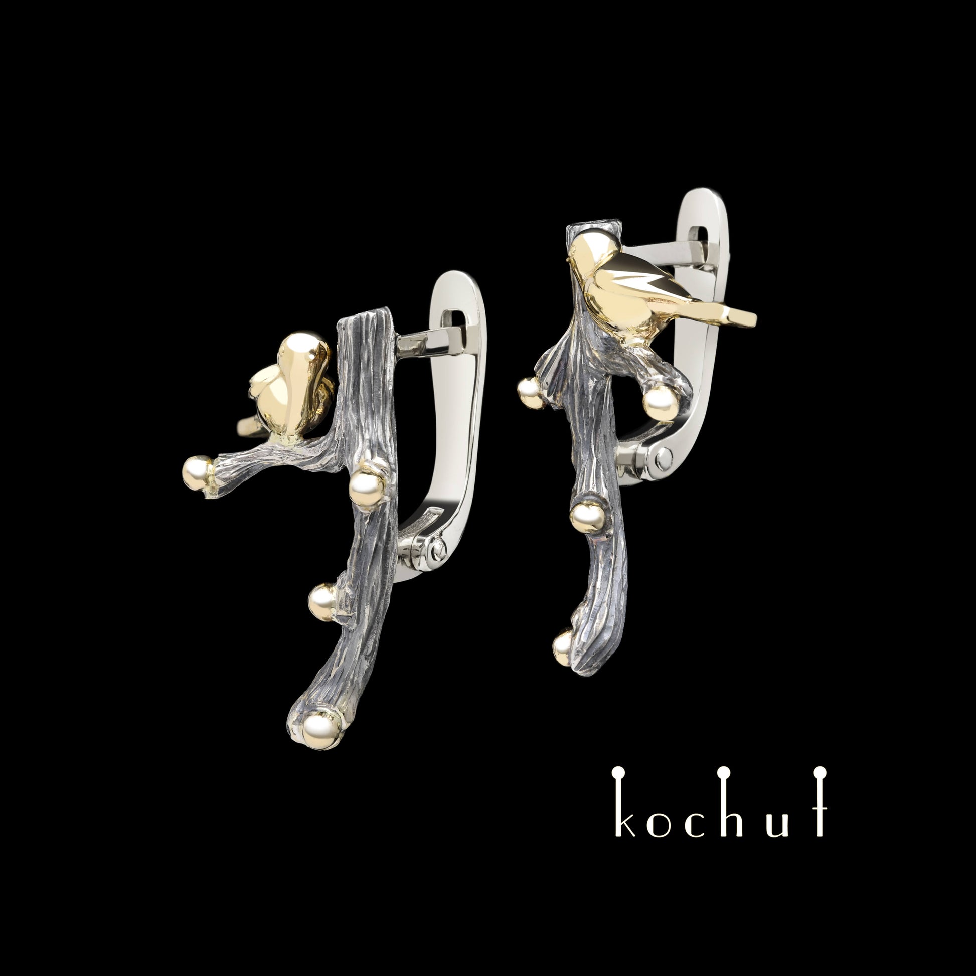 Vögelchen auf dem Zweig — Ohrringe aus oxidiertem Silber und Gelbgold