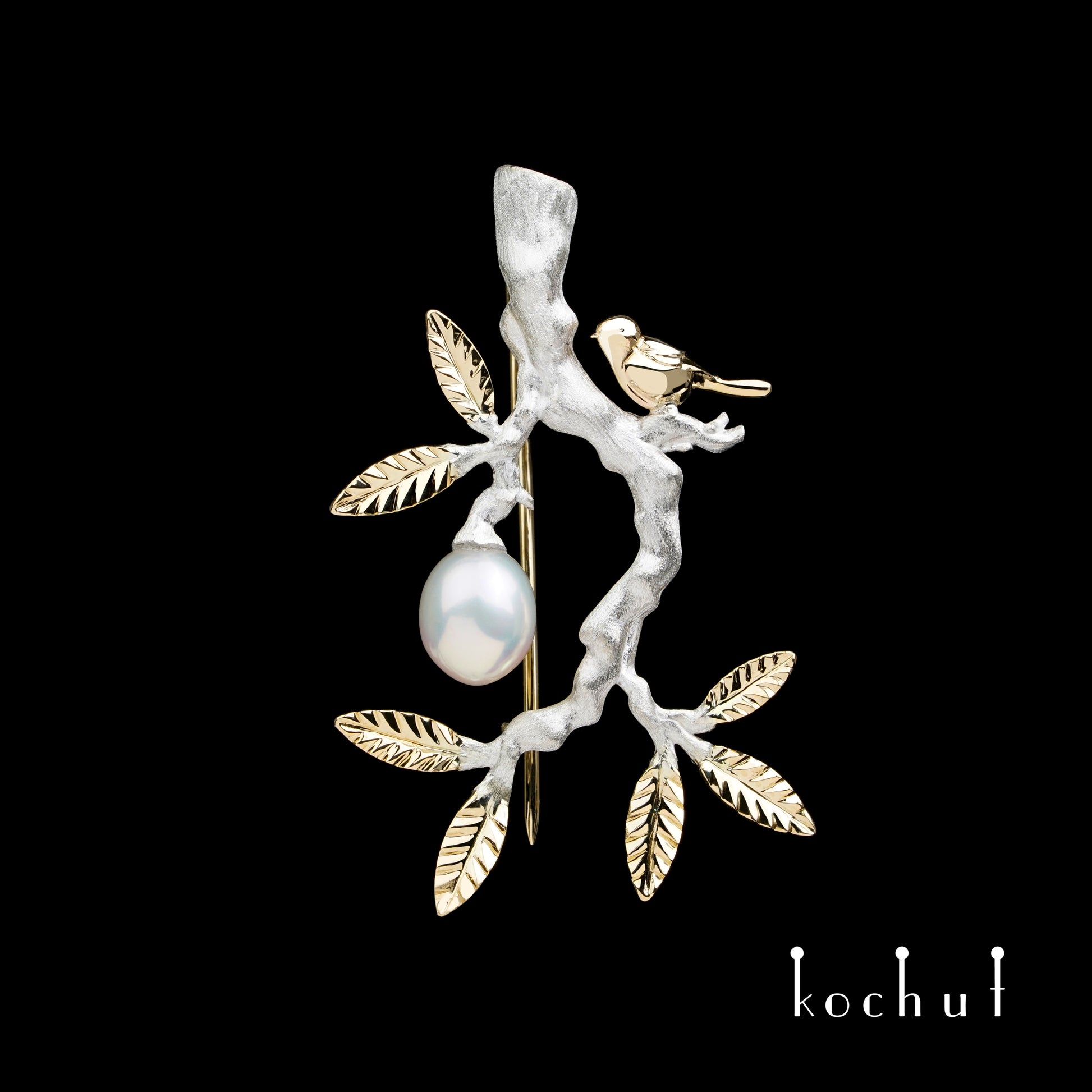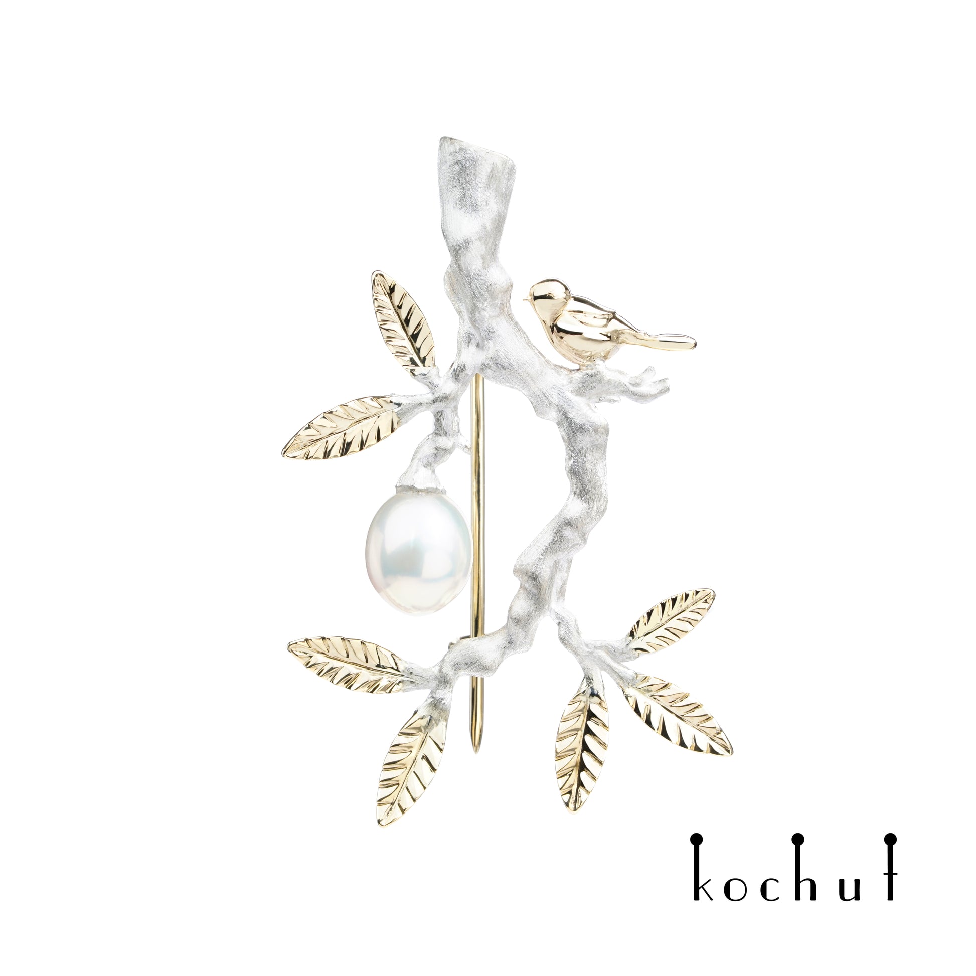 Paradieszweig — Brosche aus Sterlingsilber, Gelbgold mit Perle