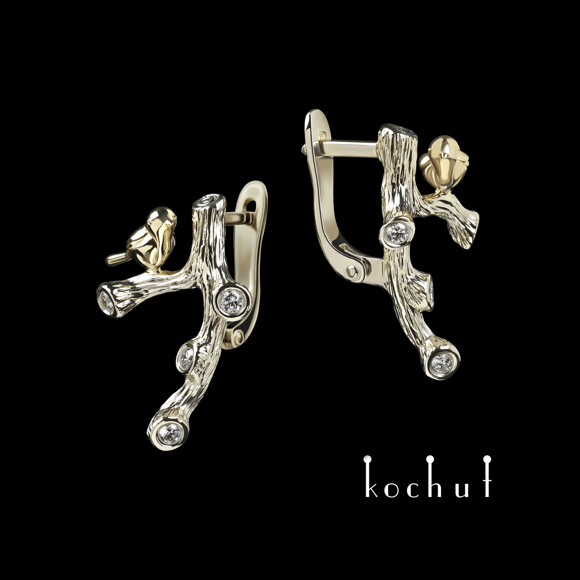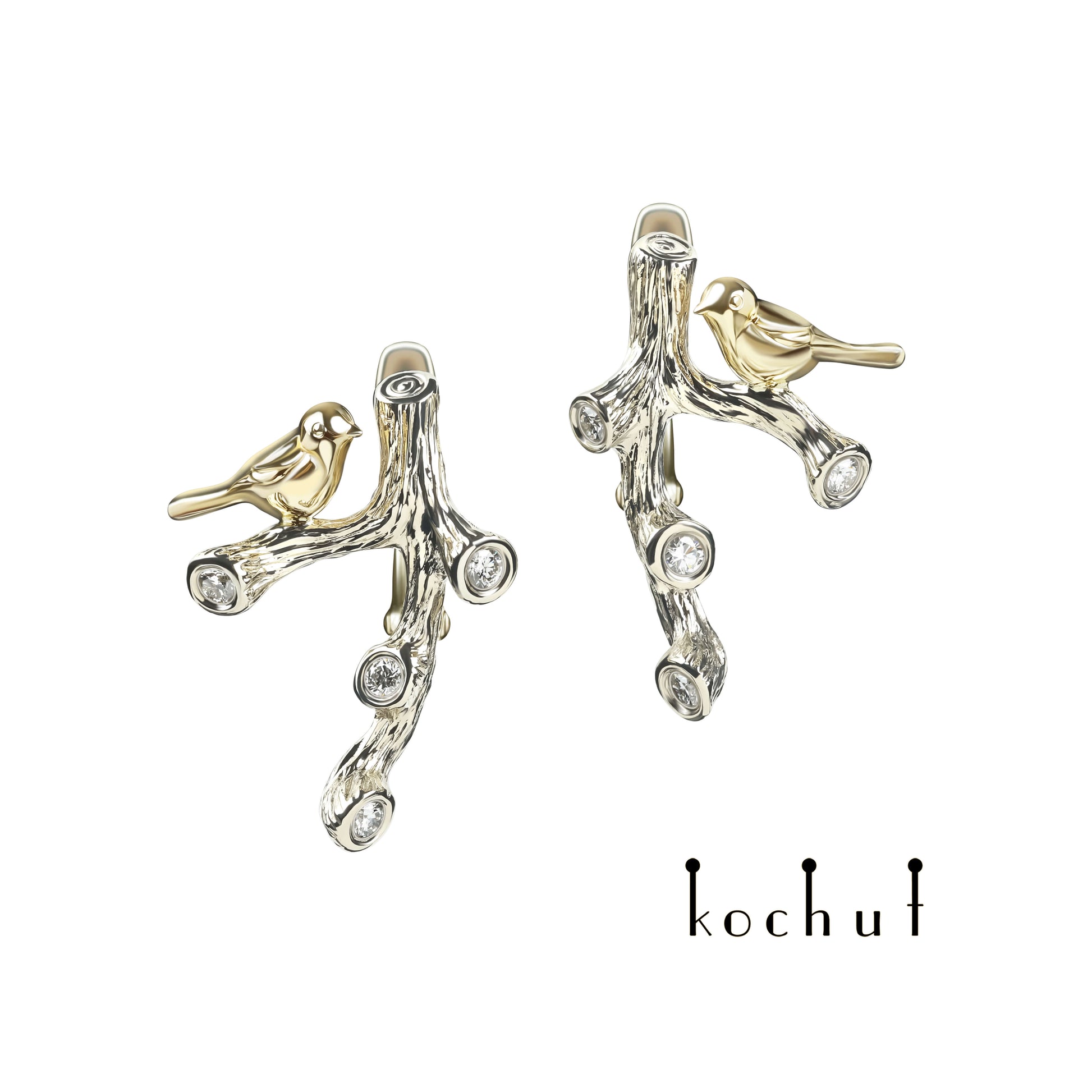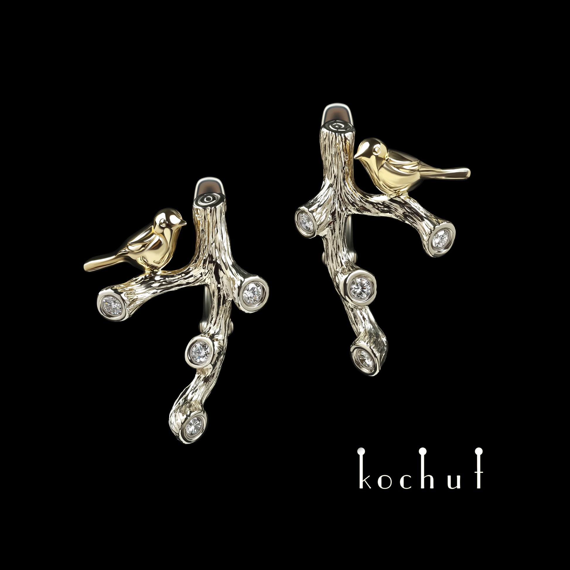 Vögel auf einem Zweig — Ohrringe aus Weiß- und Gelbgold mit Diamanten