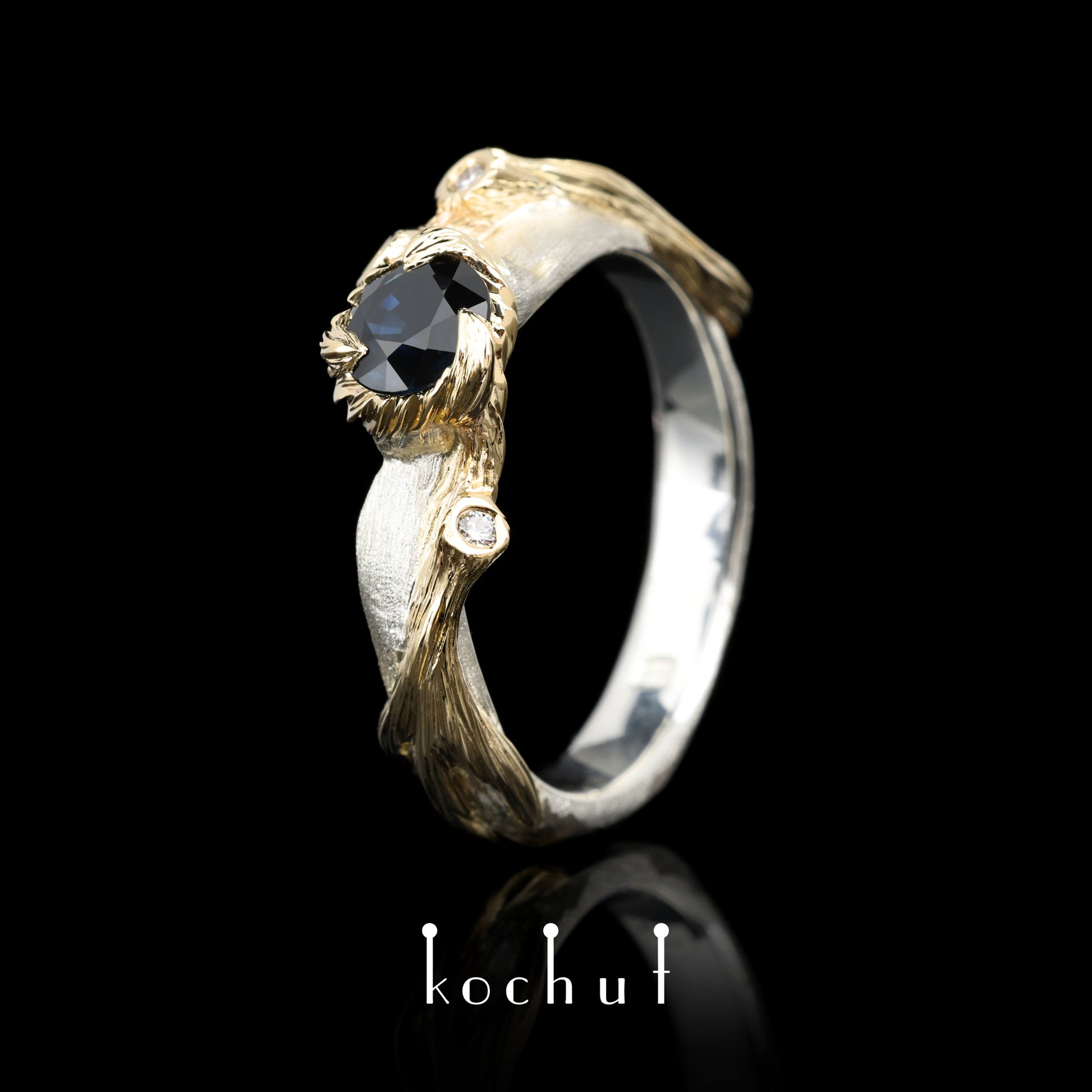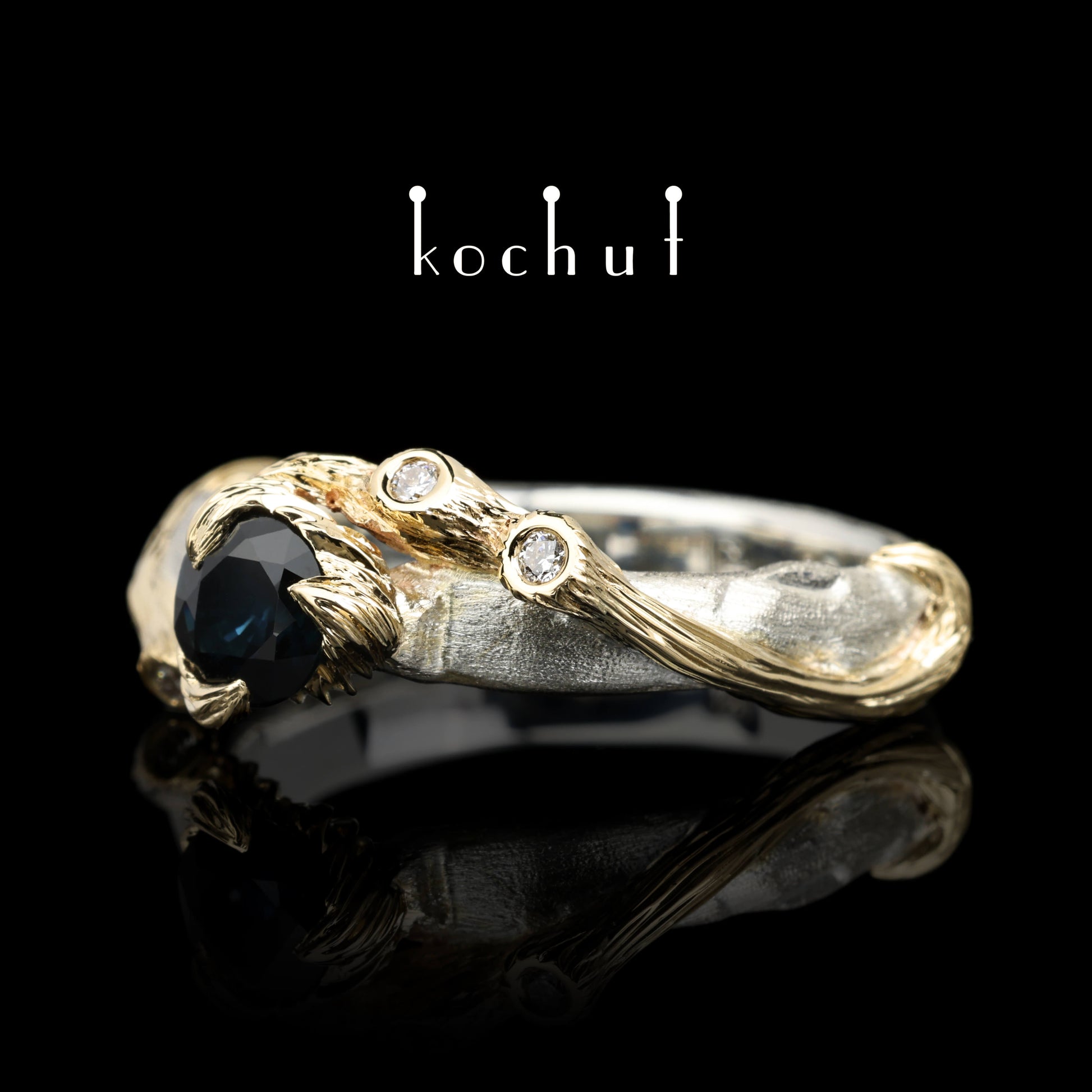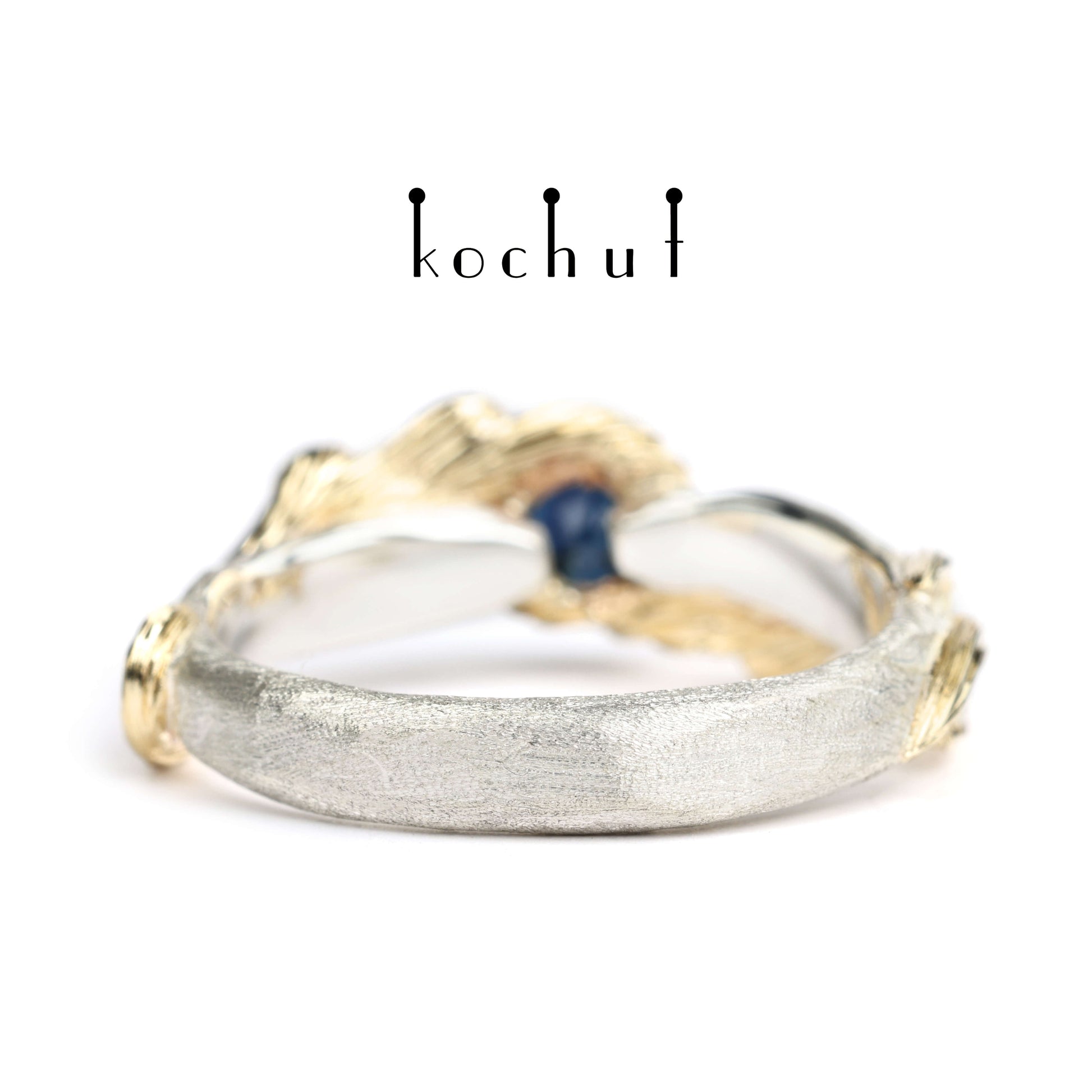 Der Ring ist aus Silber gefertigt, mit Zweigen aus Gelbgold überzogen. Die Schönheit des Meeresreichs offenbart einen luxuriösen Saphir. Kleine Diamanten verstecken sich an den Enden der Zweige, wie kleine Tautropfen im sonnigen Ozean.
