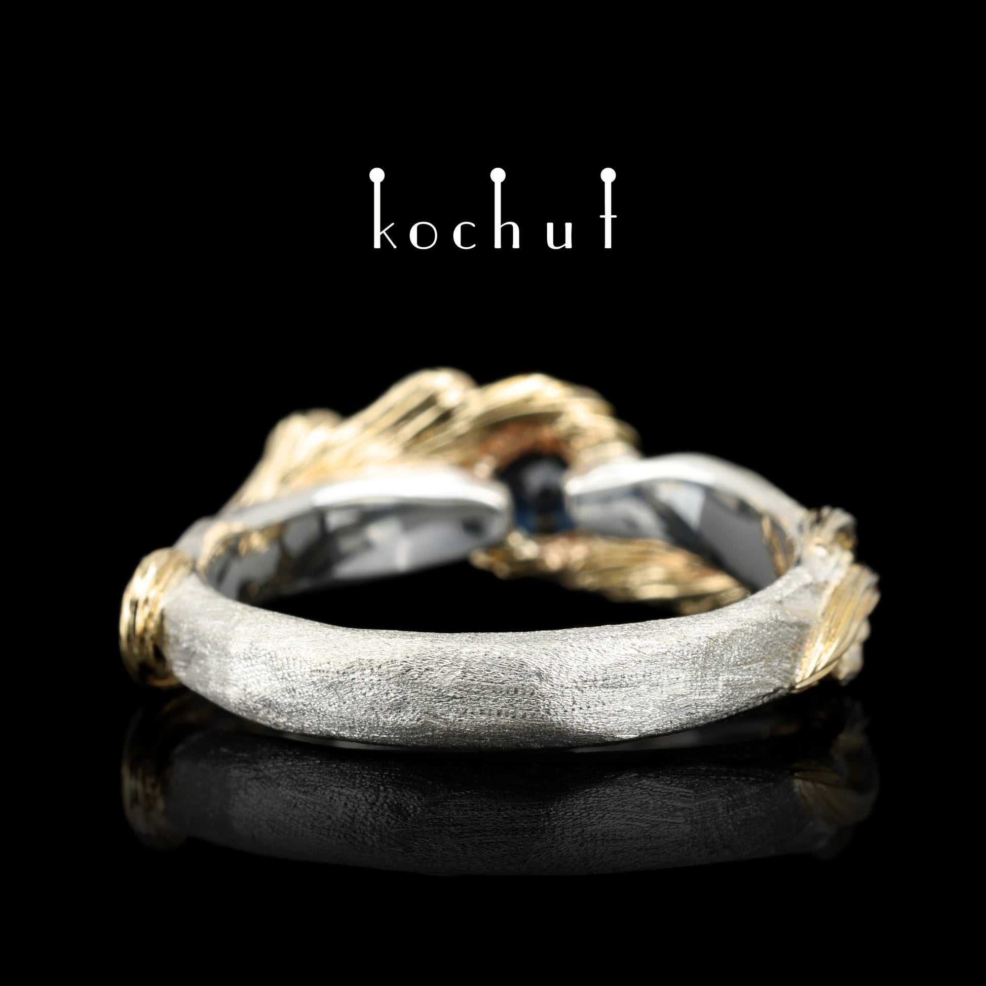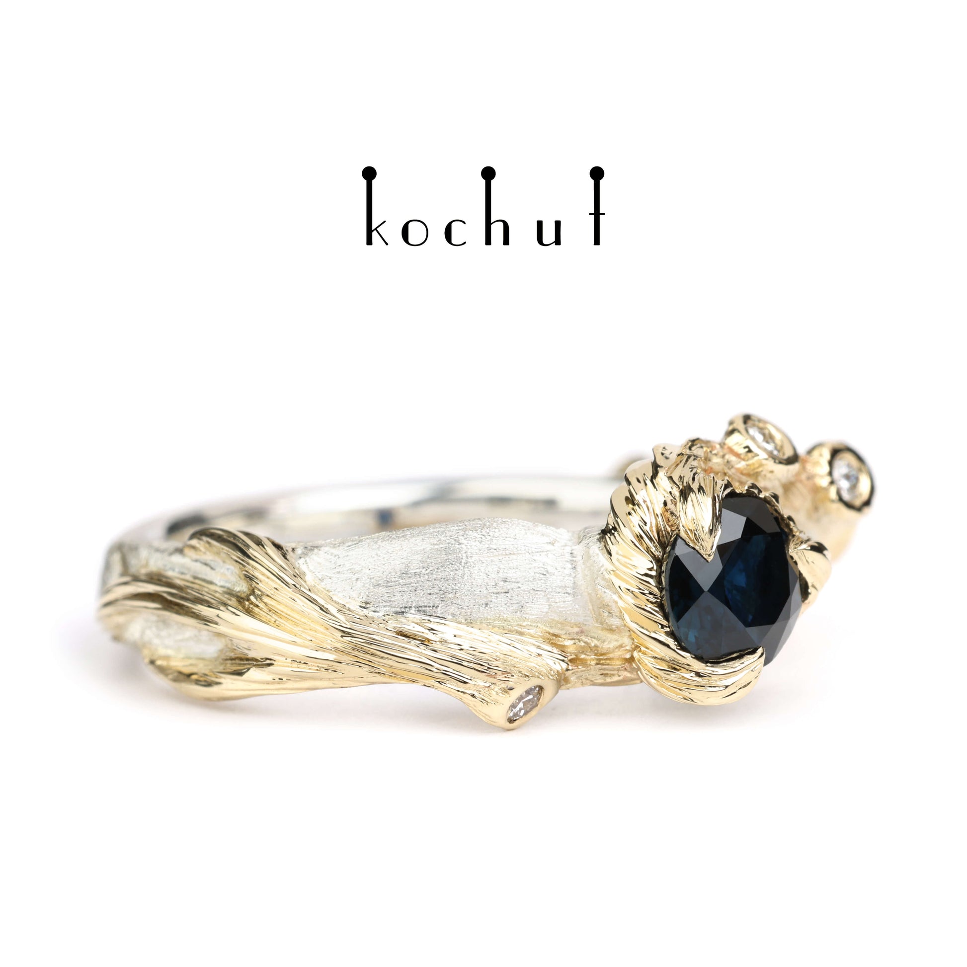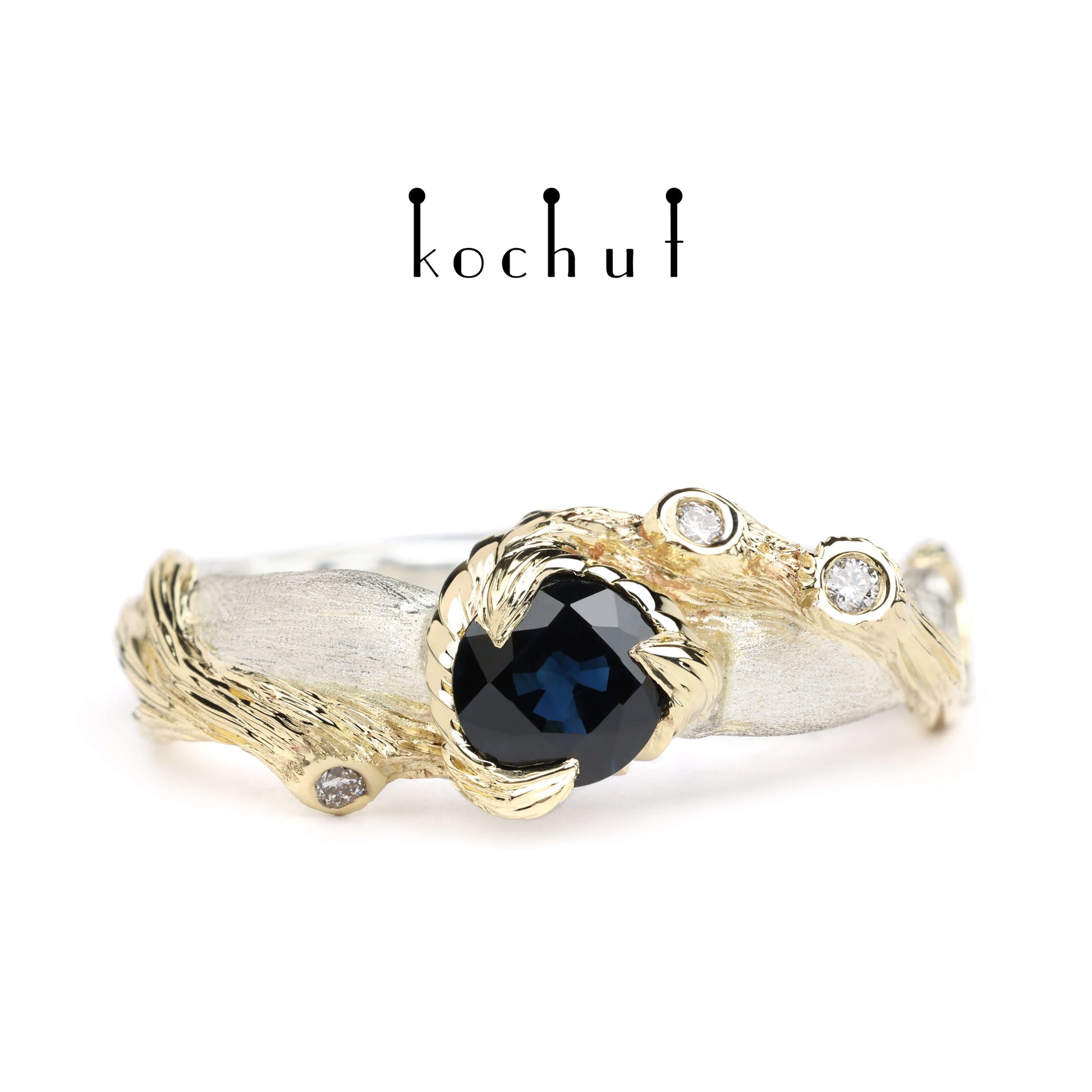Der Ring ist aus Silber gefertigt, mit Zweigen aus Gelbgold überzogen. Die Schönheit des Meeresreichs offenbart einen luxuriösen Saphir. Kleine Diamanten verstecken sich an den Enden der Zweige, wie kleine Tautropfen im sonnigen Ozean.