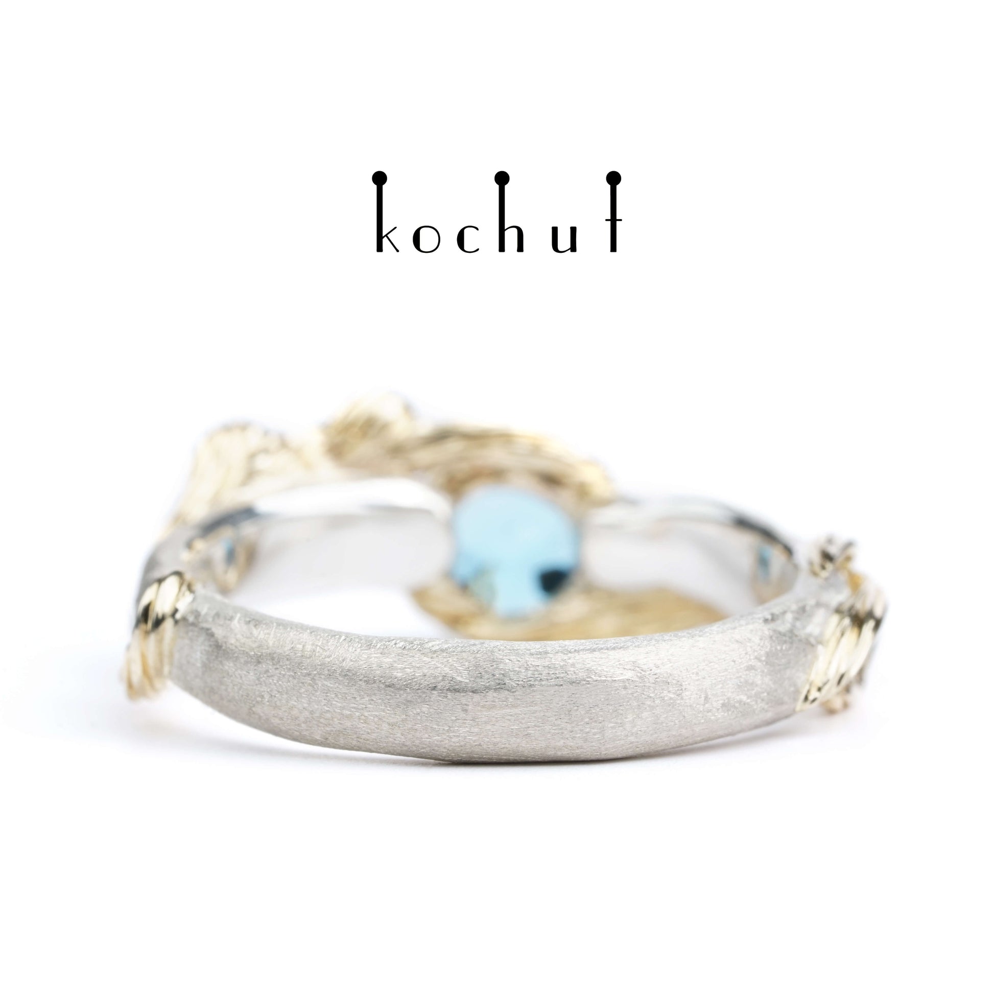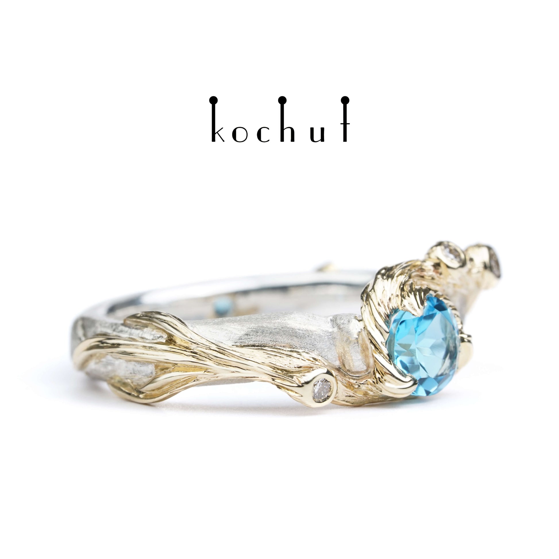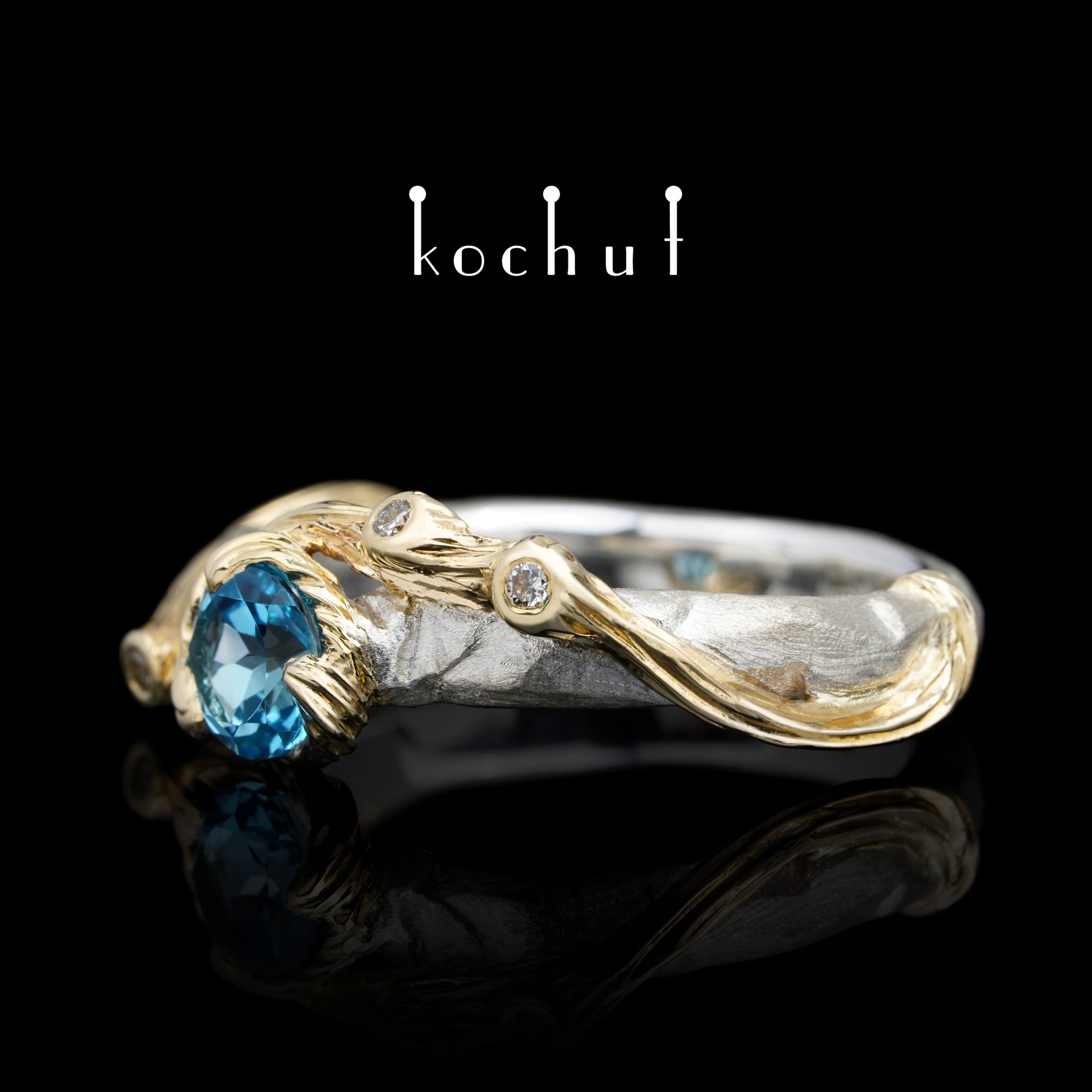 Der Ring ist aus Silber gefertigt, mit Zweigen aus Gelbgold bedeckt. Die Schönheit des Ozeanreichs offenbart einen schönen Topas. Winzige Diamanten verstecken sich an den Enden der Zweige, wie kleine Tautropfen im sonnigen Ozean.