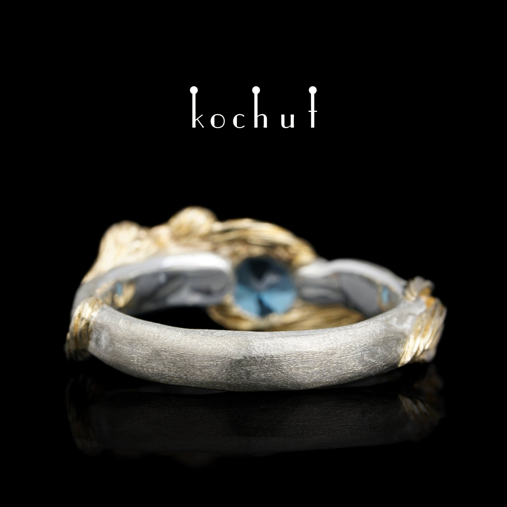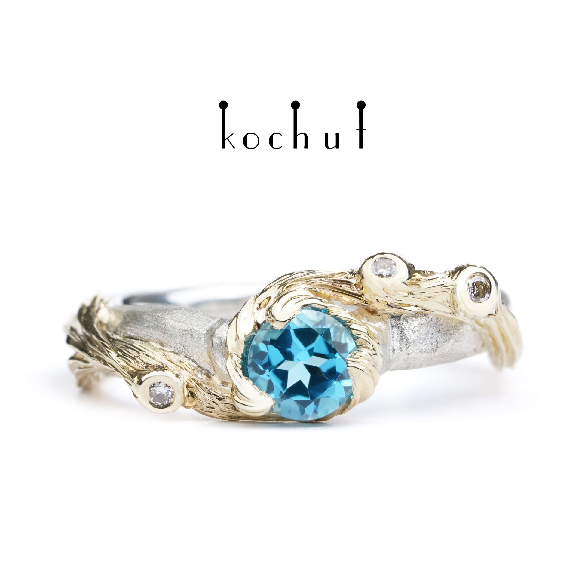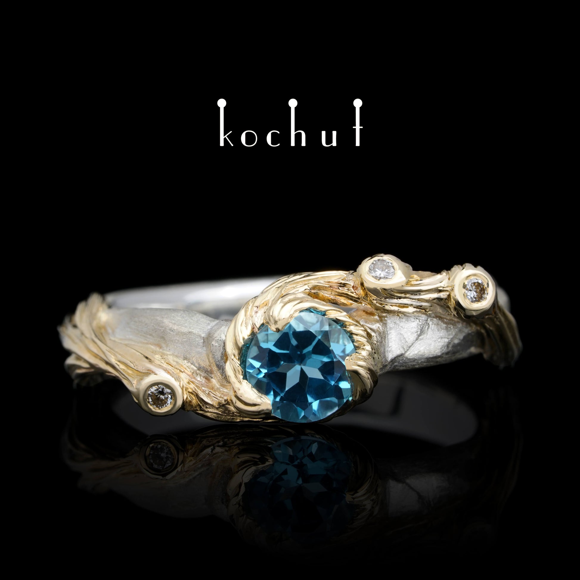 Der Ring ist aus Silber gefertigt, mit Zweigen aus Gelbgold bedeckt. Die Schönheit des Ozeanreichs offenbart einen schönen Topas. Winzige Diamanten verstecken sich an den Enden der Zweige, wie kleine Tautropfen im sonnigen Ozean.
