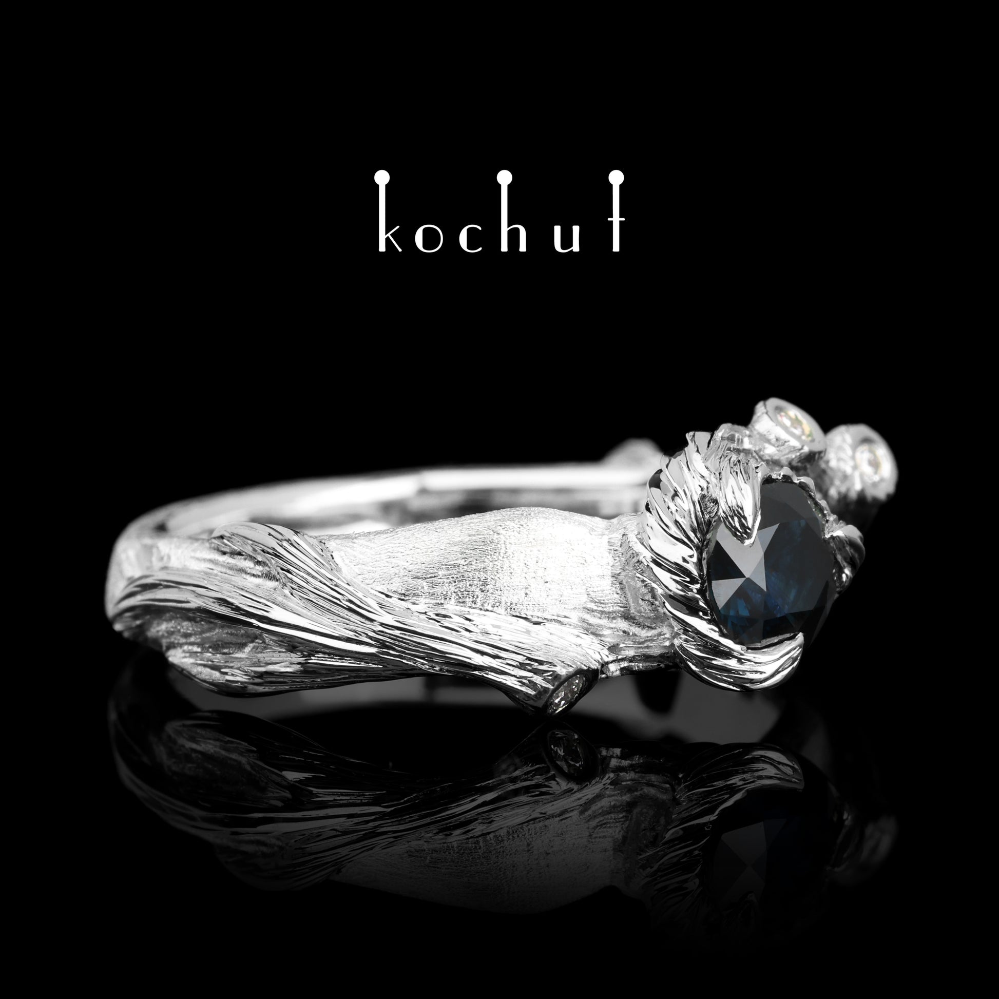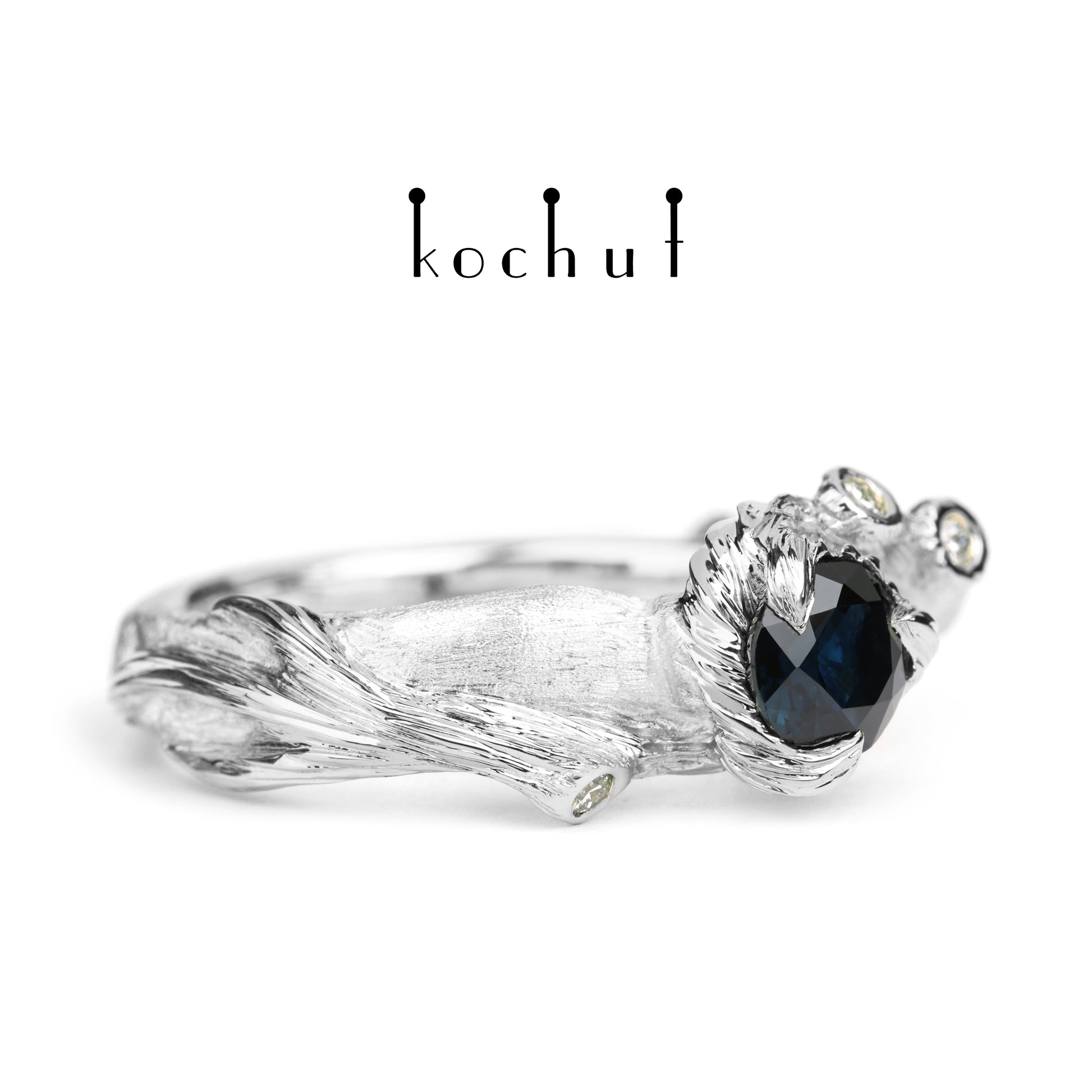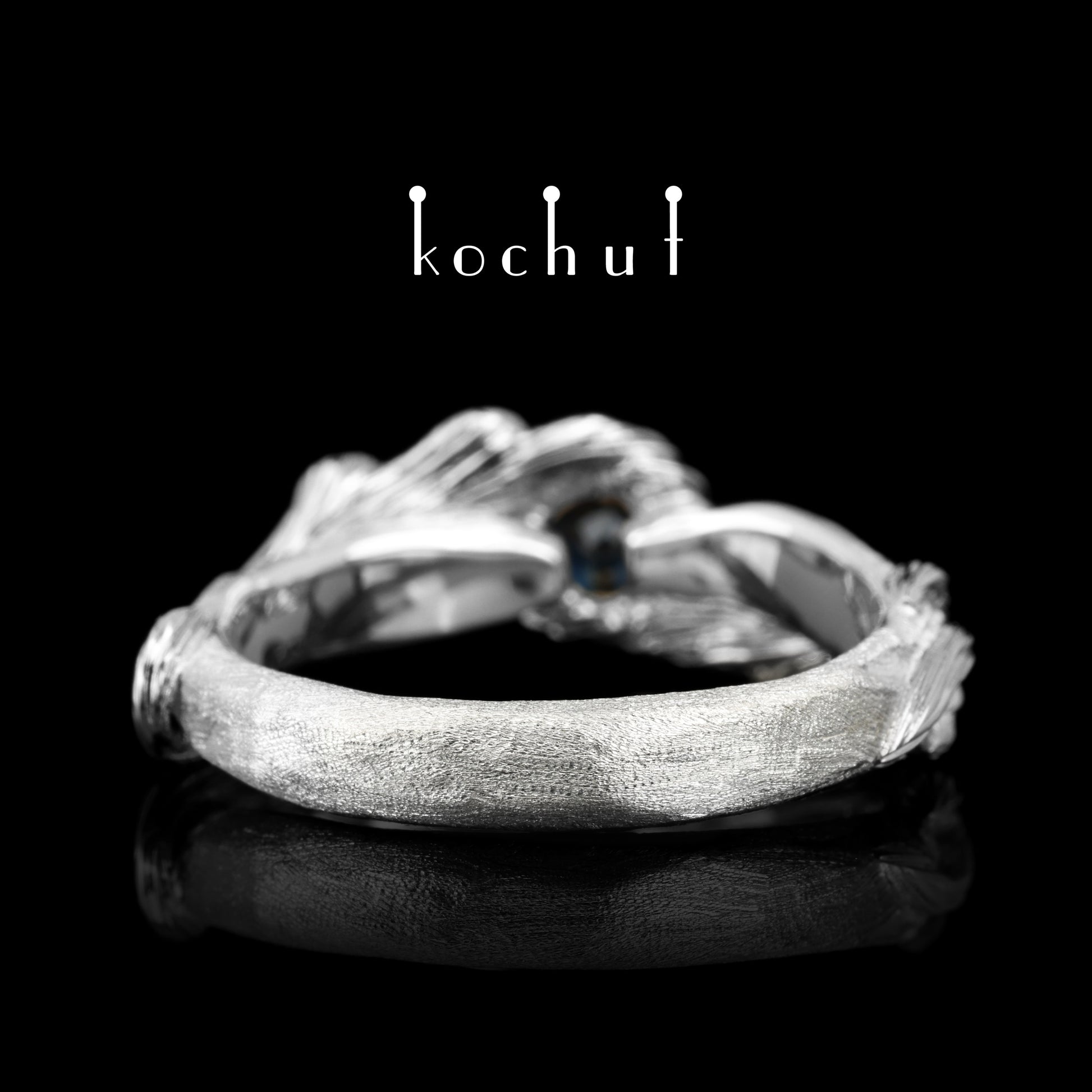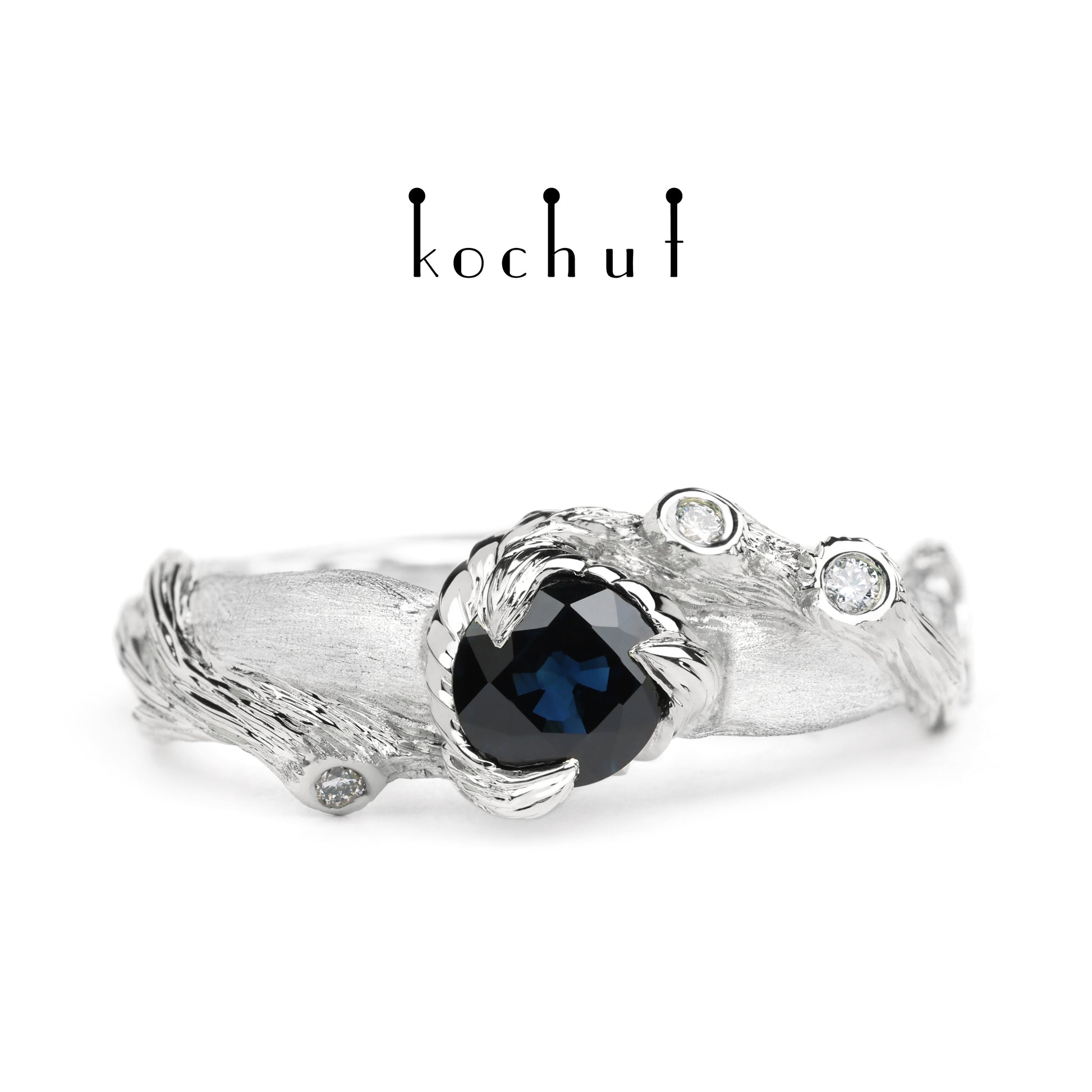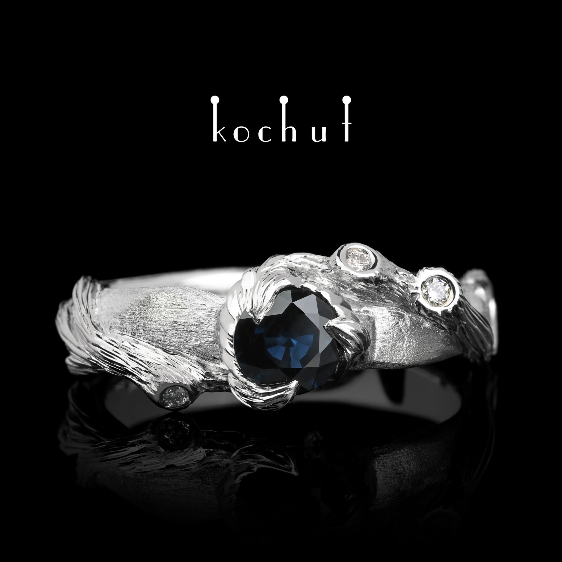Der Ring ist aus Weißgold gefertigt. Die Schönheit des Meeresreichs offenbart einen luxuriösen Saphir. Kleine Diamanten verstecken sich an den Enden der Zweige, wie kleine Tautropfen im sonnigen Ozean.
