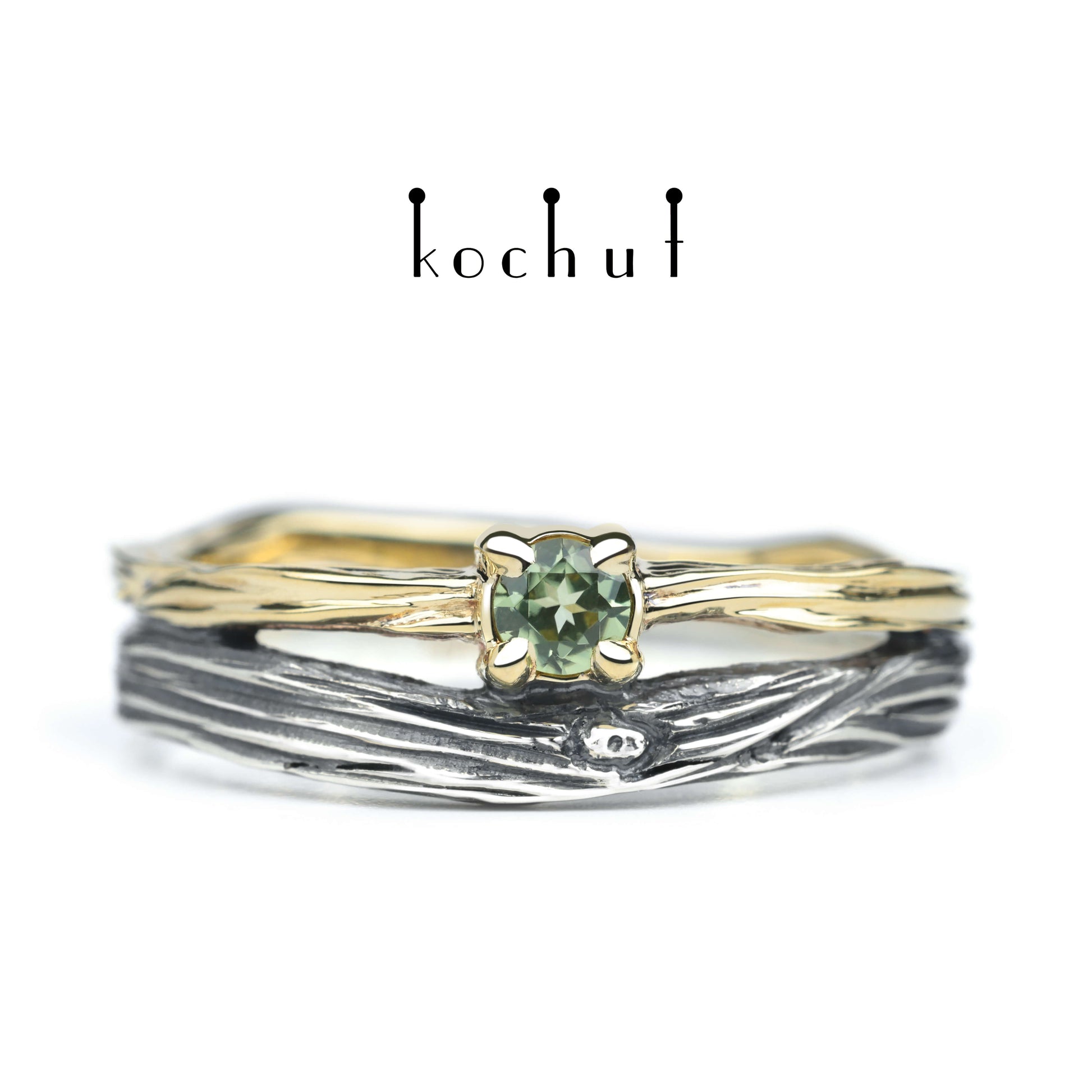 Auge des Waldes — Ehering aus oxidiertem Silber und Gelbgold mit Chrysolith