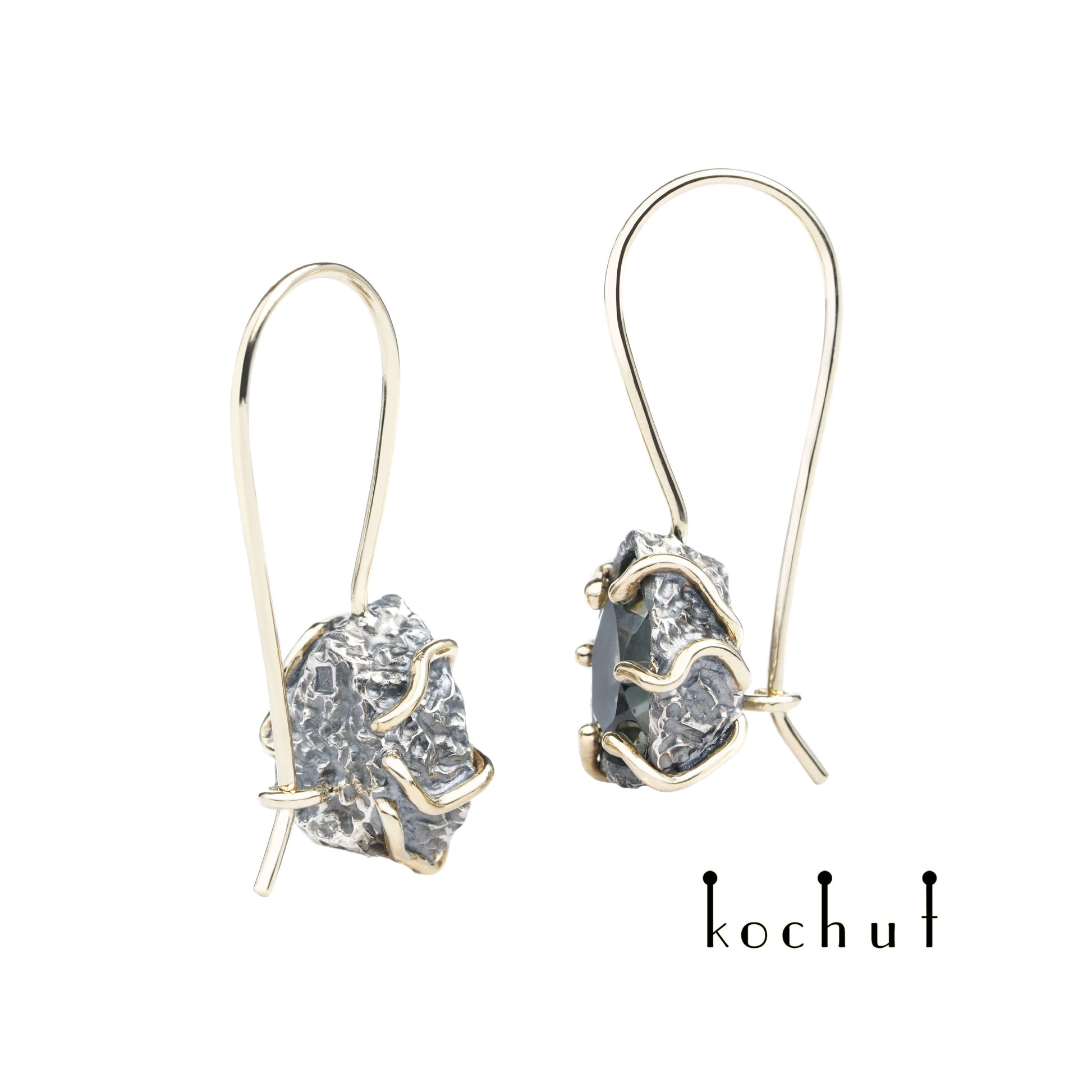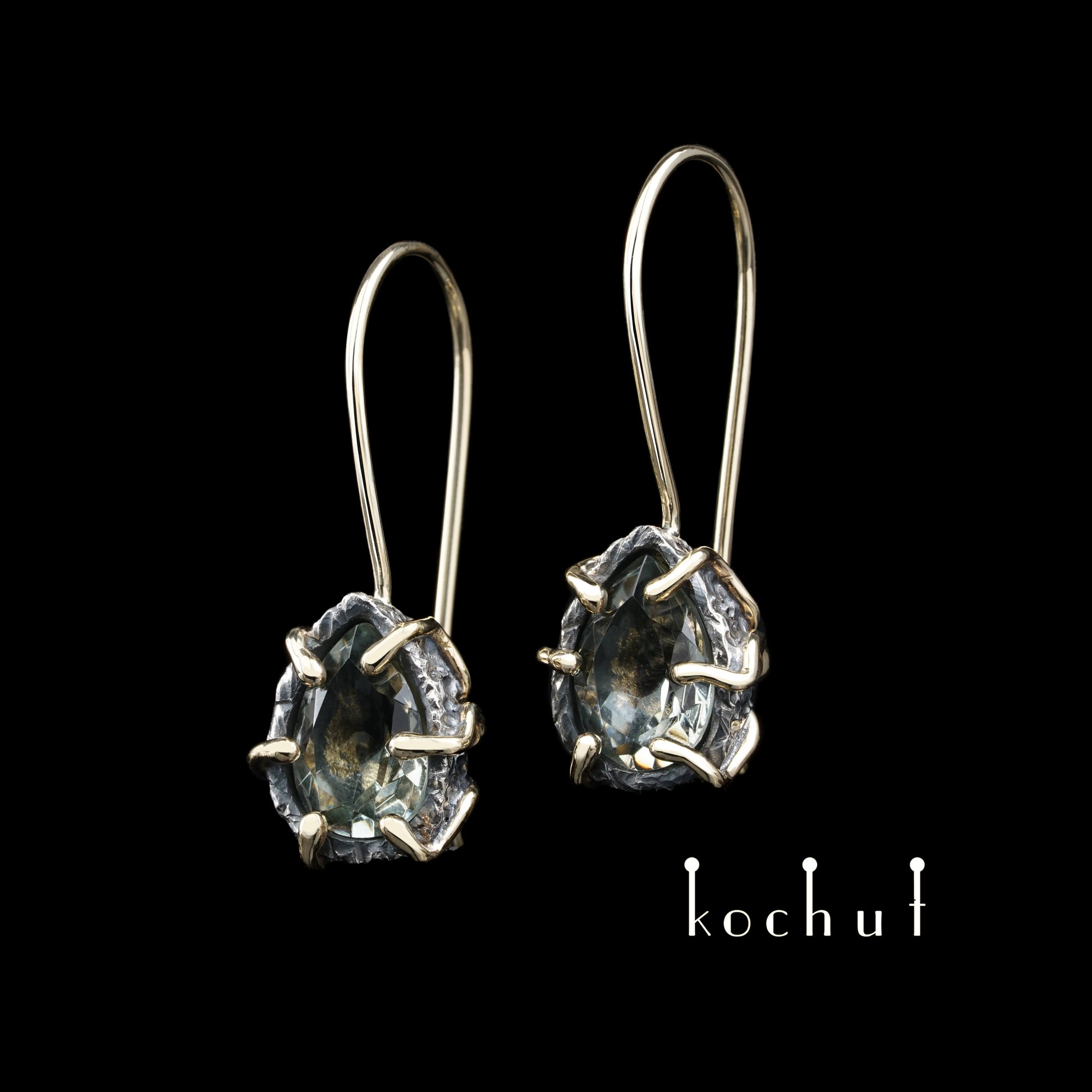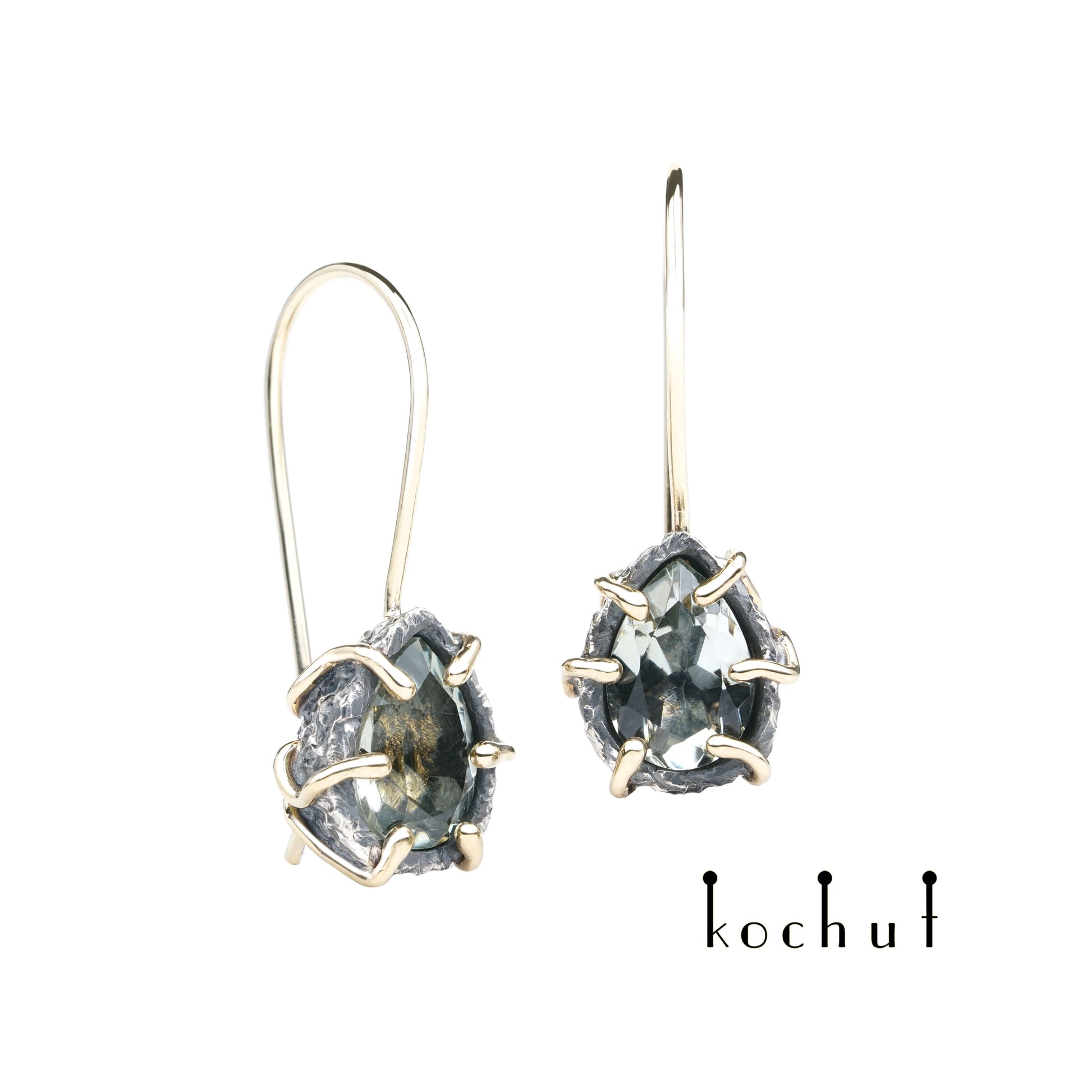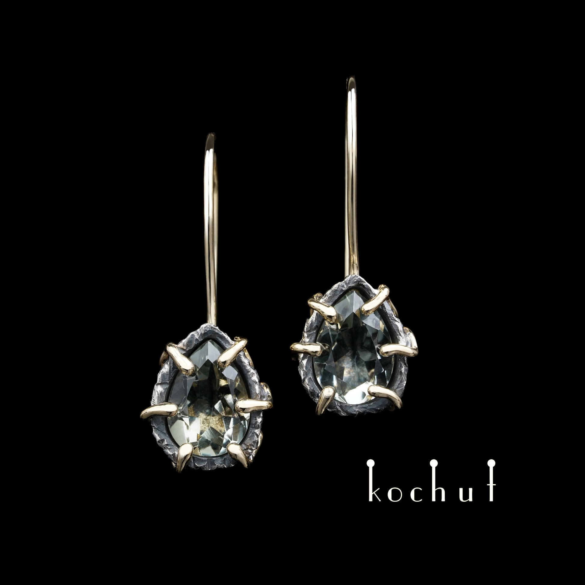 Aurora — Ohrringe aus oxidiertem Silber und Gelbgold mit grünen Amethysten