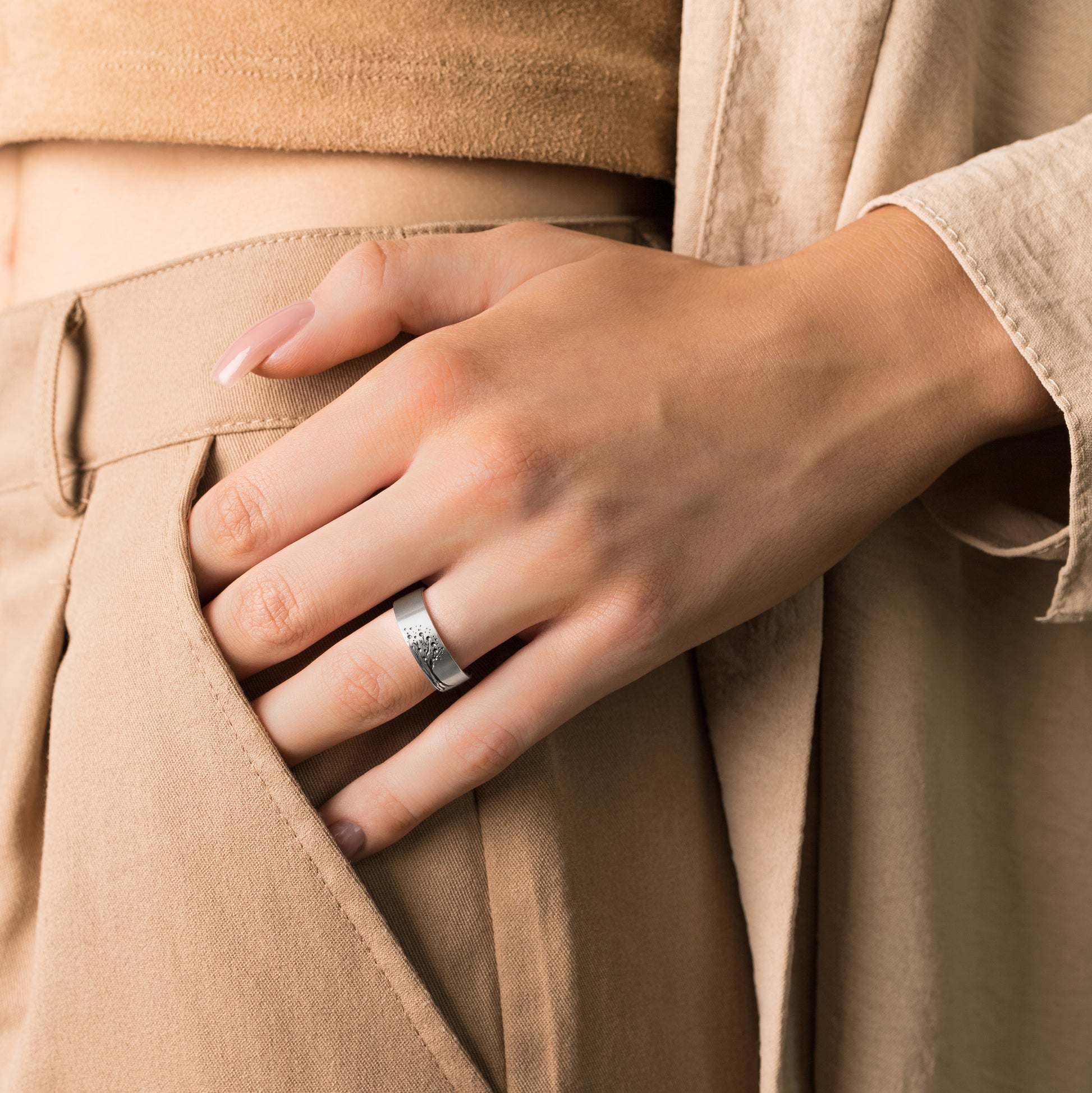 Der bezaubernde „Baum des Lebens“ Ehering ist aus Silber gefertigt.