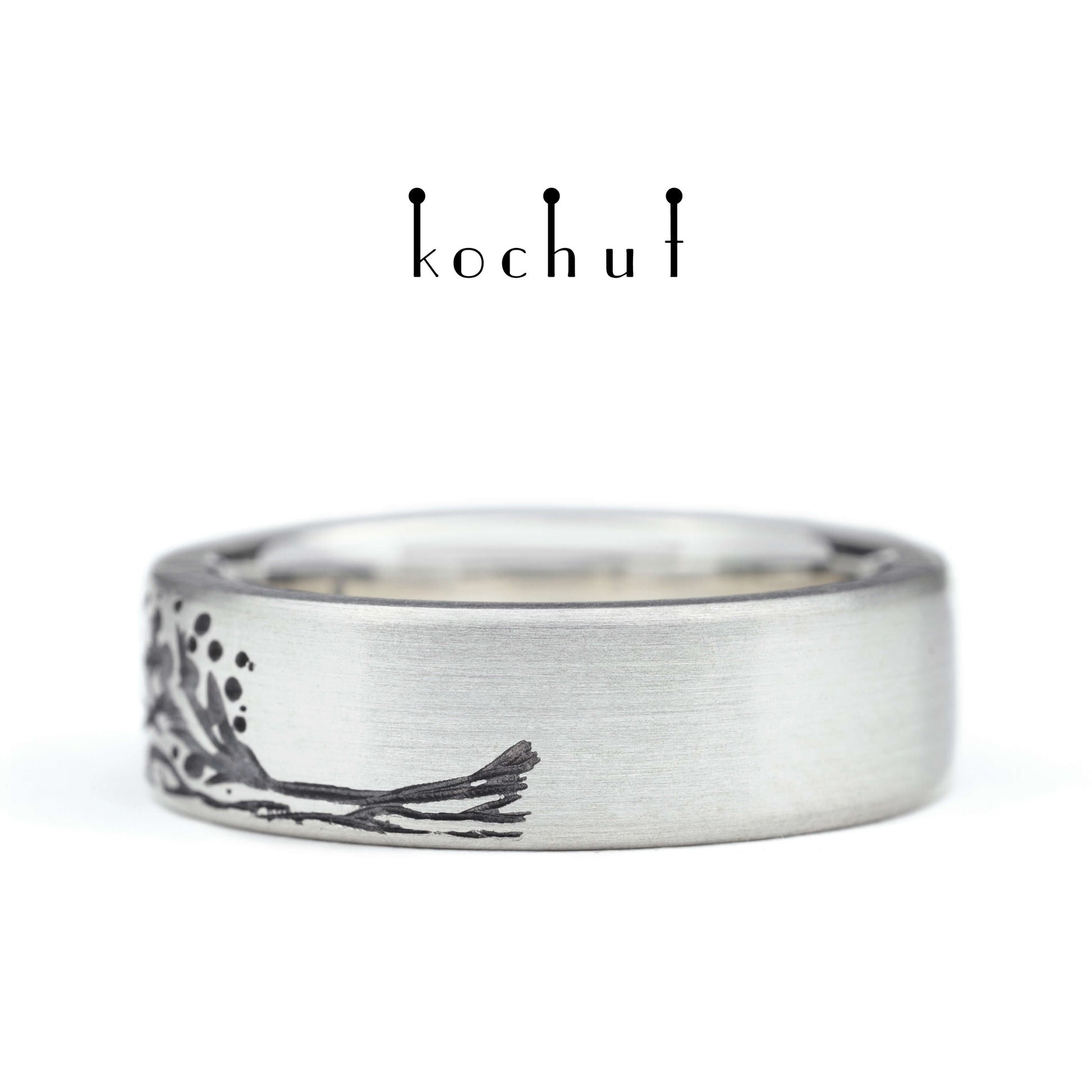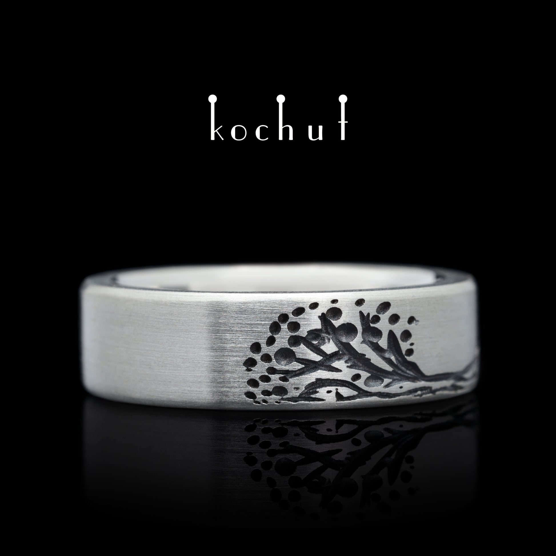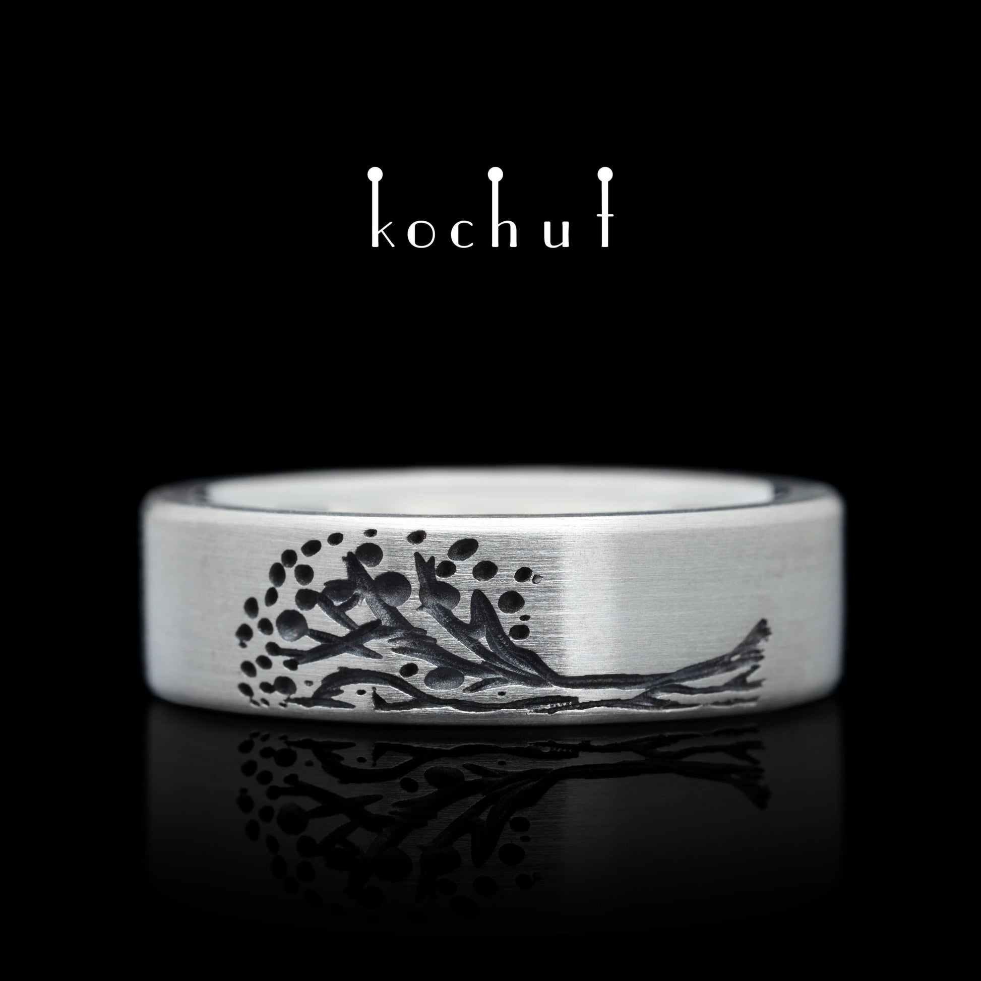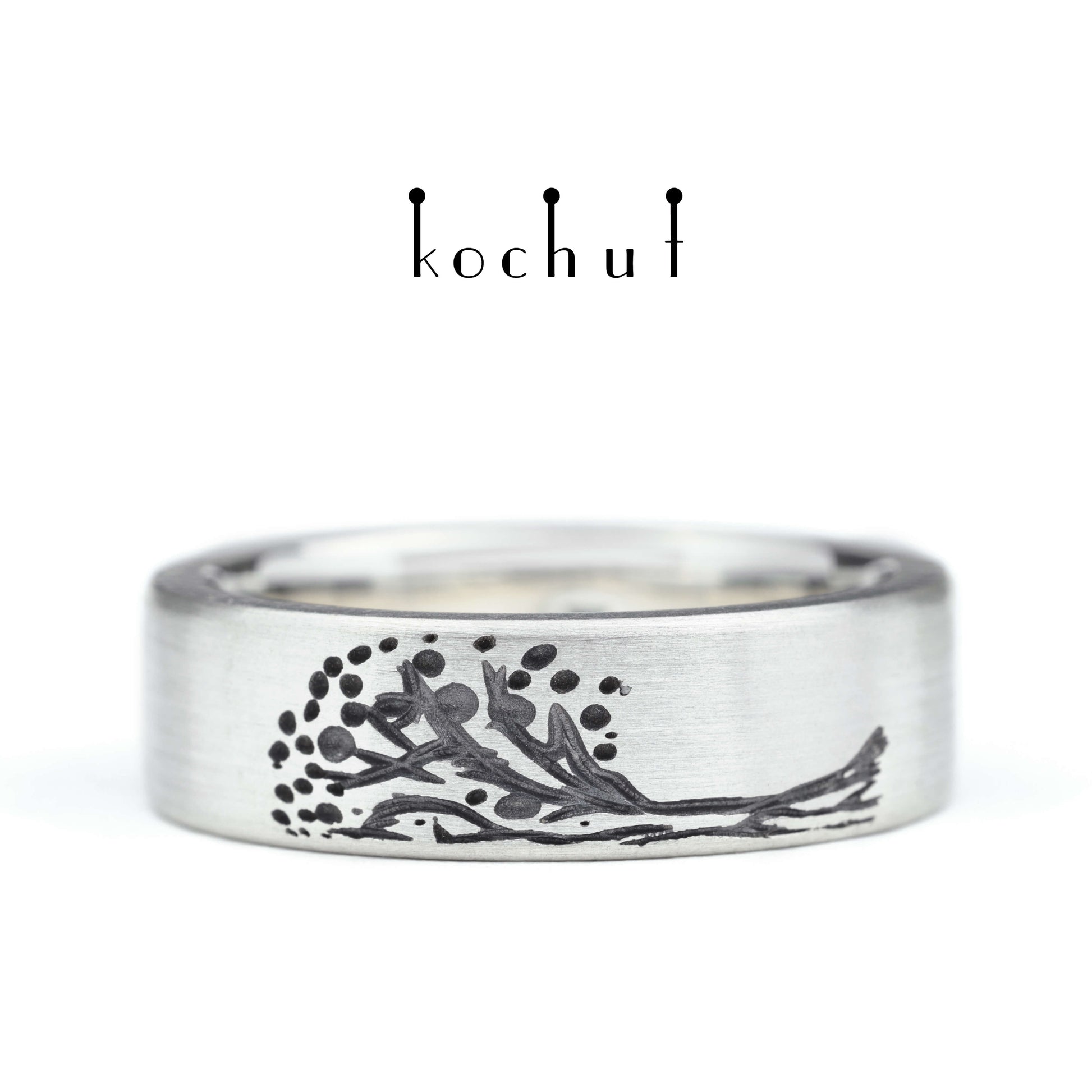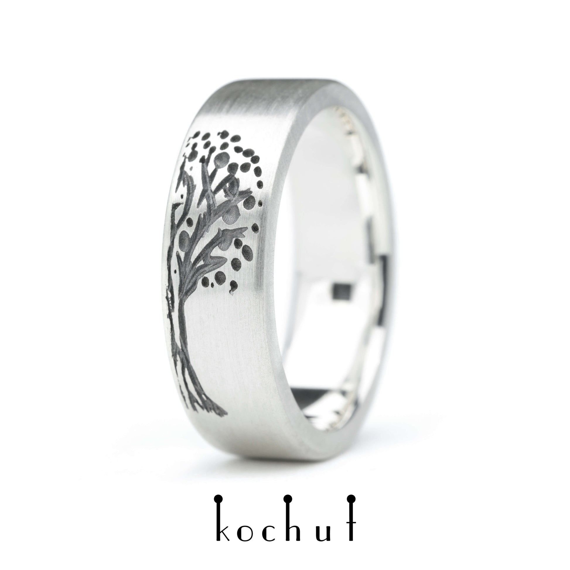 Dieser Ehering stammt aus unserer Kollektion, die direkt mit dem Baum des Lebens verbunden ist. Er spielte eine bedeutende Rolle in unserer Handwerkskunst, indem er die Merkmale der Natur, den äußeren Ausdruck und die Schönheit der Linien betonte. Der Ring ist ungewöhnlich und, sagen wir, ziemlich außergewöhnlich. Man kann starke familiäre Bindungen nicht nur auf Emotionen aufbauen. Aber gemeinsame Ziele, starker Glaube aneinander, Wertschätzung der Beziehung, Zuverlässigkeit und Unterstützung — das sind die Pfeiler, die die Säulen einer erfolgreichen Ehe tragen. Und der Baum des Lebens symbolisiert diesen Aspekt des Lebens der Liebenden.