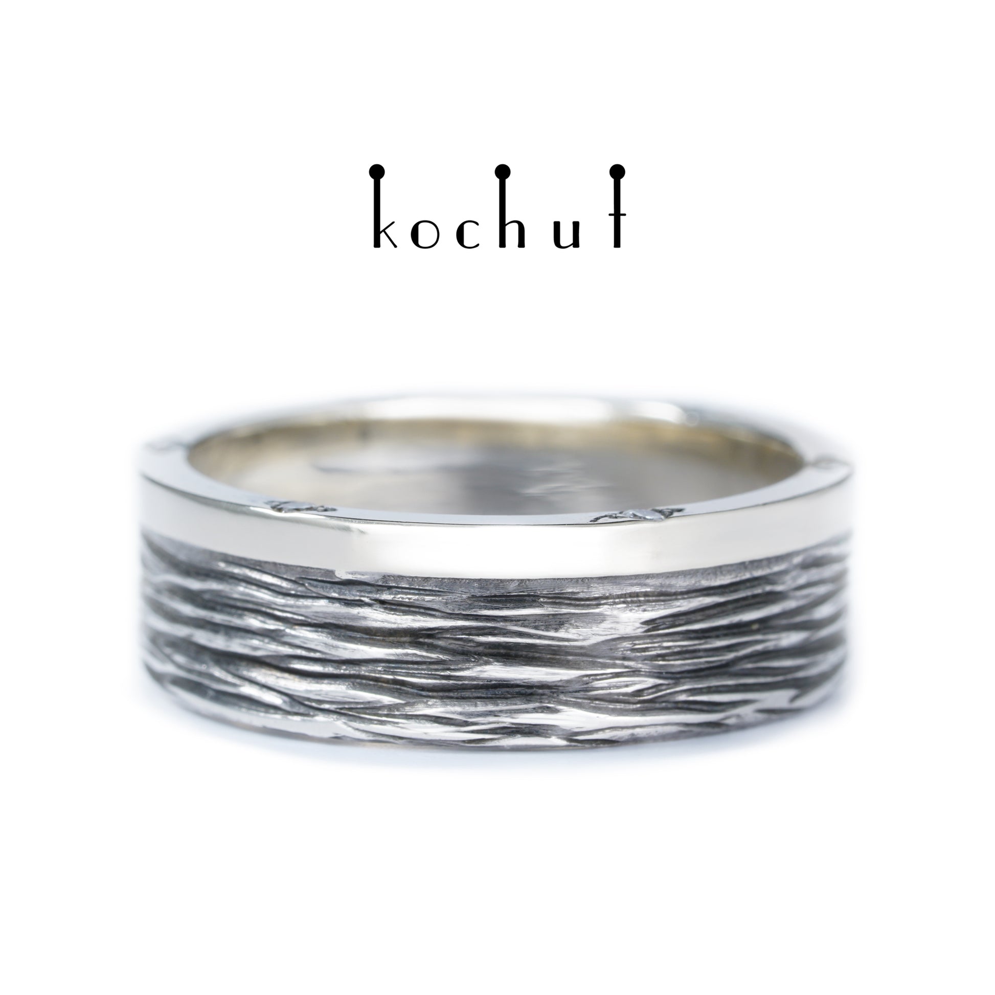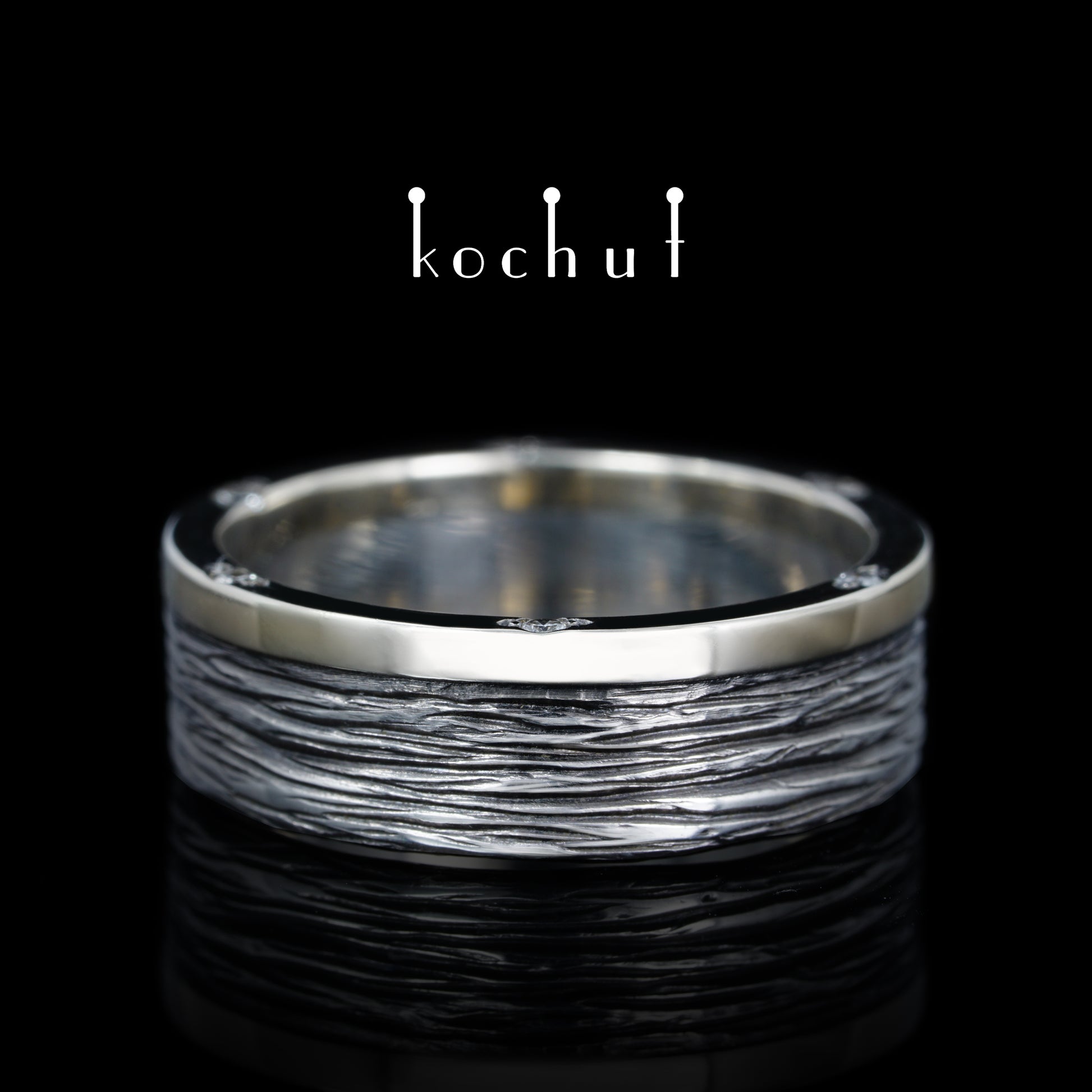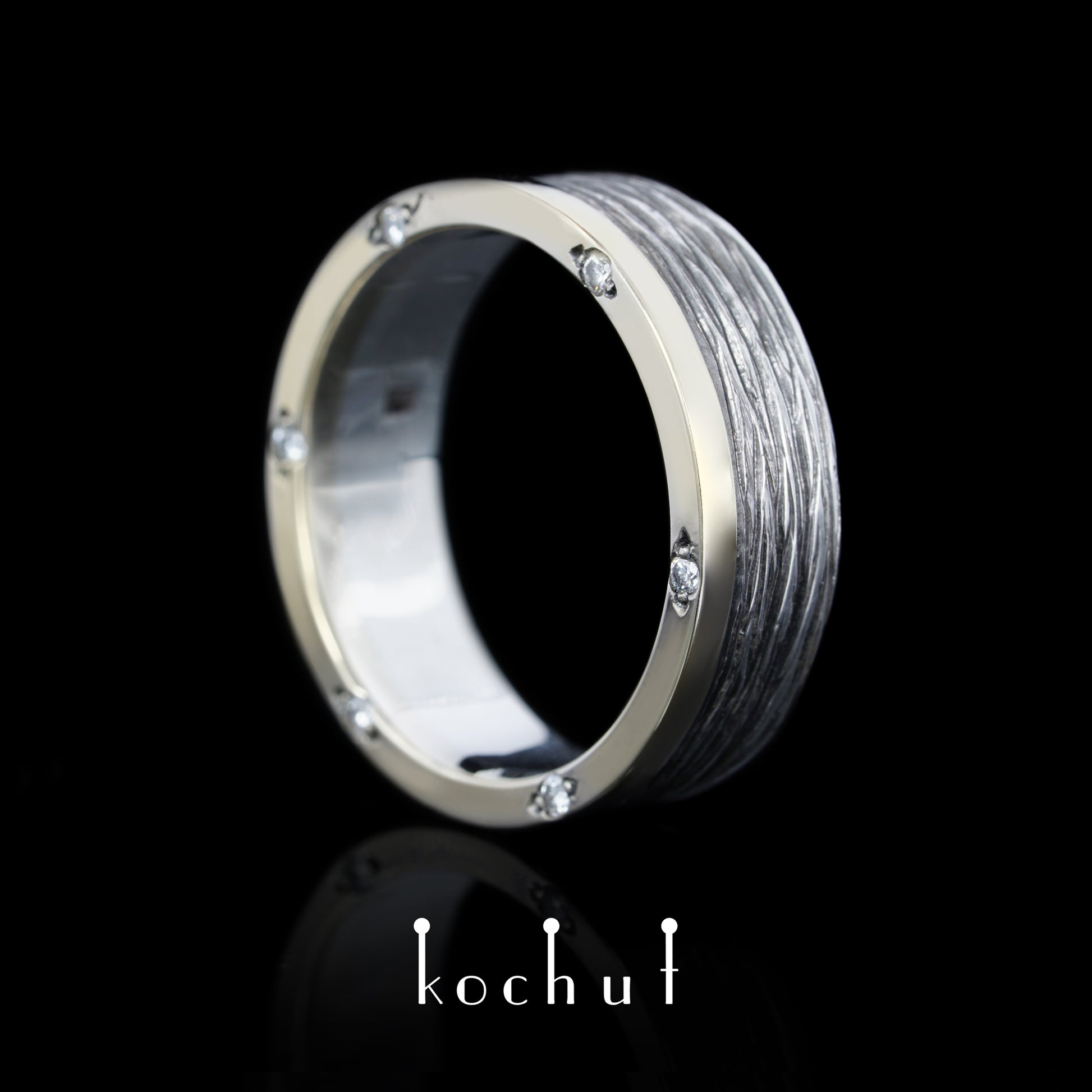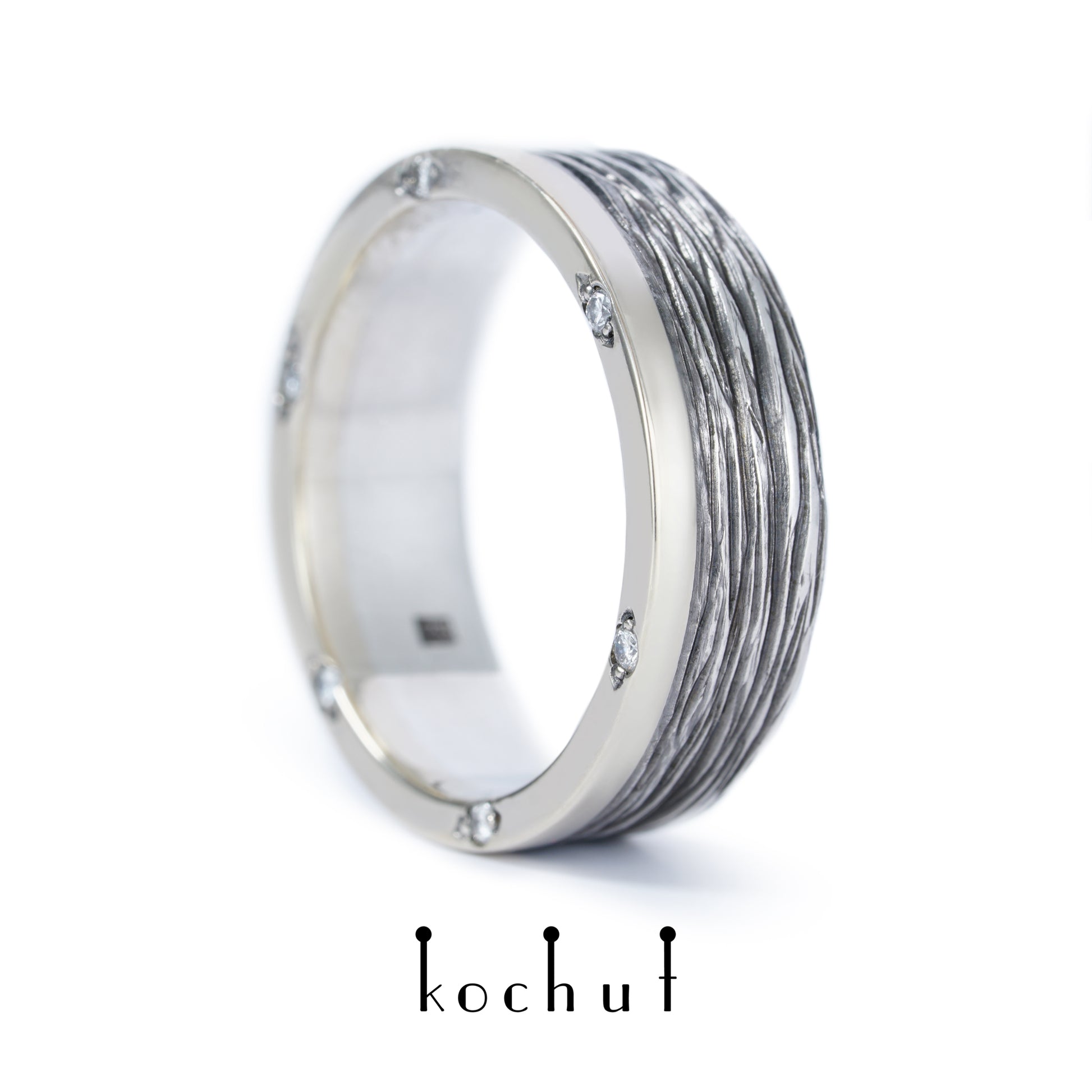 Baumrinde mit Rand— Ehering aus oxidiertem Silber, Weißgold und Diamanten