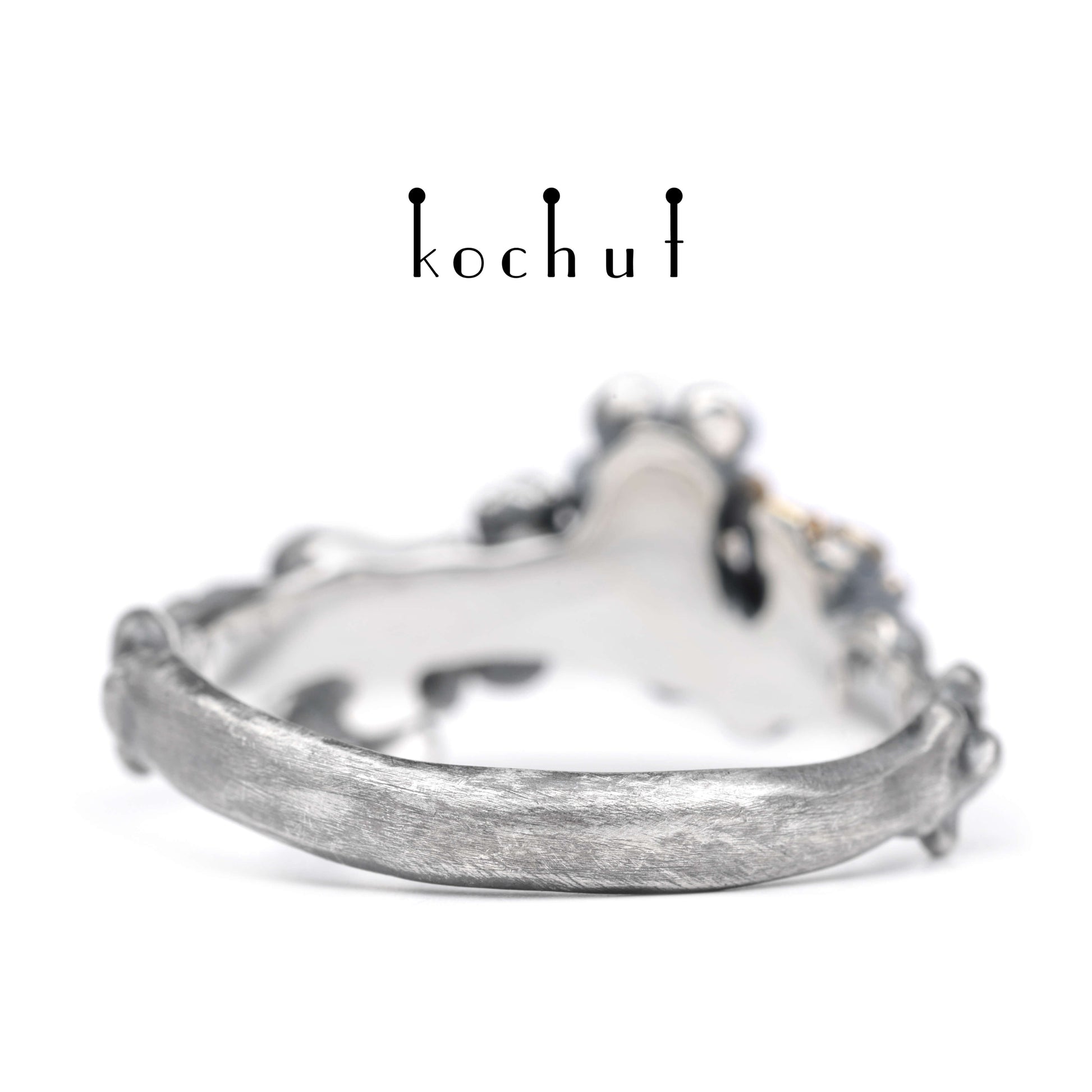 Florale Tiara — Ring aus oxidiertem Silber mit Granaten und Vergoldung