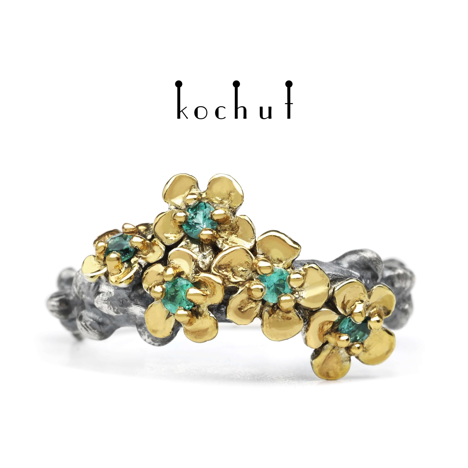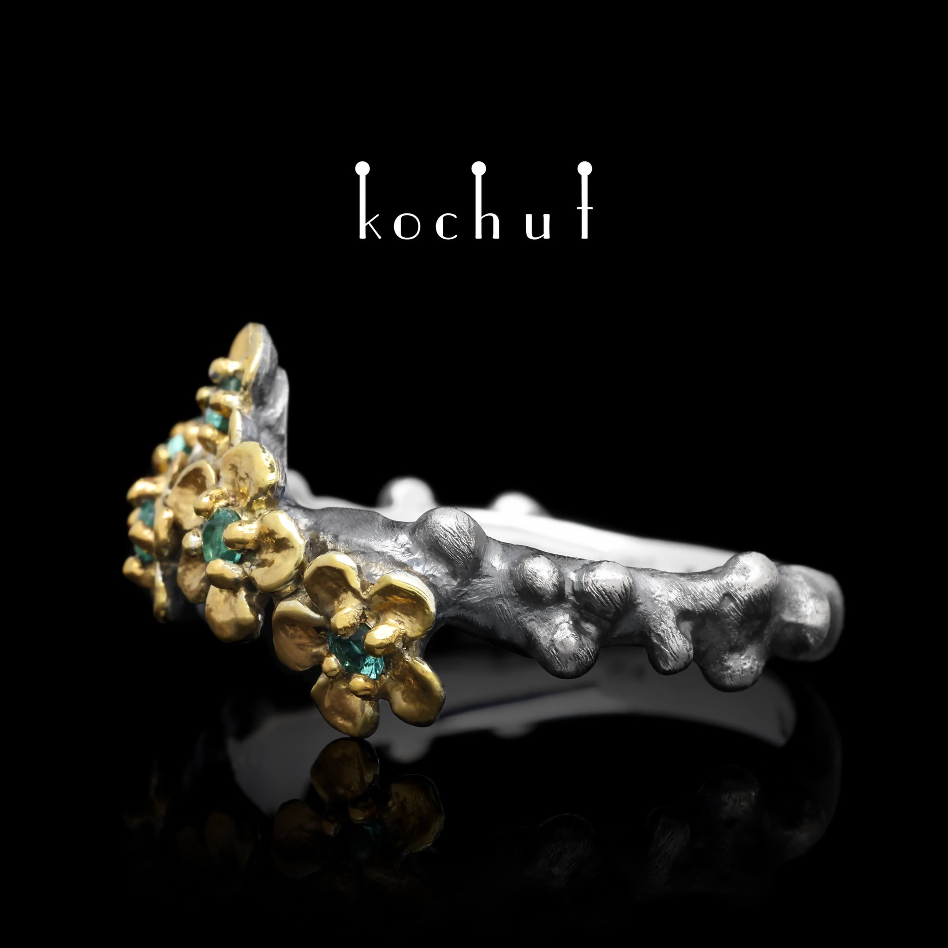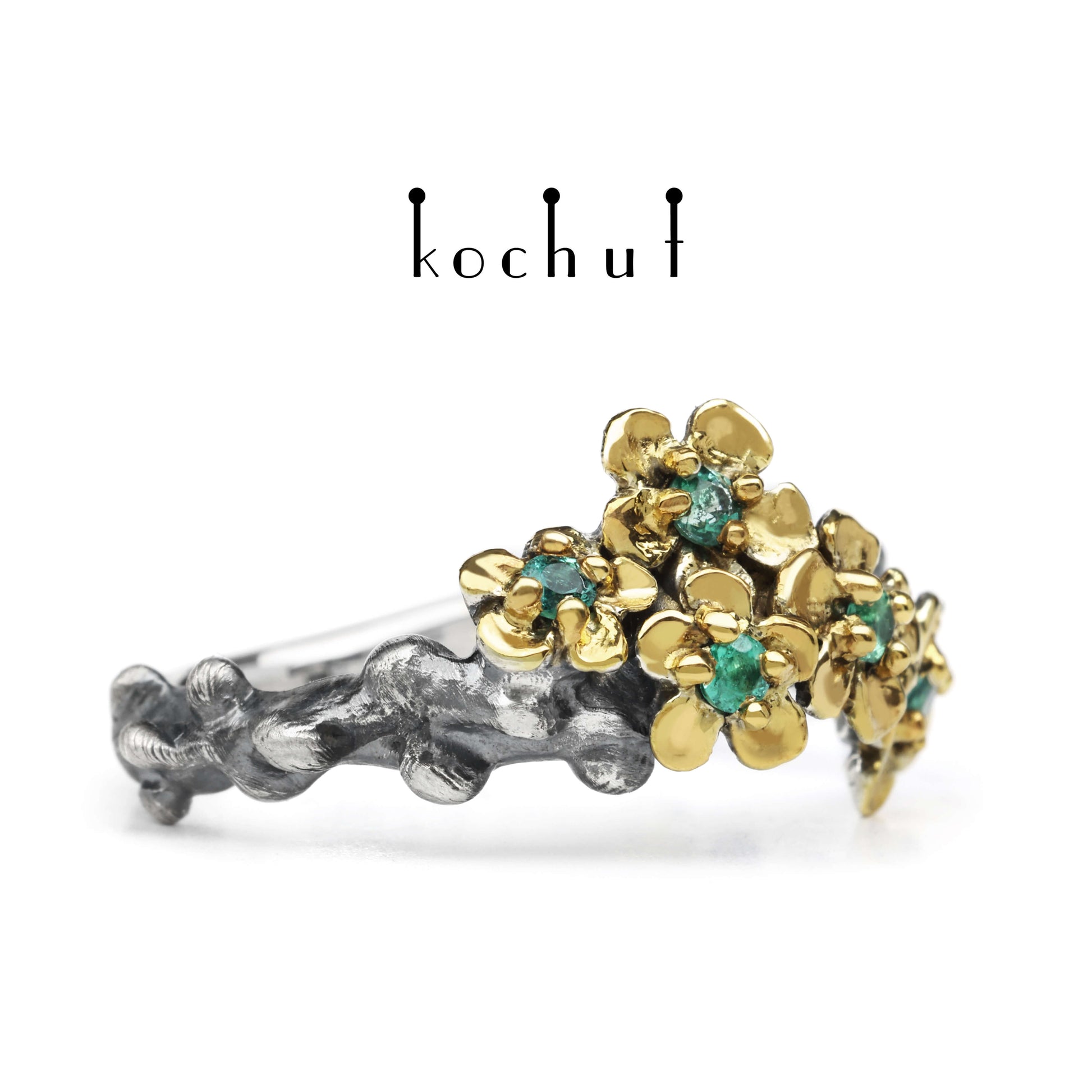 Blumenkrone — Ring aus oxidiertem Silber mit Vergoldung und Smaragden