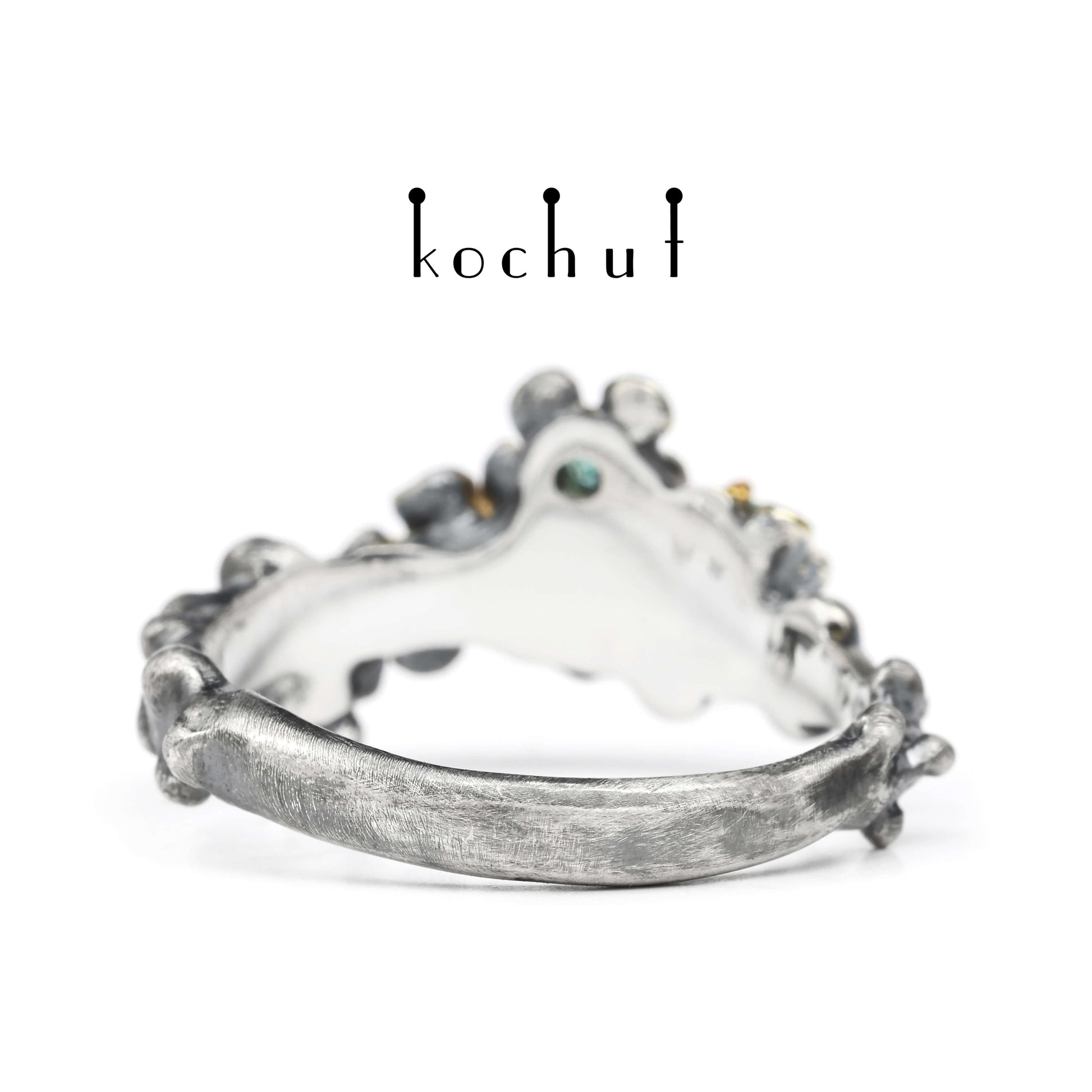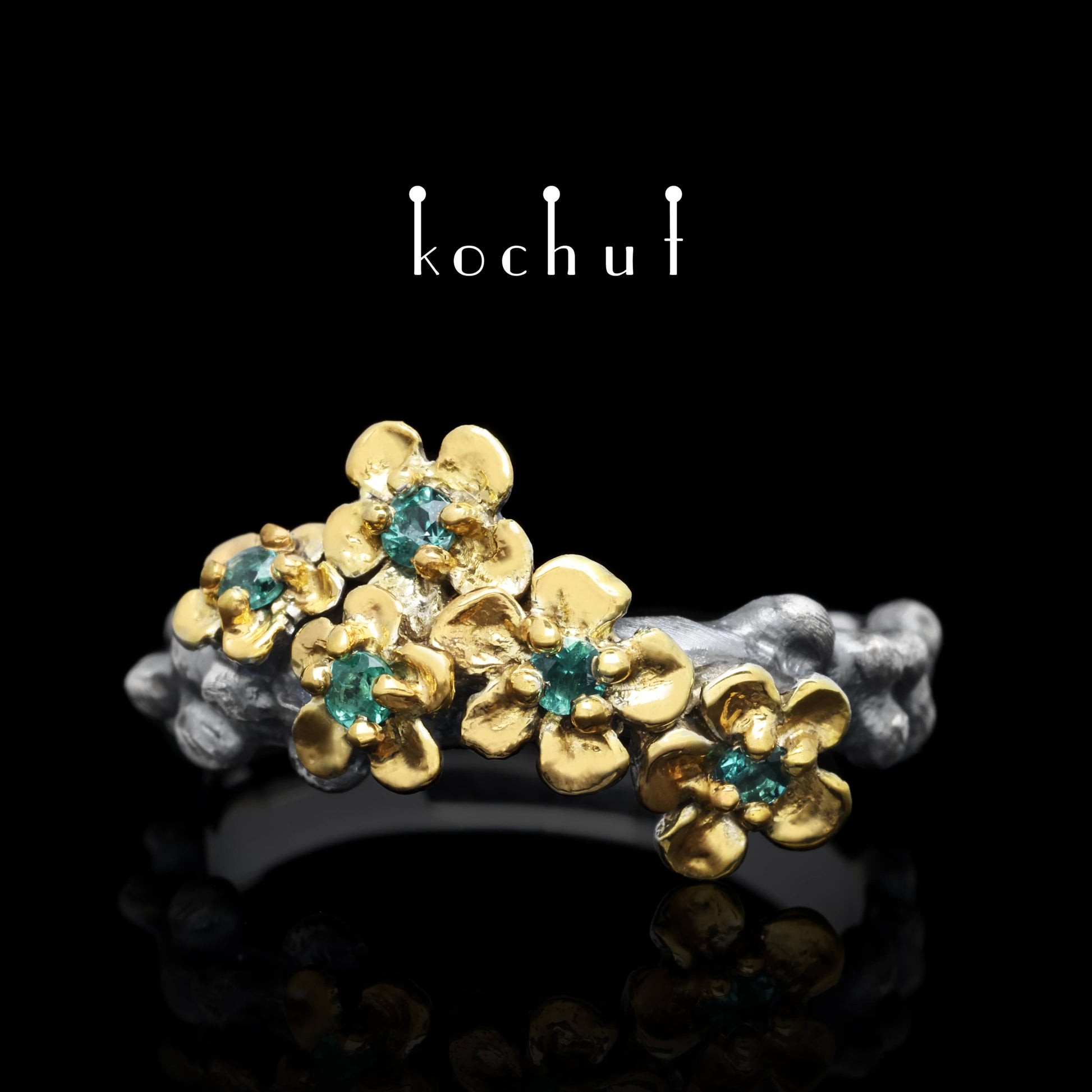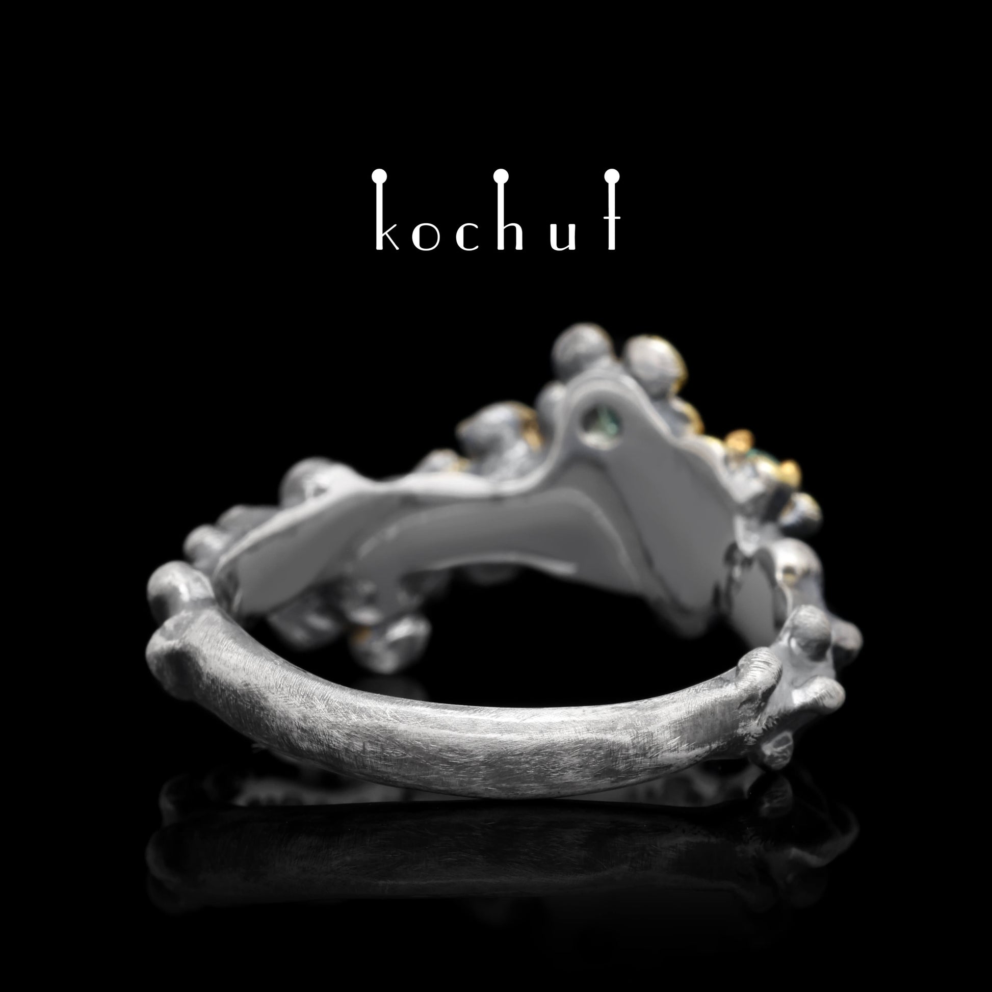 Blumenkrone — Ring aus oxidiertem Silber mit Vergoldung und Smaragden