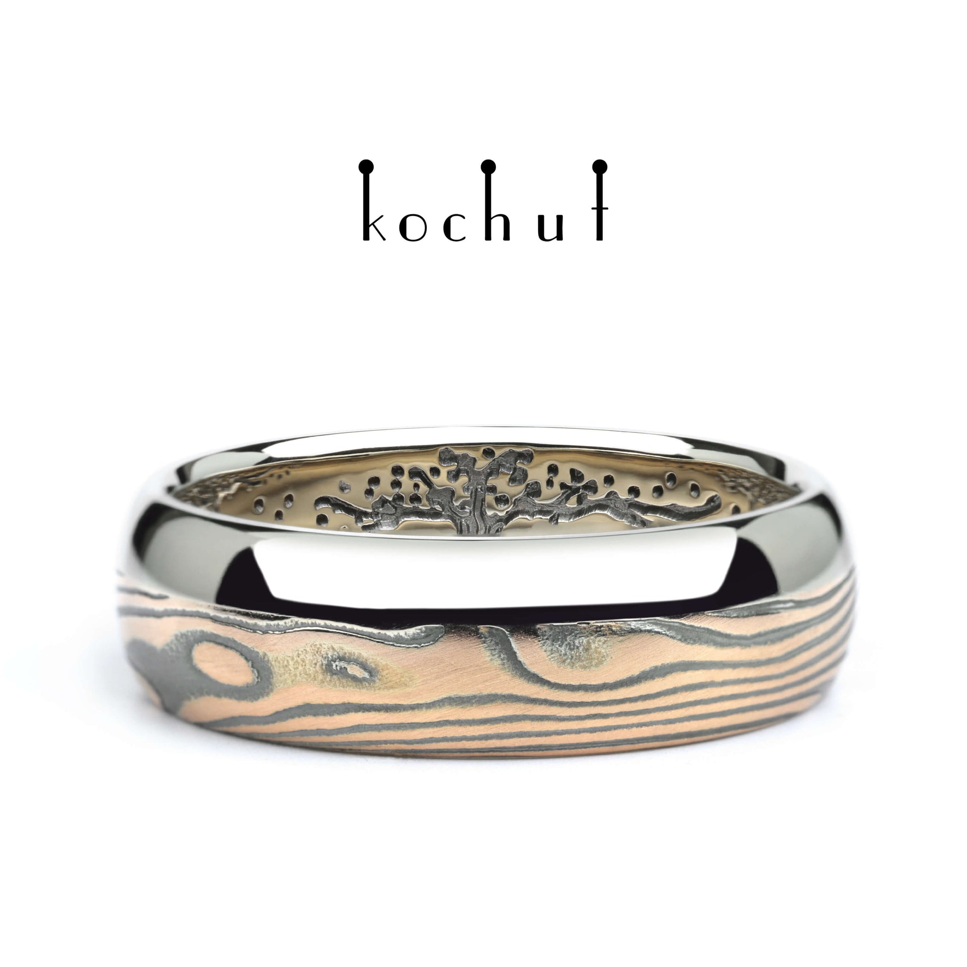 Bonsai — Mokume-Ehering aus Rotgold, Weißgold sowie graviertem und oxidiertem Silber, plattiert mit schwarzem Rhodium