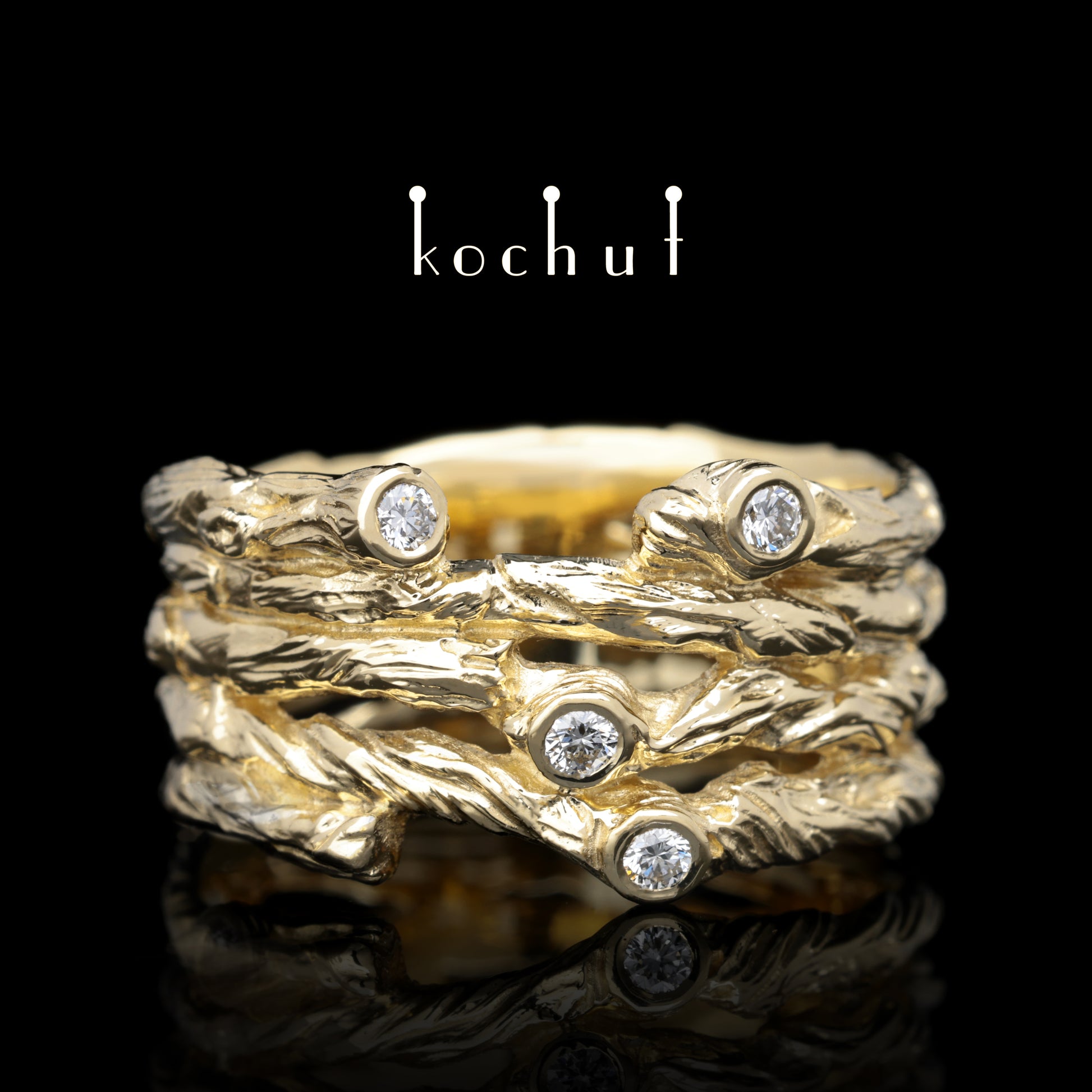 Breiter Zweig — Ring aus Gelbgold mit Diamanten