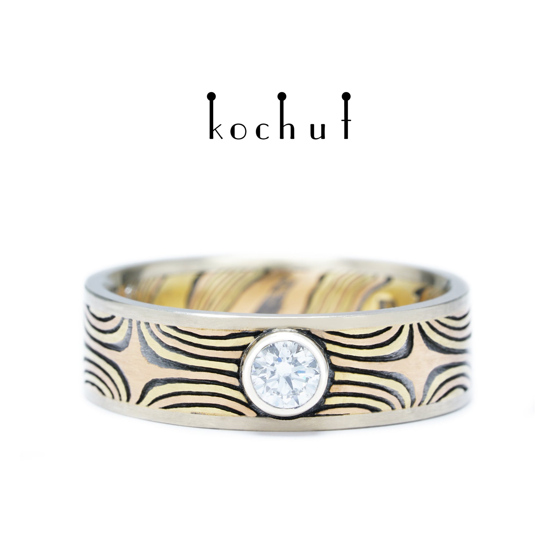 Das Leuchten der östlichen Sterne — Mokume-Ring aus Gelb-, Rotgold sowie graviertem und oxidiertem Silber mit Weißgoldfassungen, besetzt mit einem Diamanten