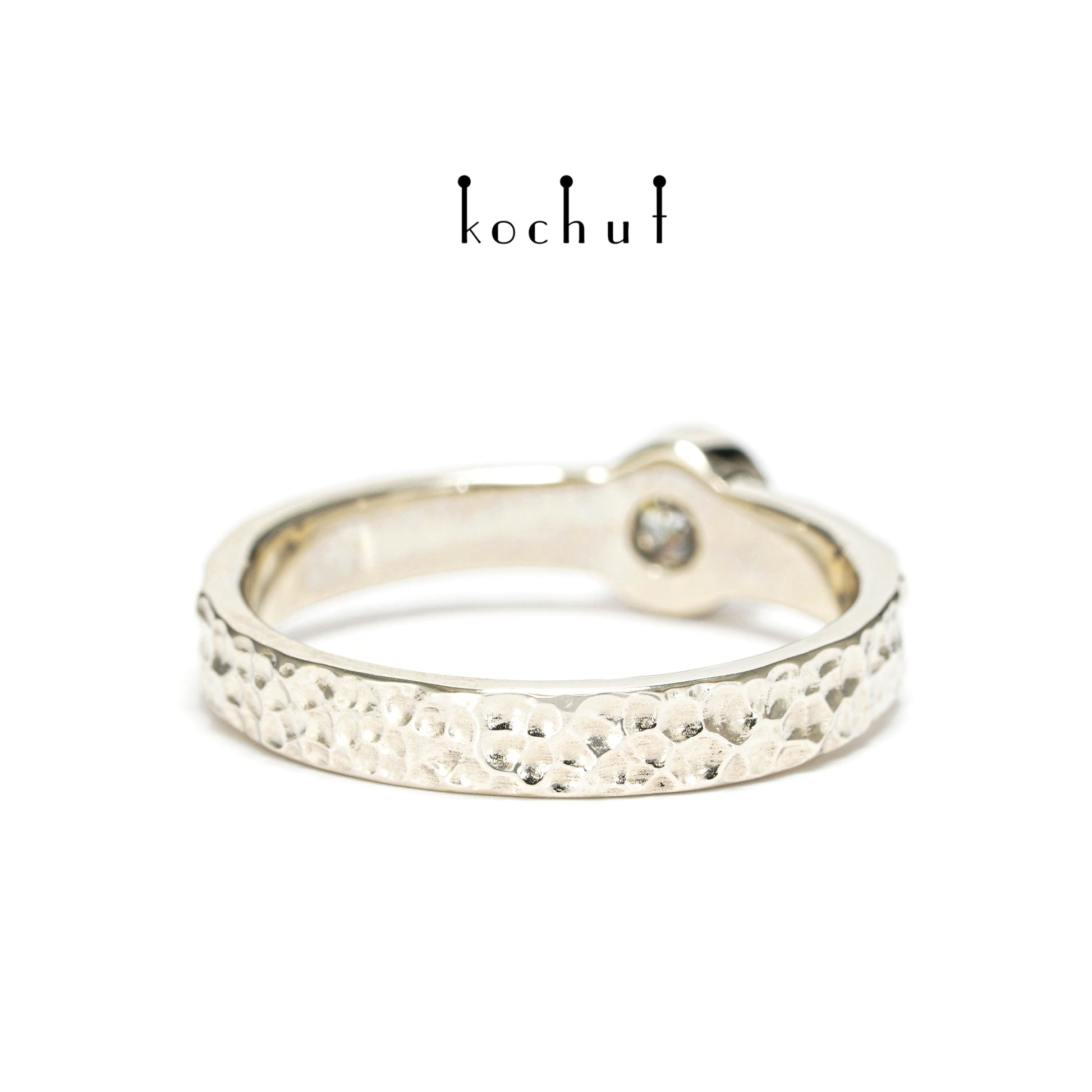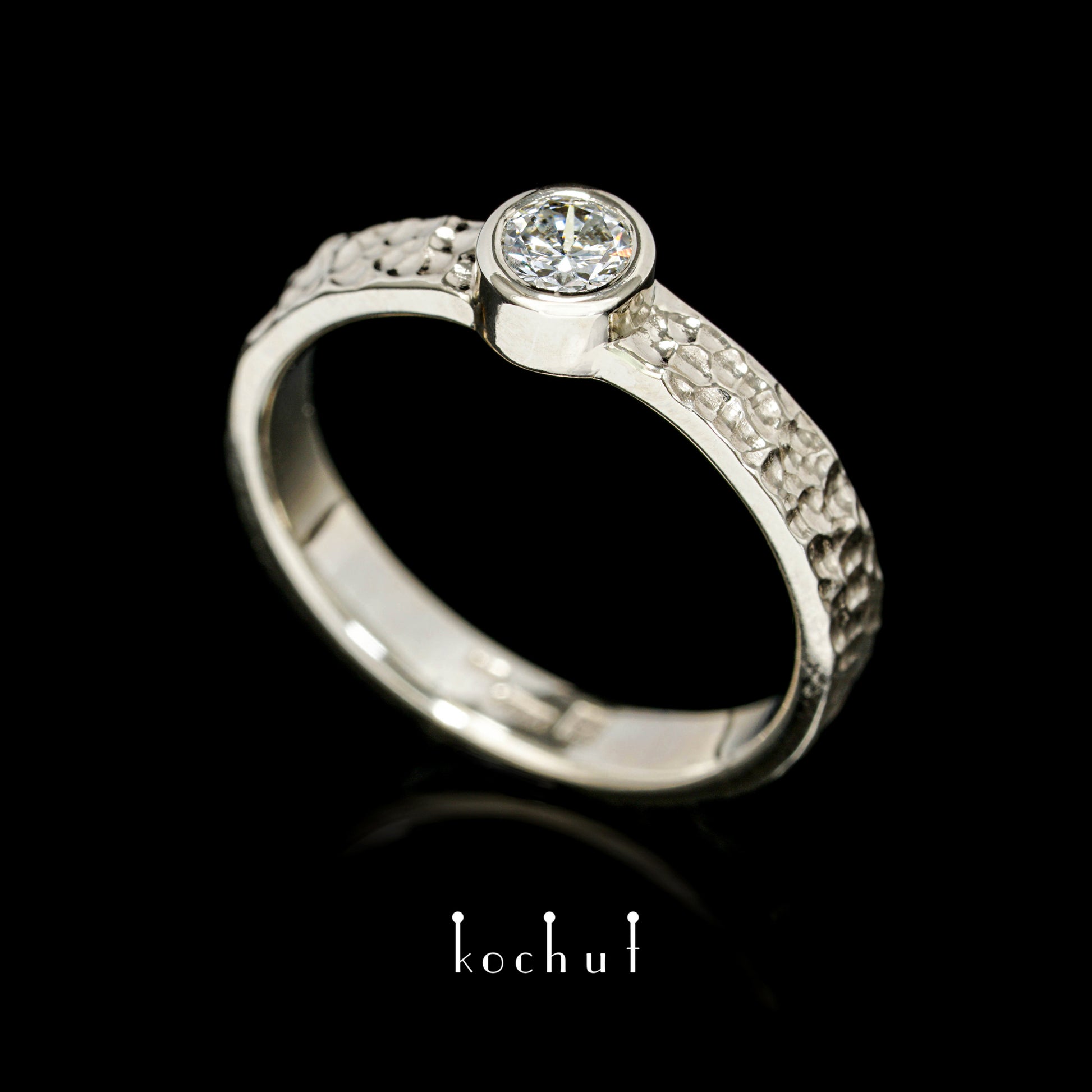 Ein wunderschöner Ring aus der Kollektion „Weg des Lebens“ ist selbst ein großartiges Beispiel für einen schwierigen Pfad. Seine Basis ist kunstvoll gefertigt mit einer authentischen Oberflächenstruktur aus Weißgold. Dies ist kein glatter Weg, sondern ein Pfad mit Hindernissen und Abwärtsschwüngen. Dennoch ist es ein großartiger Weg.
