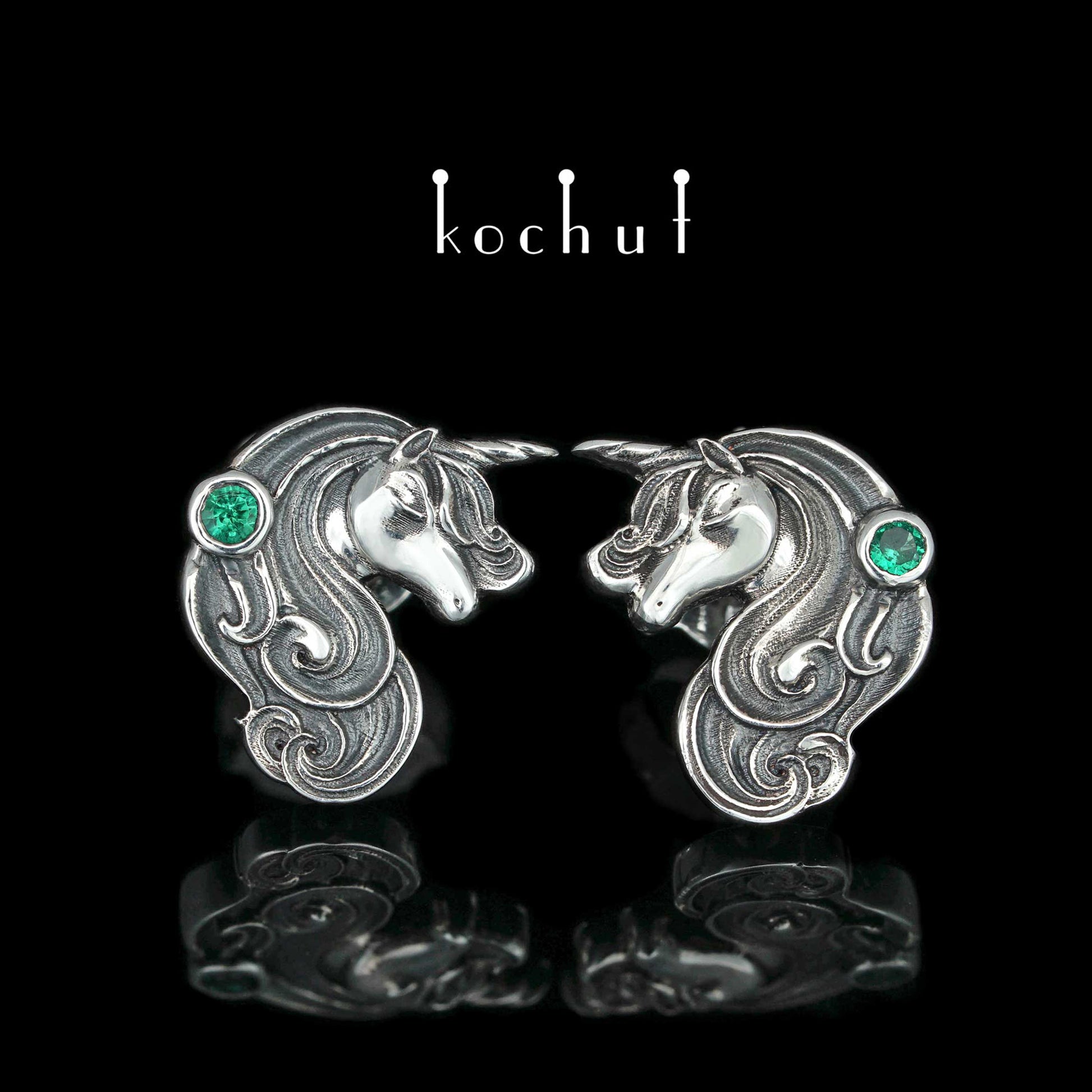 „Einhorn“ Ohrstecker sind ein vollkommen feminines Schmuckstück, das der Kraft der Zärtlichkeit jeder Frau gewidmet ist. Die Ohrringe sind aus oxidiertem Silber gefertigt. Und fabelhafte Smaragde zieren die silbernen Linien und machen den Schmuck noch bezaubernder.