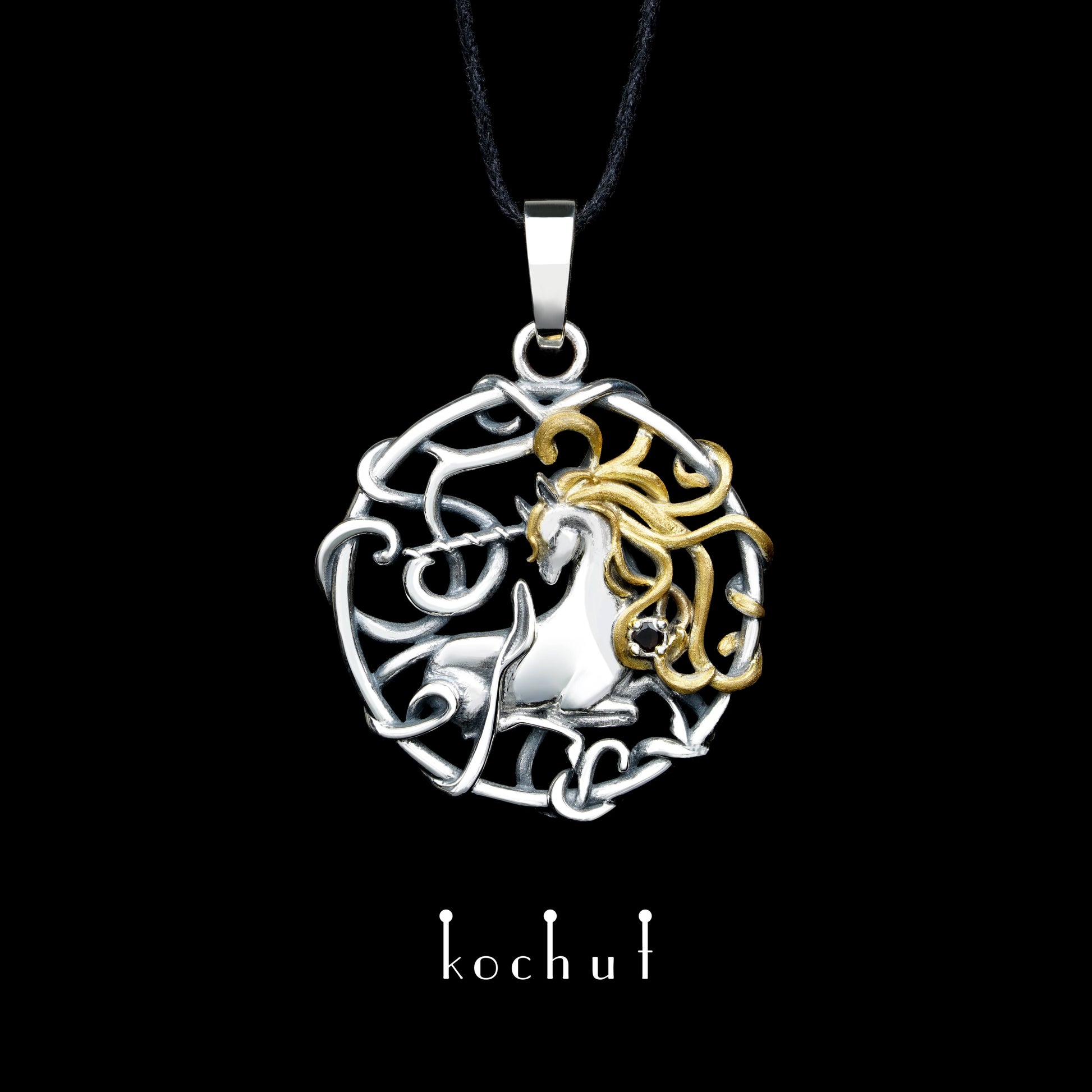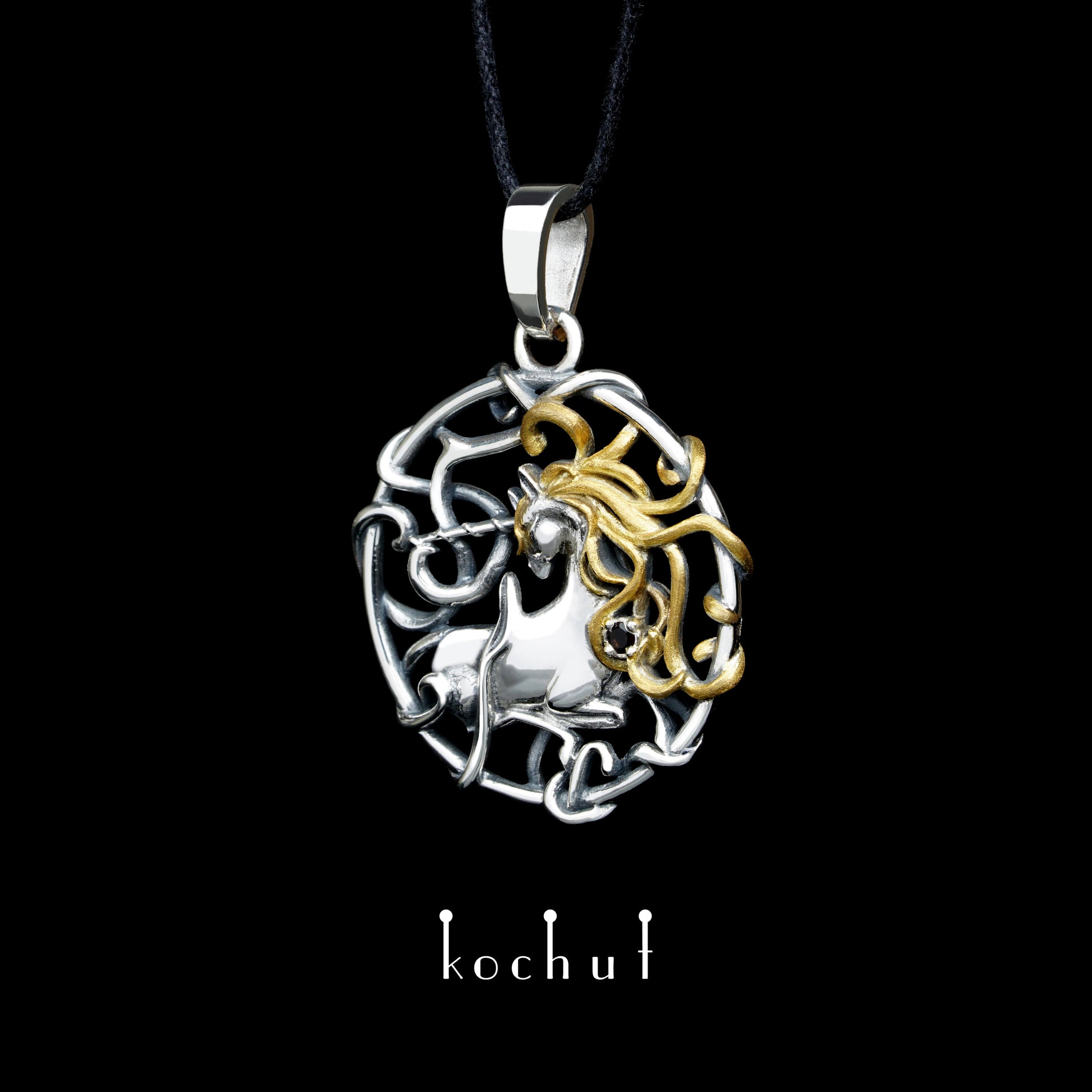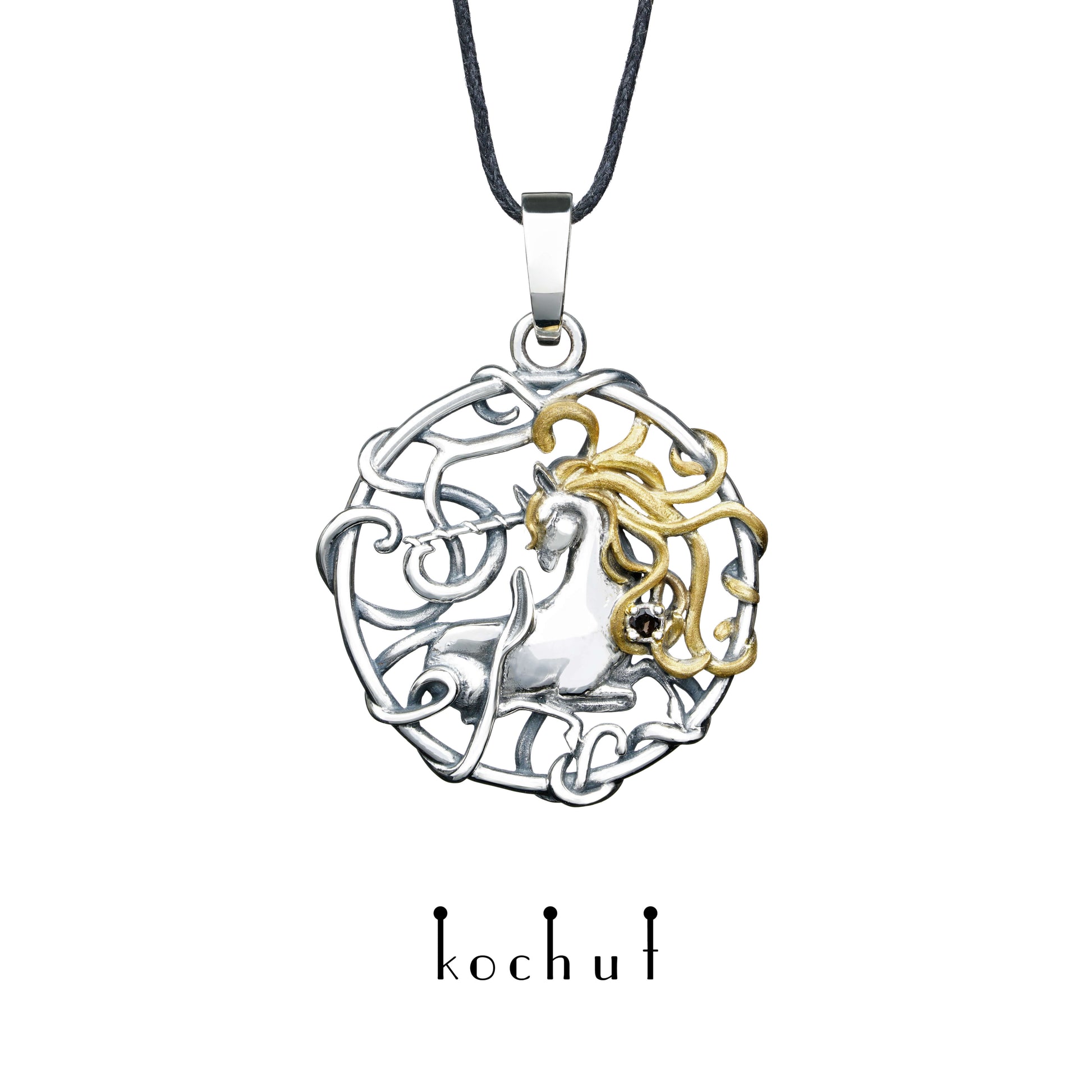 Goldhaar-Einhorn — Anhänger aus oxidiertem Silber mit Rauchquarz und Vergoldung