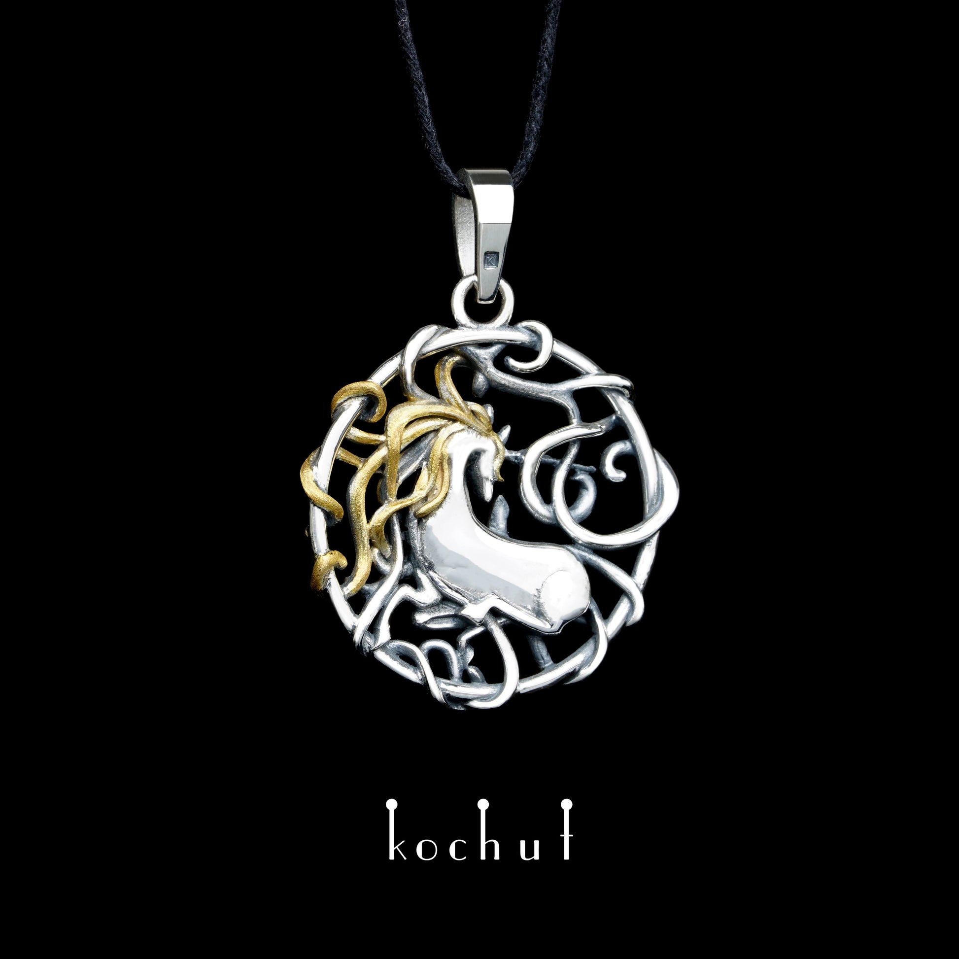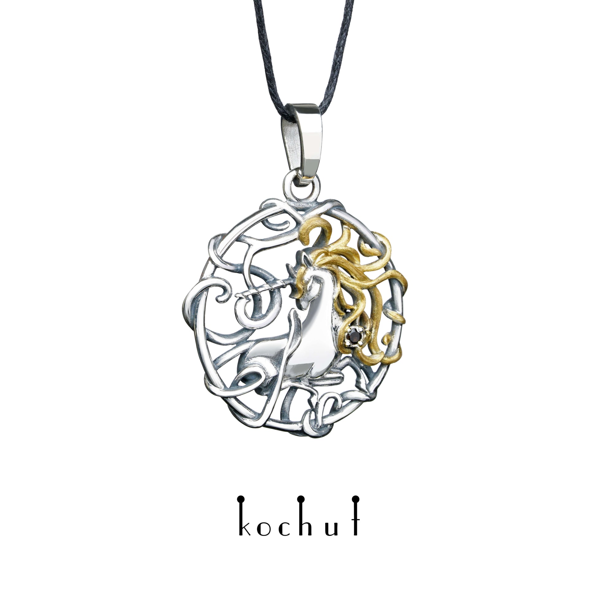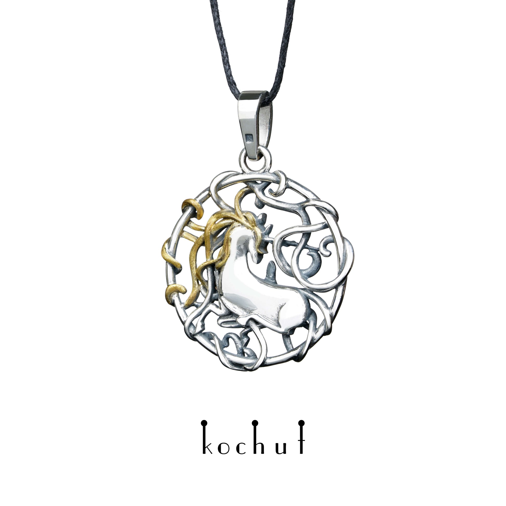 Goldhaar-Einhorn — Anhänger aus oxidiertem Silber mit Rauchquarz und Vergoldung