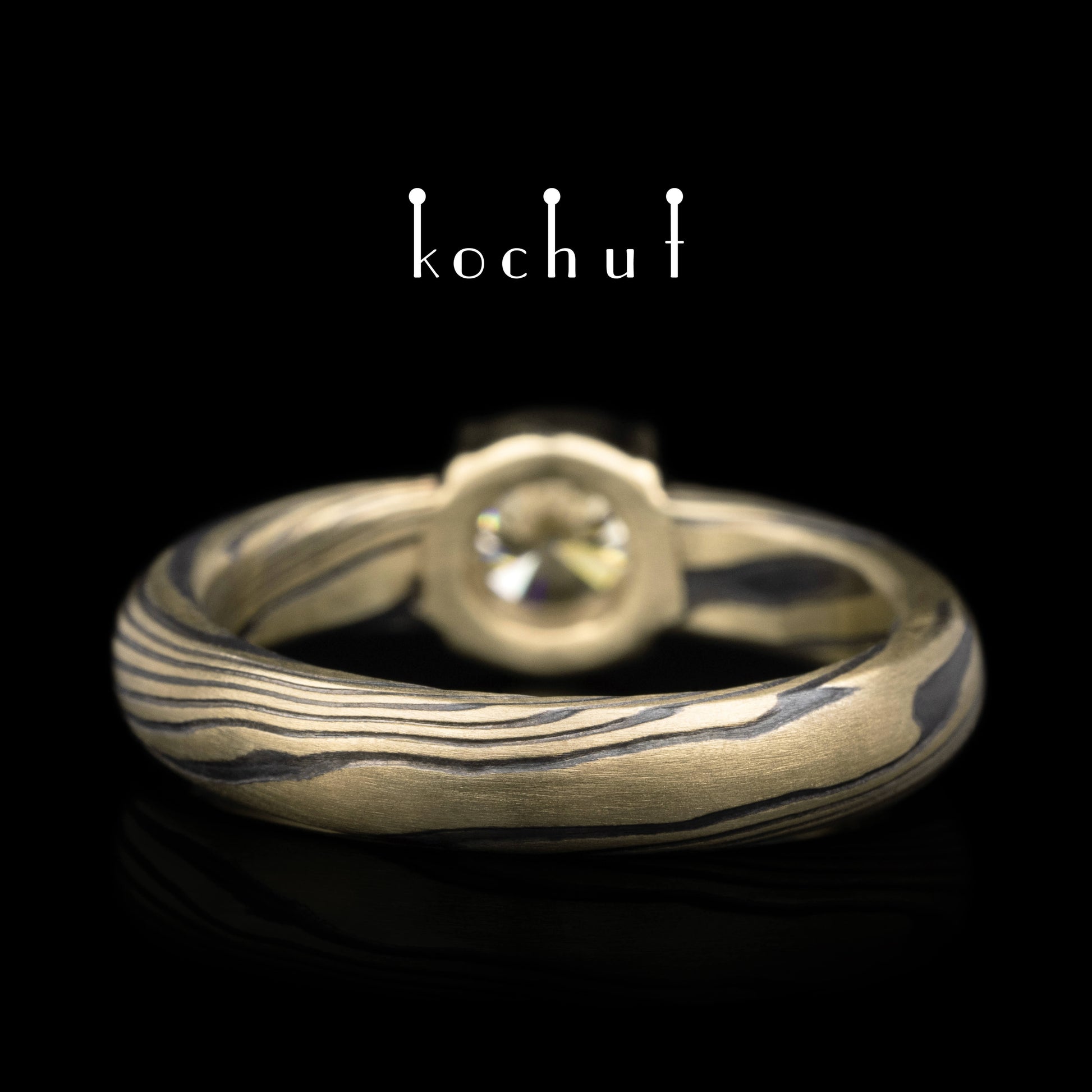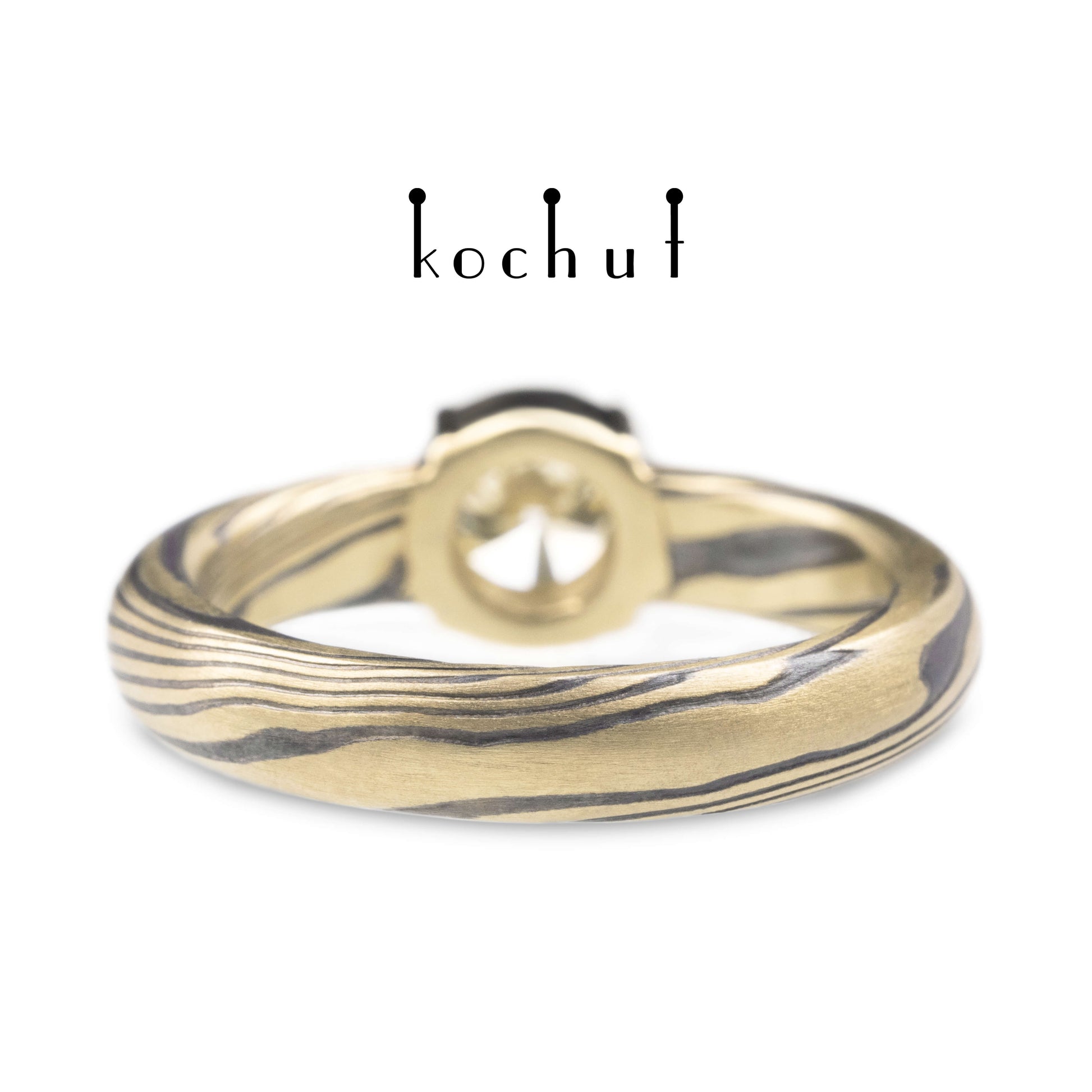 Haiku — Mokume-Ring aus Gelbgold mit graviertem und oxidiertem Silber sowie einem braunen Diamanten