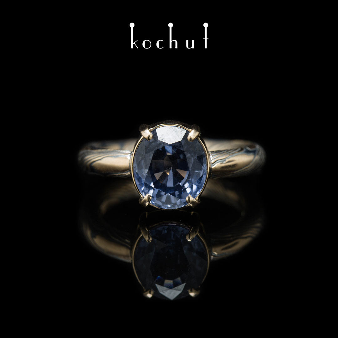 Haiku — Mokume-Ring aus Rotgold, graviert und oxidiertes Silber mit blauem Spinell