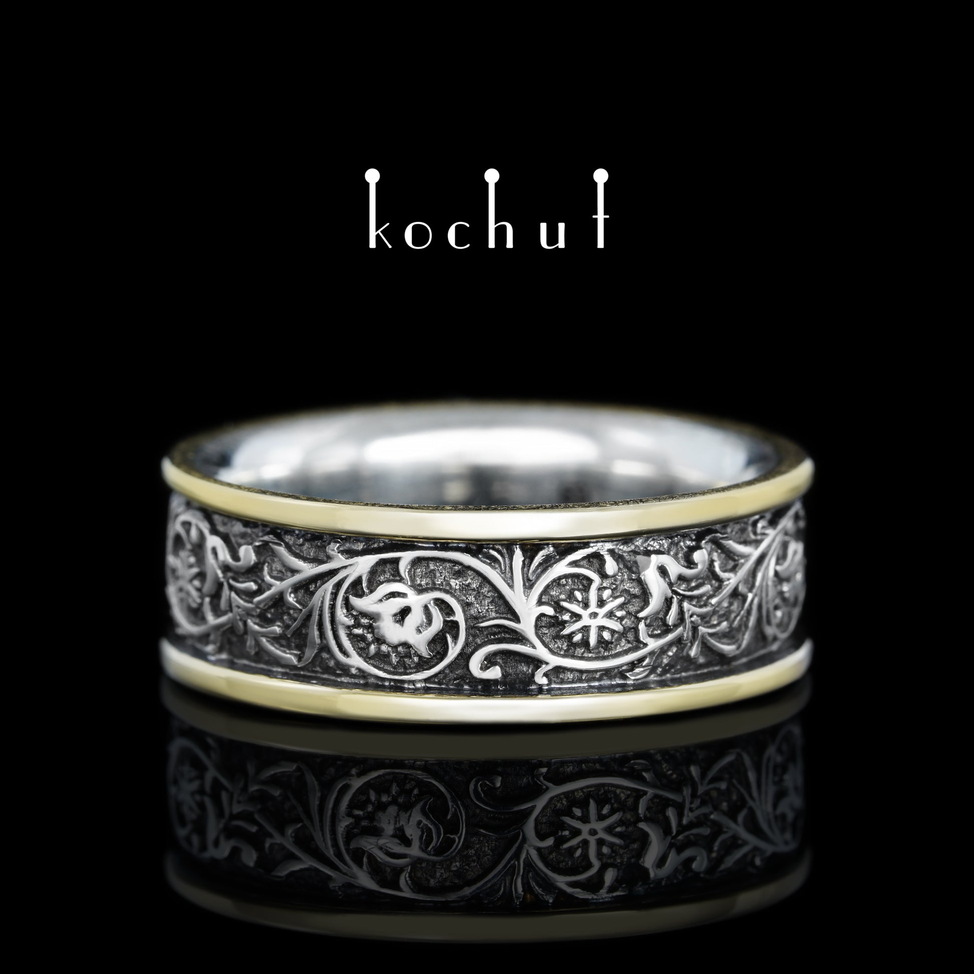 Harmonie der Natur mit zwei Ringen — Ehering aus Silber und Gelbgold, überzogen mit schwarzem Rhodium