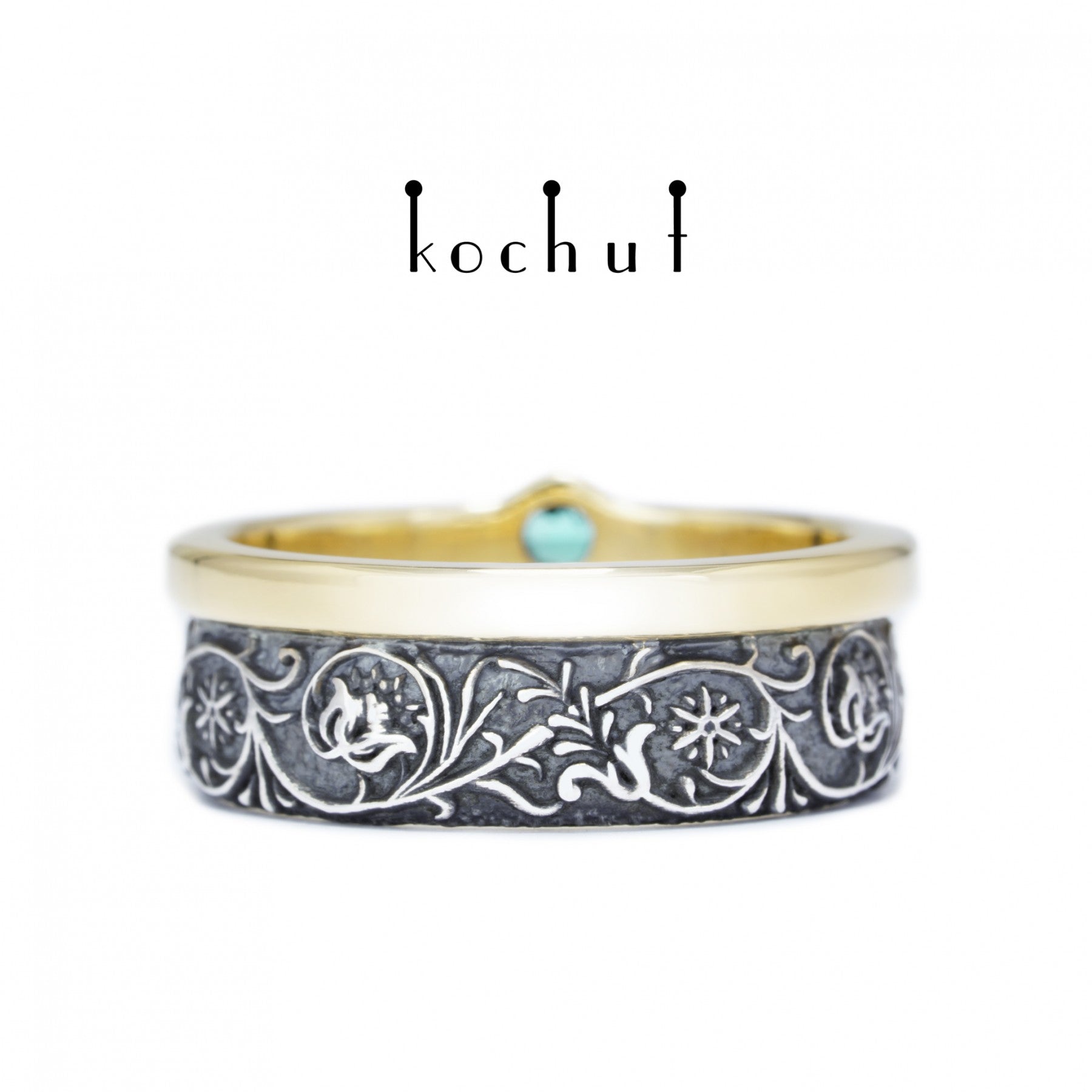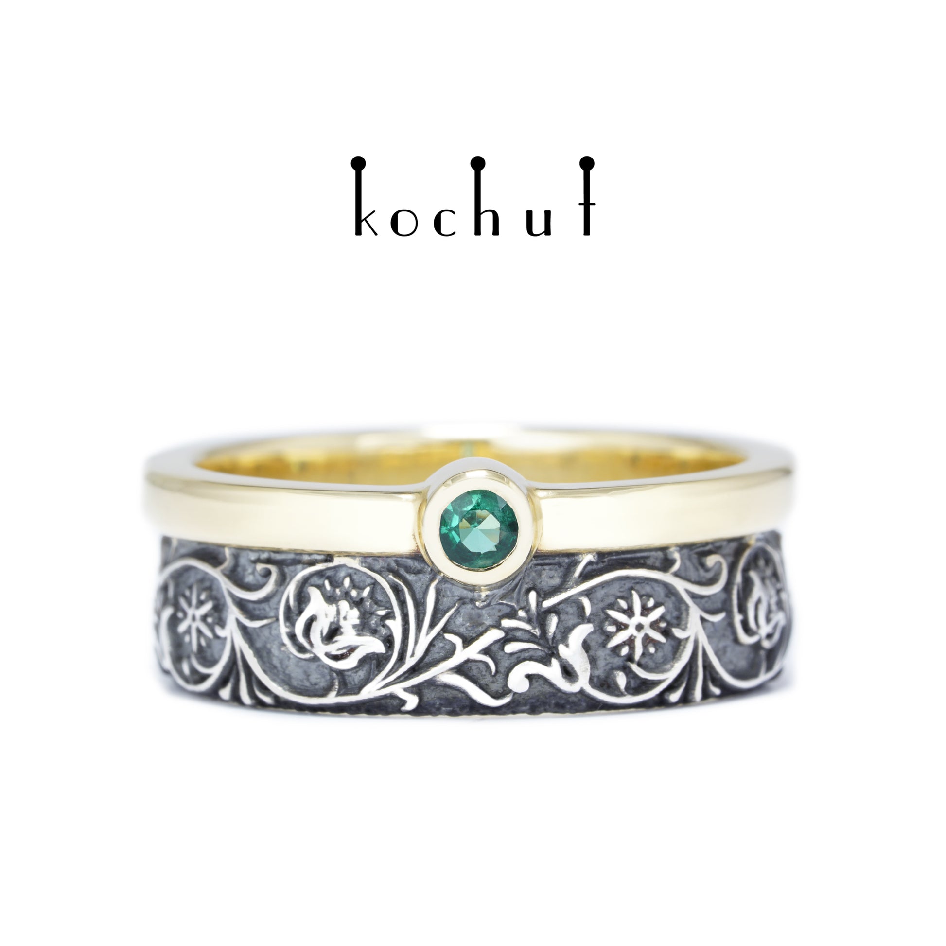 Harmonie der Natur — Ring aus Gelbgold und Silber mit Smaragd, überzogen mit schwarzem Rhodium