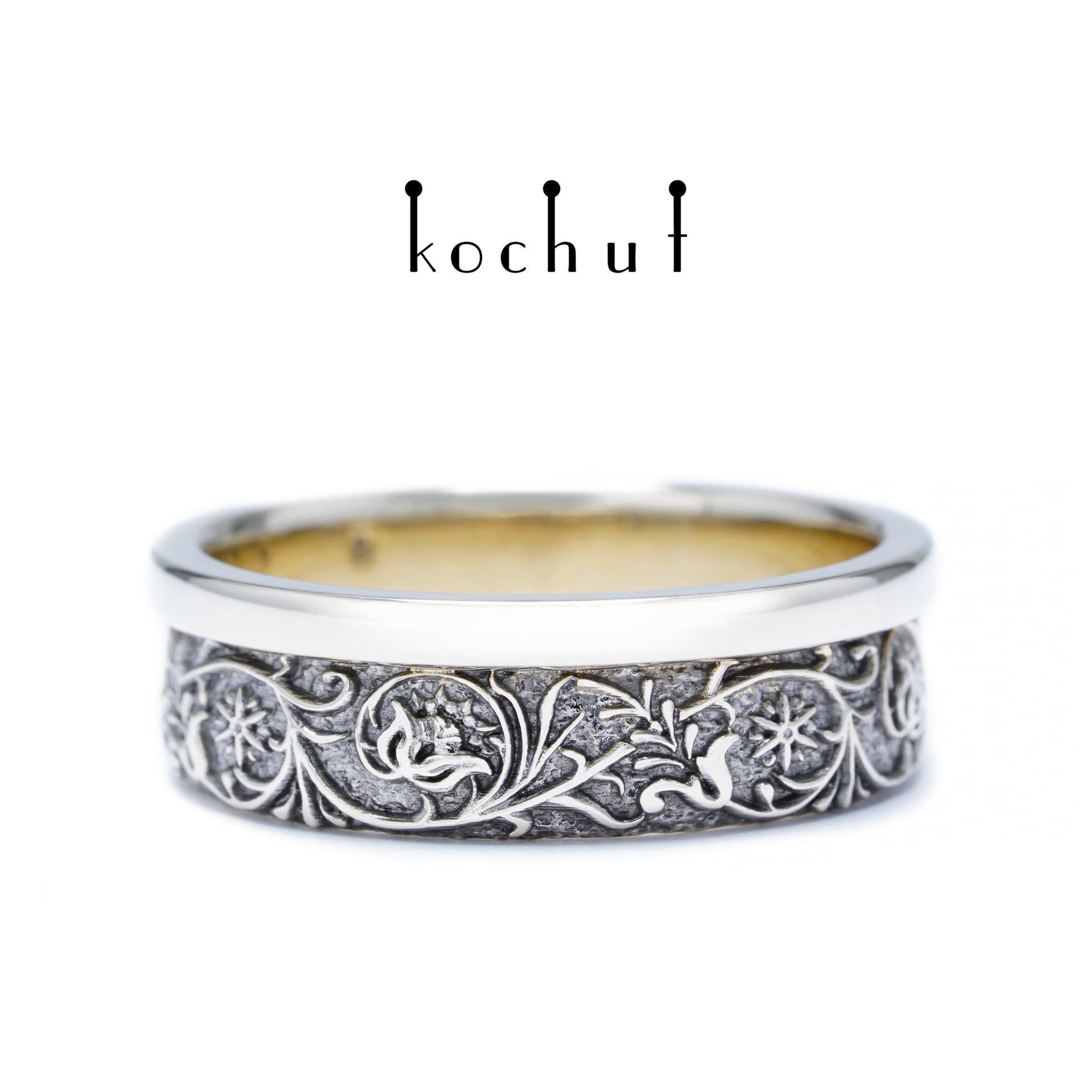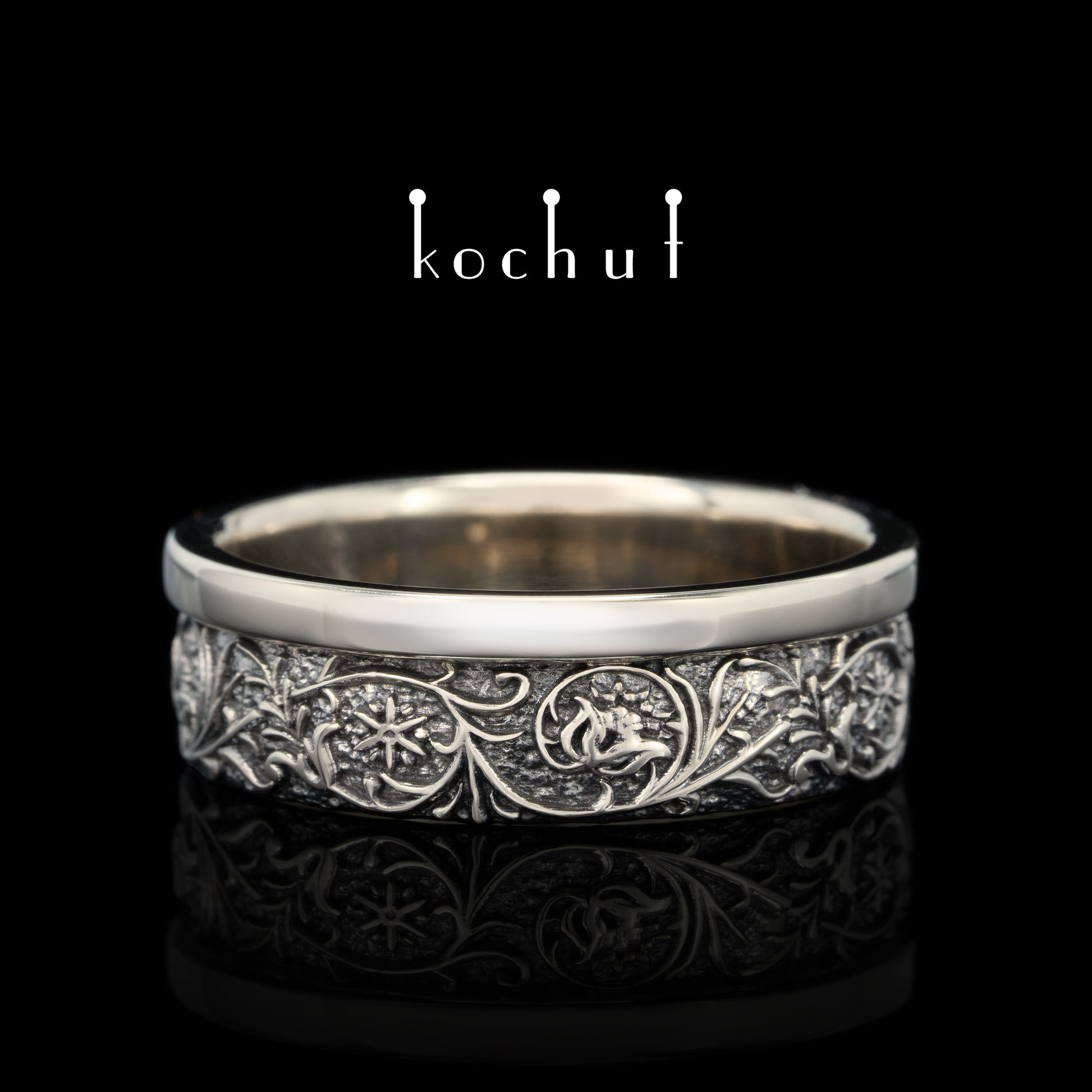 Dieser Ring ist keineswegs glatt. Man kann ein silbernes Blumenmuster mit galvanischer Beschichtung darauf sehen. Dieses Ornament ist ein Symbol für die Frische der ersten Liebe. Eine Blume, die sich allmählich öffnet und Ihre Seele umarmt. Die Blütenblätter des Rings greifen nach seinem Besitzer und verleihen ihm die Schönheit seines Aussehens. Blumen sind die Kinder der Natur, kleine Herren der Welt. Sie ernähren sich von Luft und Wasser und schenken ihren Trägern die unglaubliche Energie des Planeten.