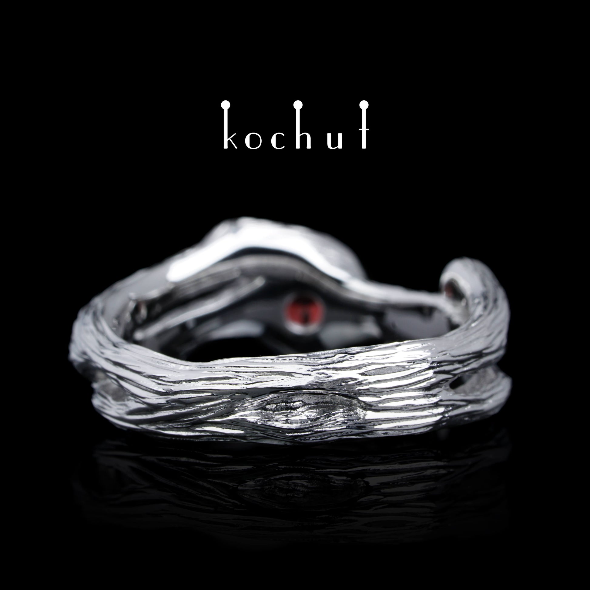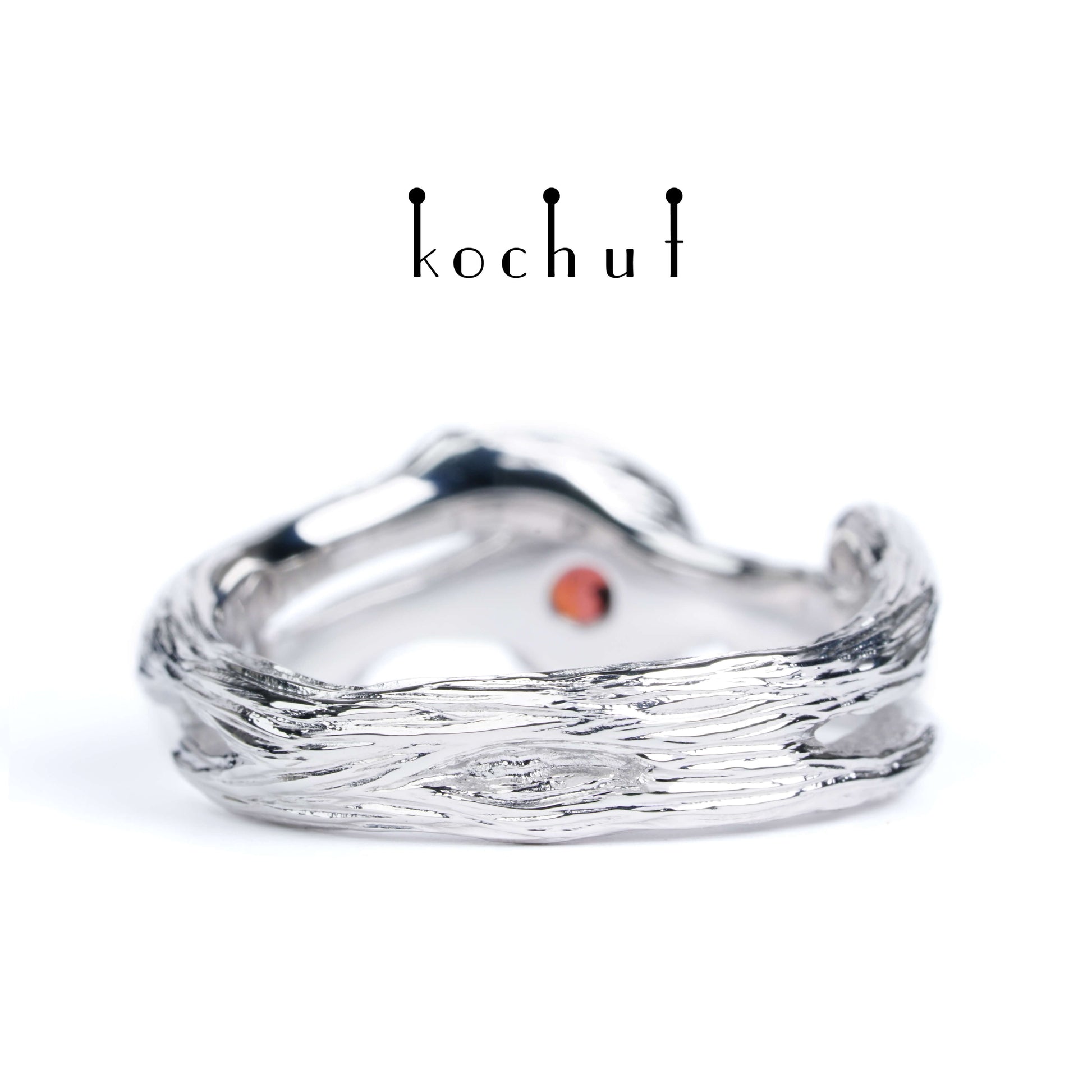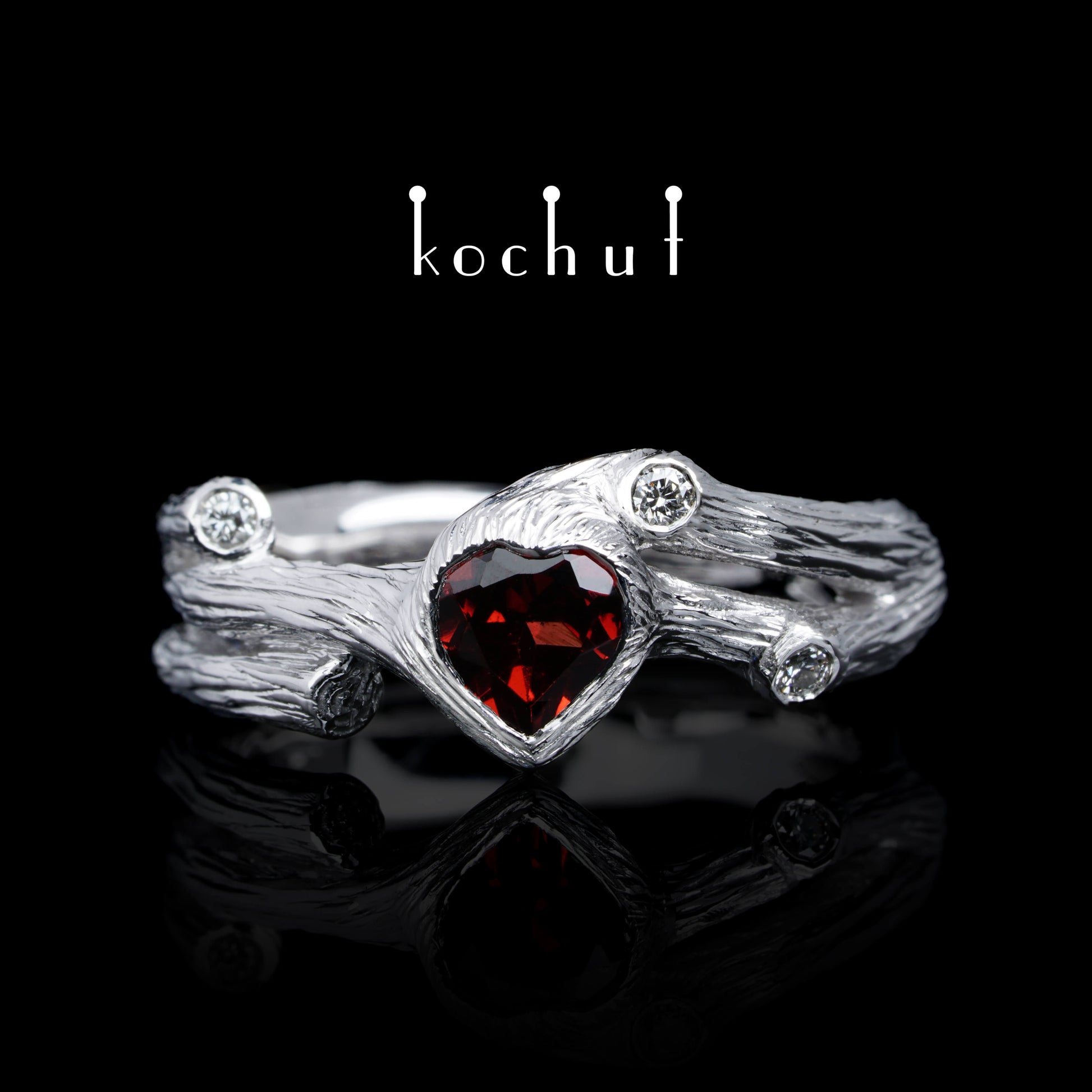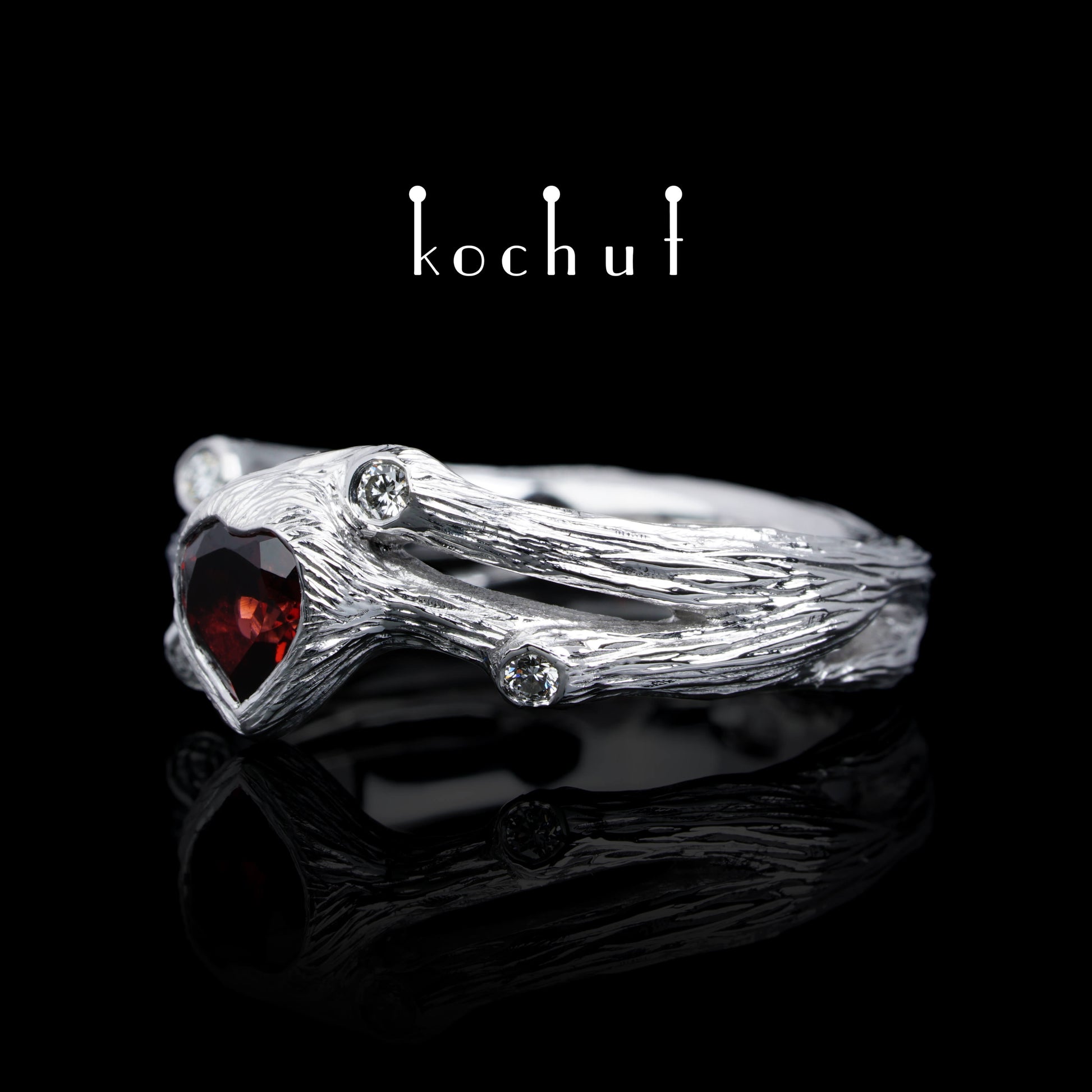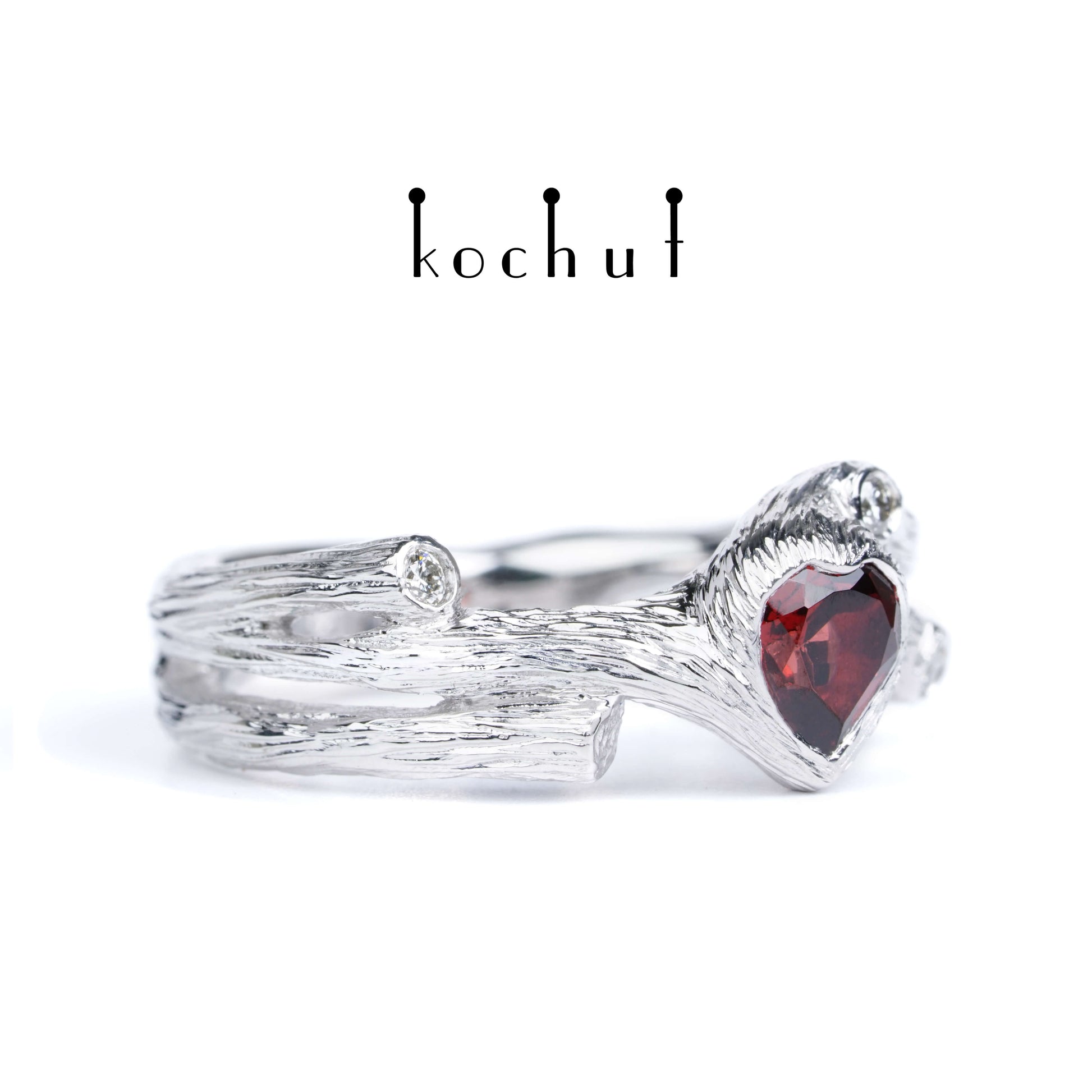 Herz des Waldes — Ring aus Weißgold mit Granat und Diamanten, platiert mit weißem Rhodium