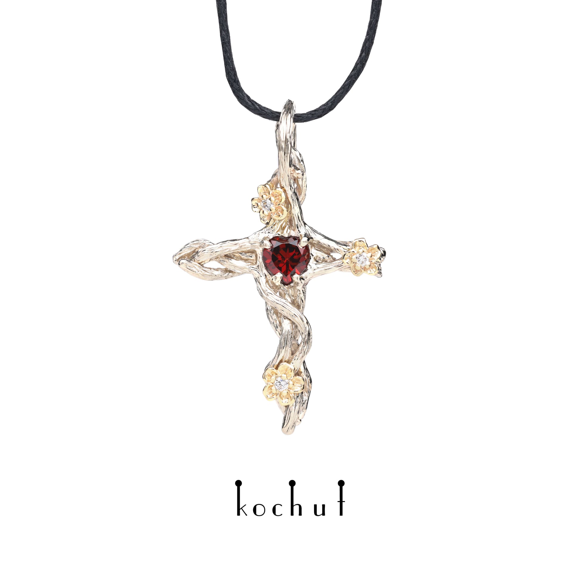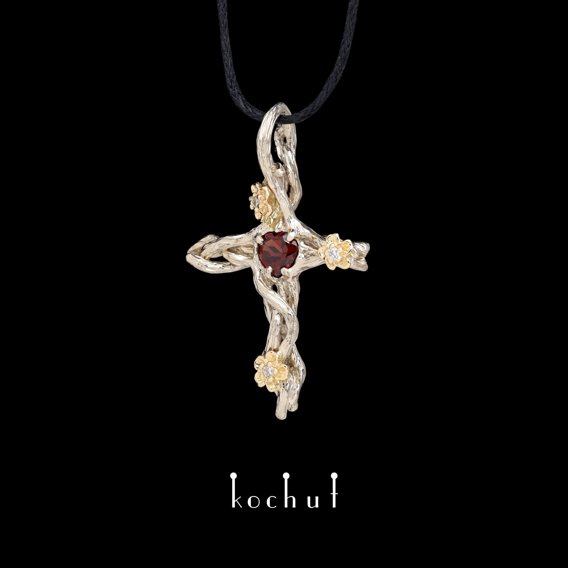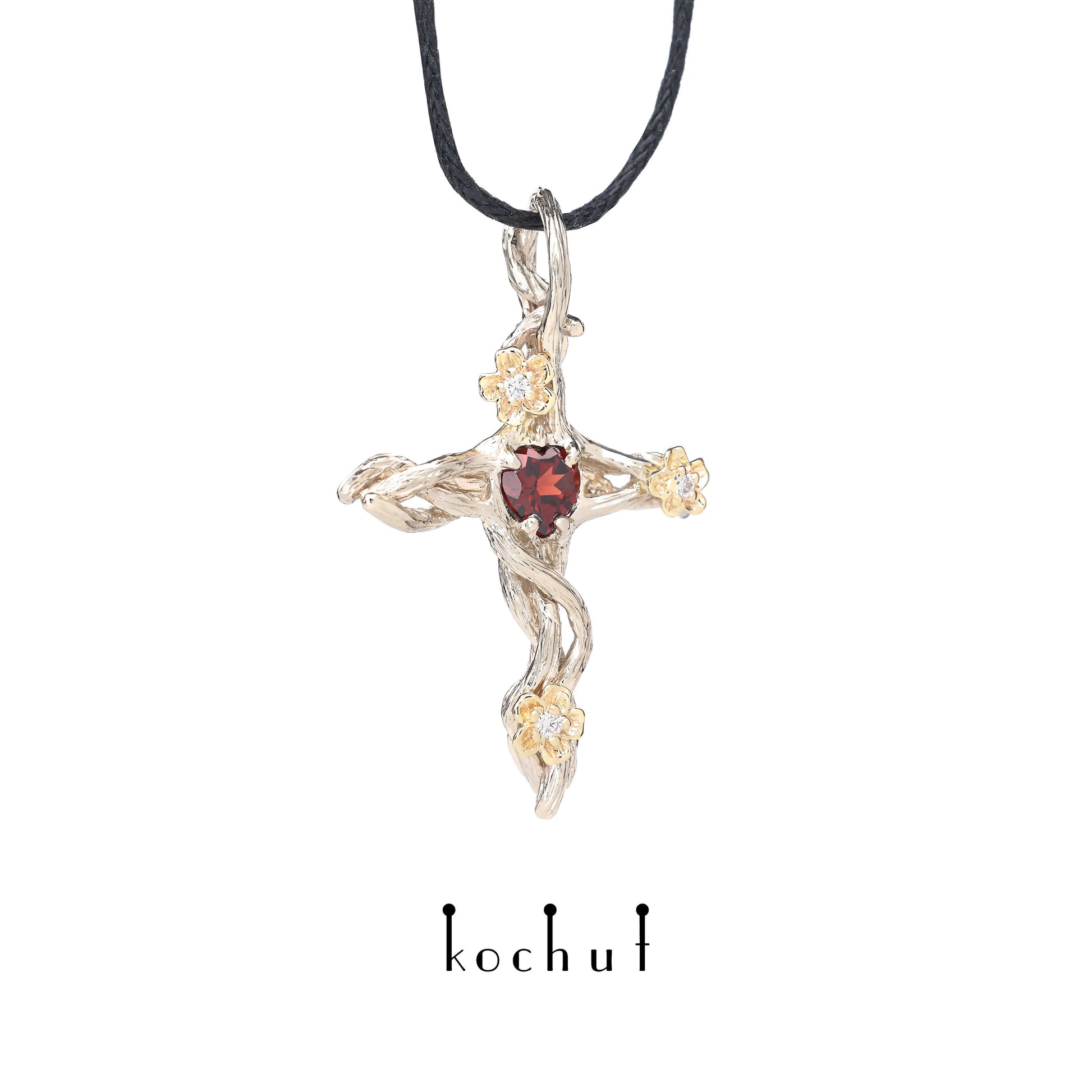 Herzgarten — Kreuz aus Weiß- und Gelbgold mit Granat und Diamanten