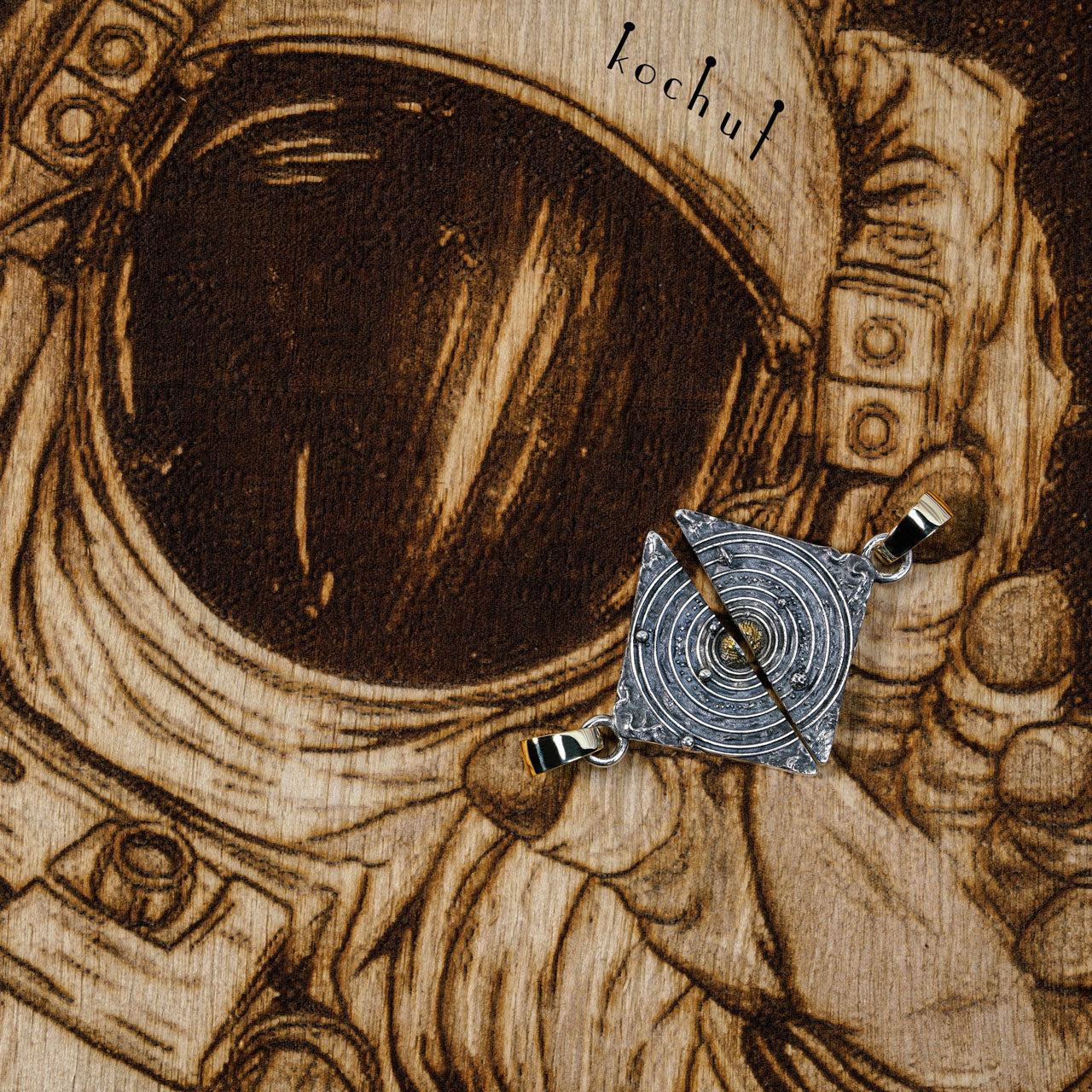 Interplanetare Liebe — Doppelanhänger aus oxidiertem Silber und Gelbgold mit Vergoldung