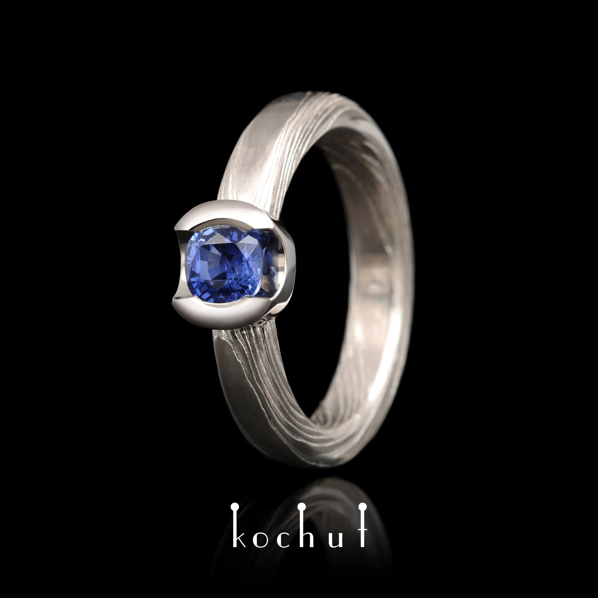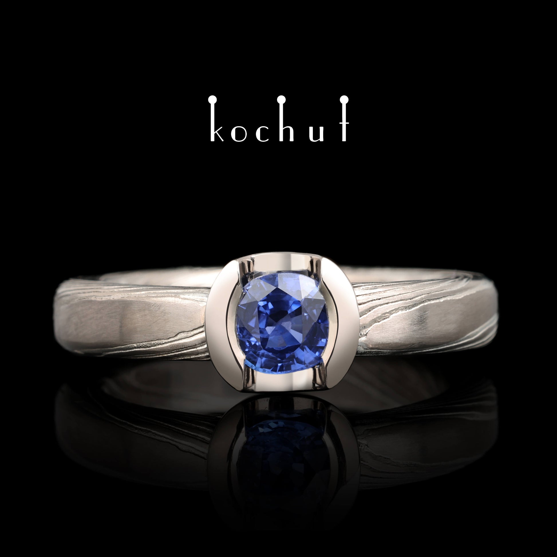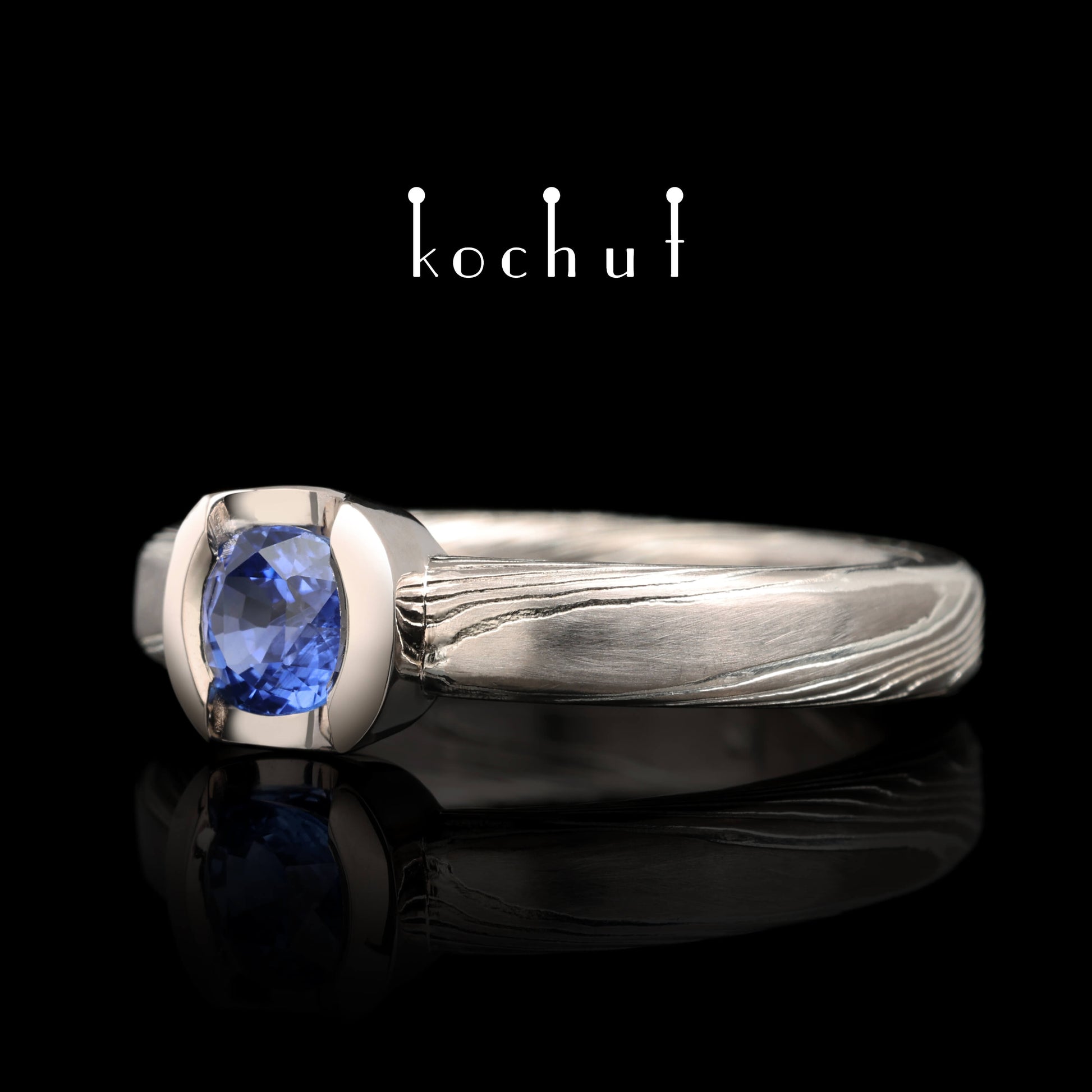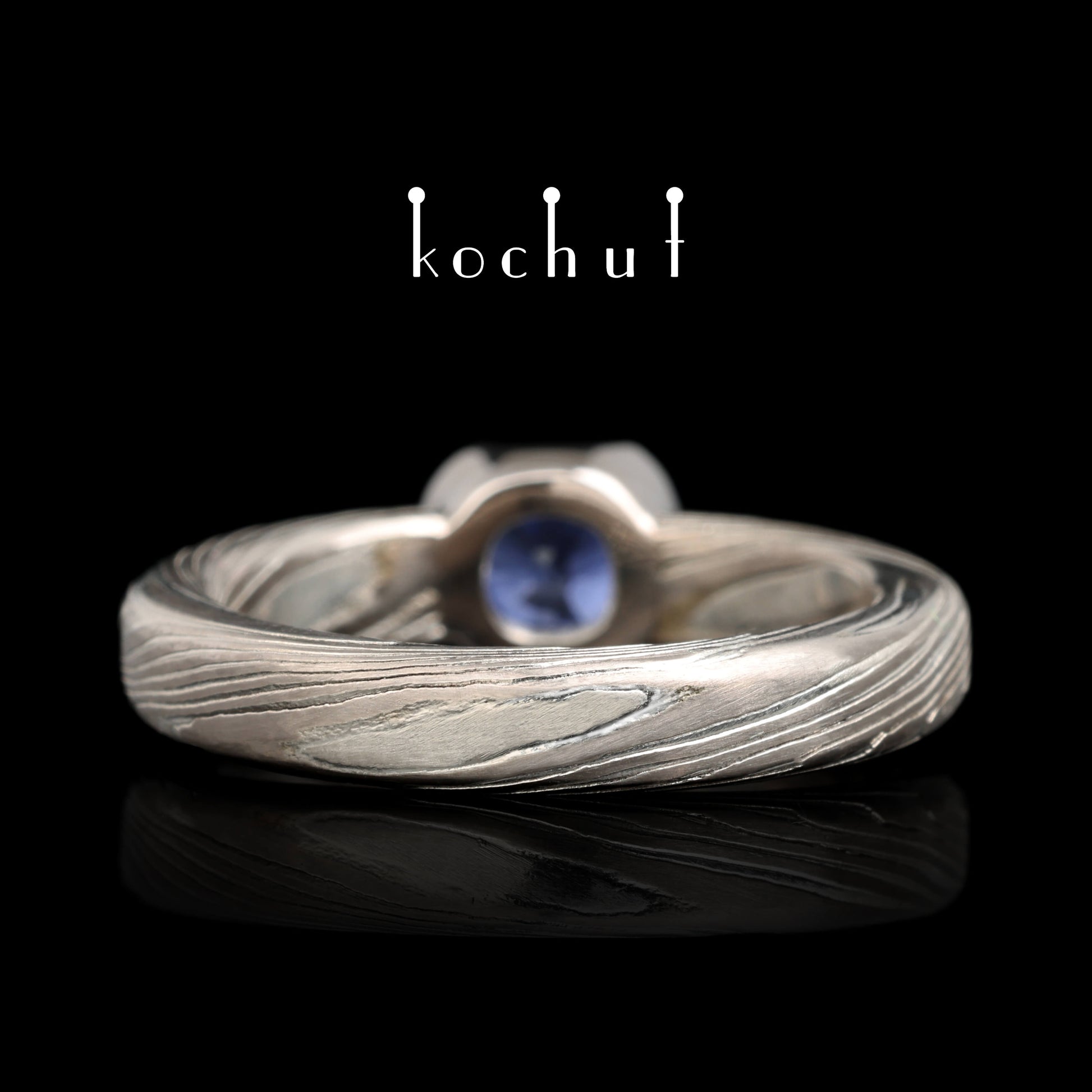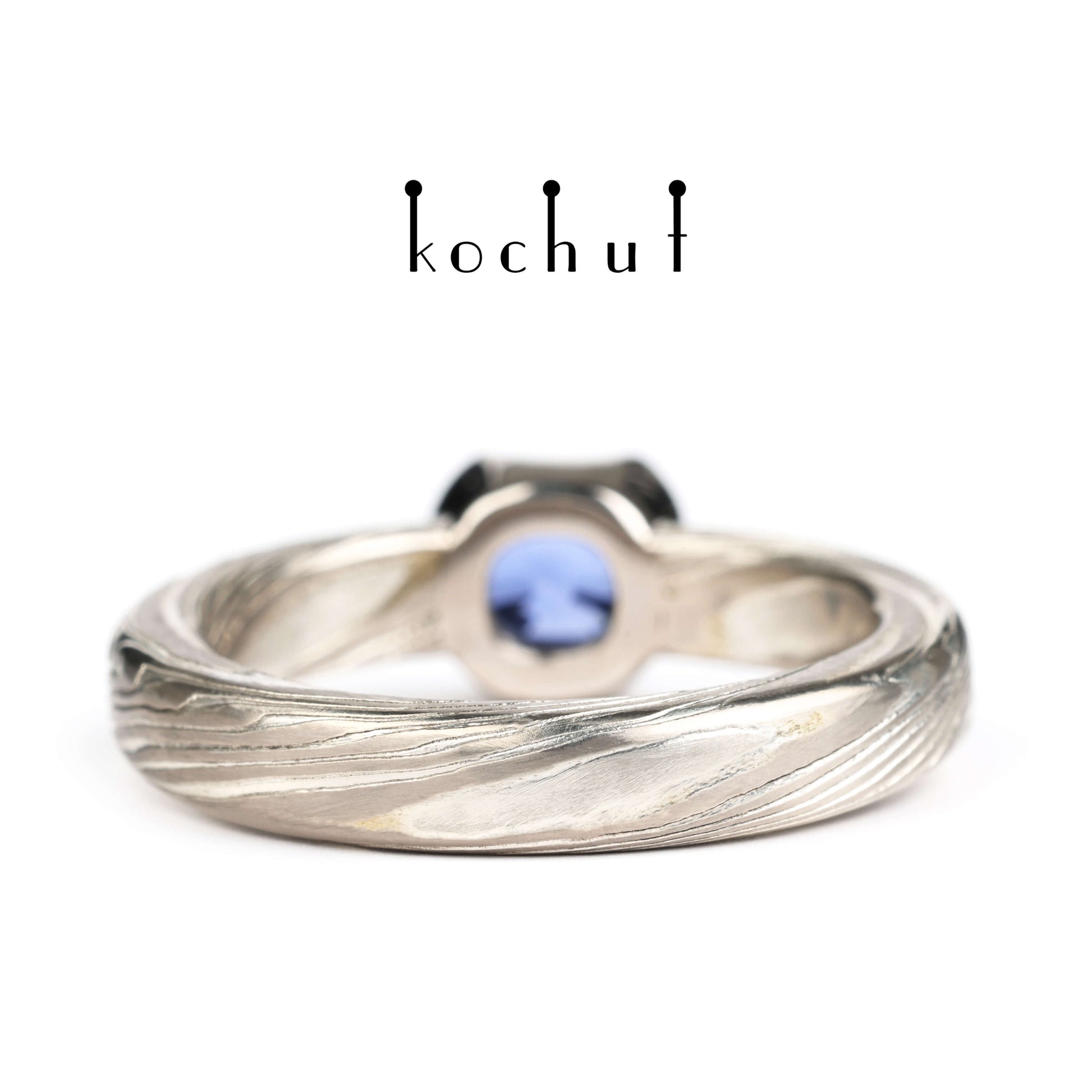 Jugen — Mokume-Ring aus Palladium-Gold und graviertem Silber mit Kornblumen-Saphir