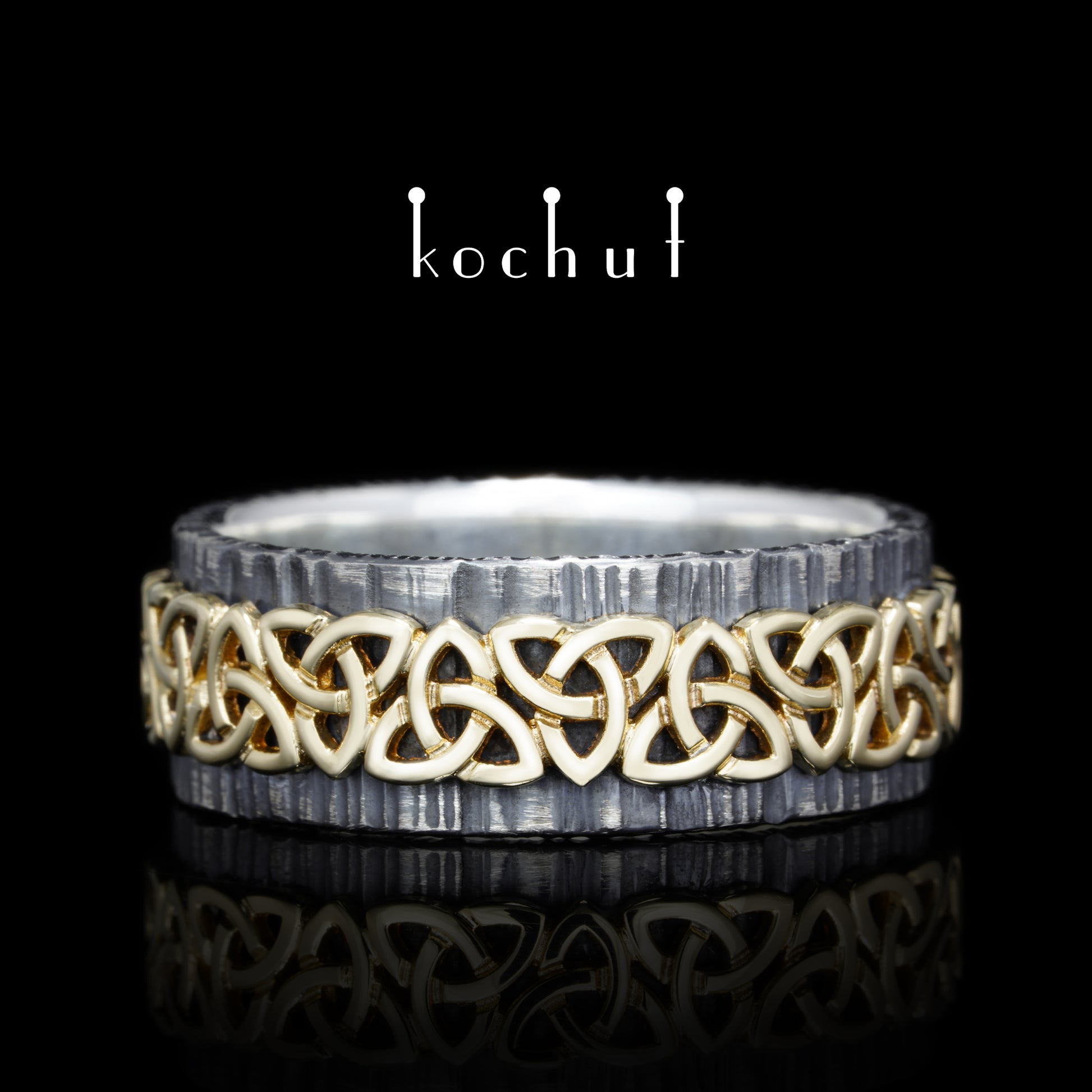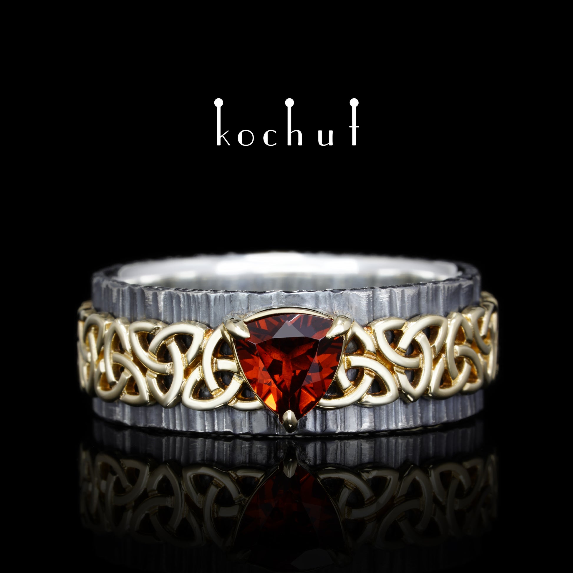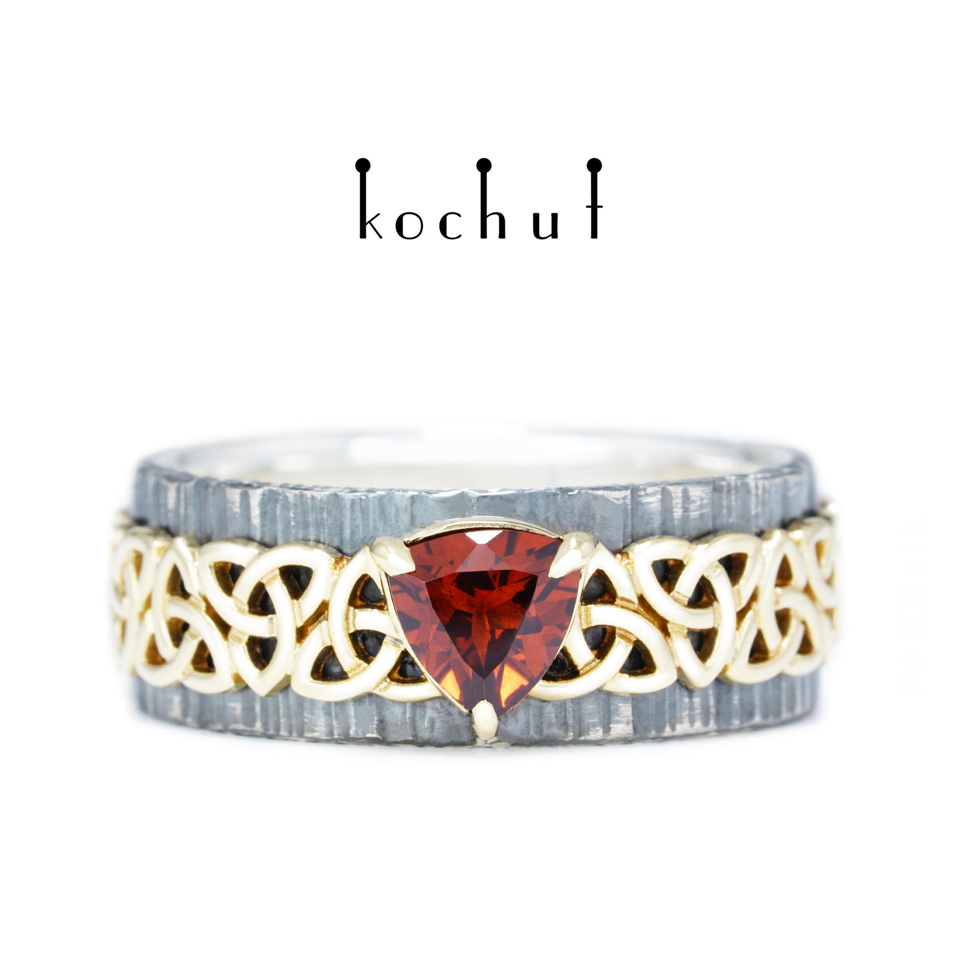 Keltisches Muster — Ring aus oxidiertem Silber und Gelbgold mit Granat