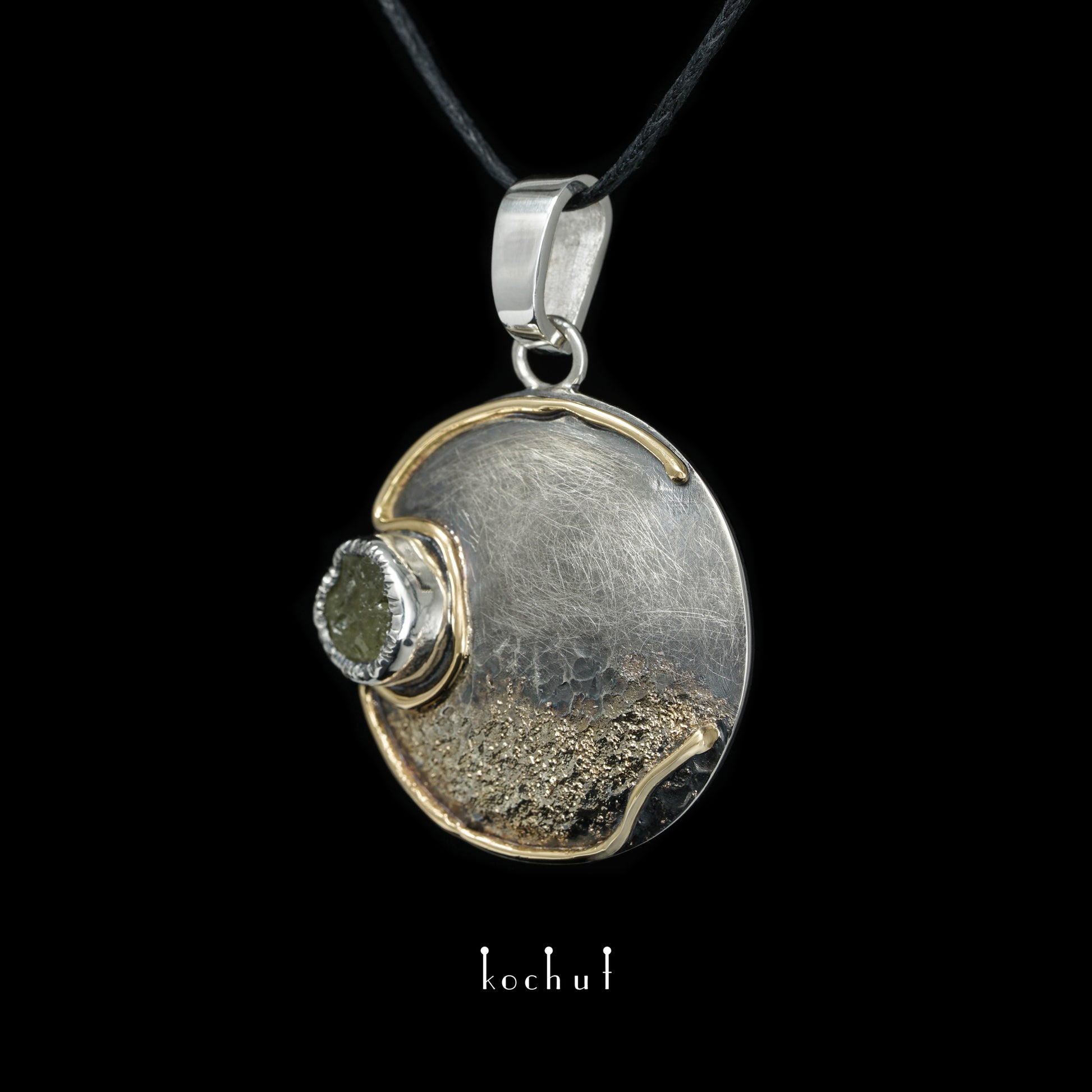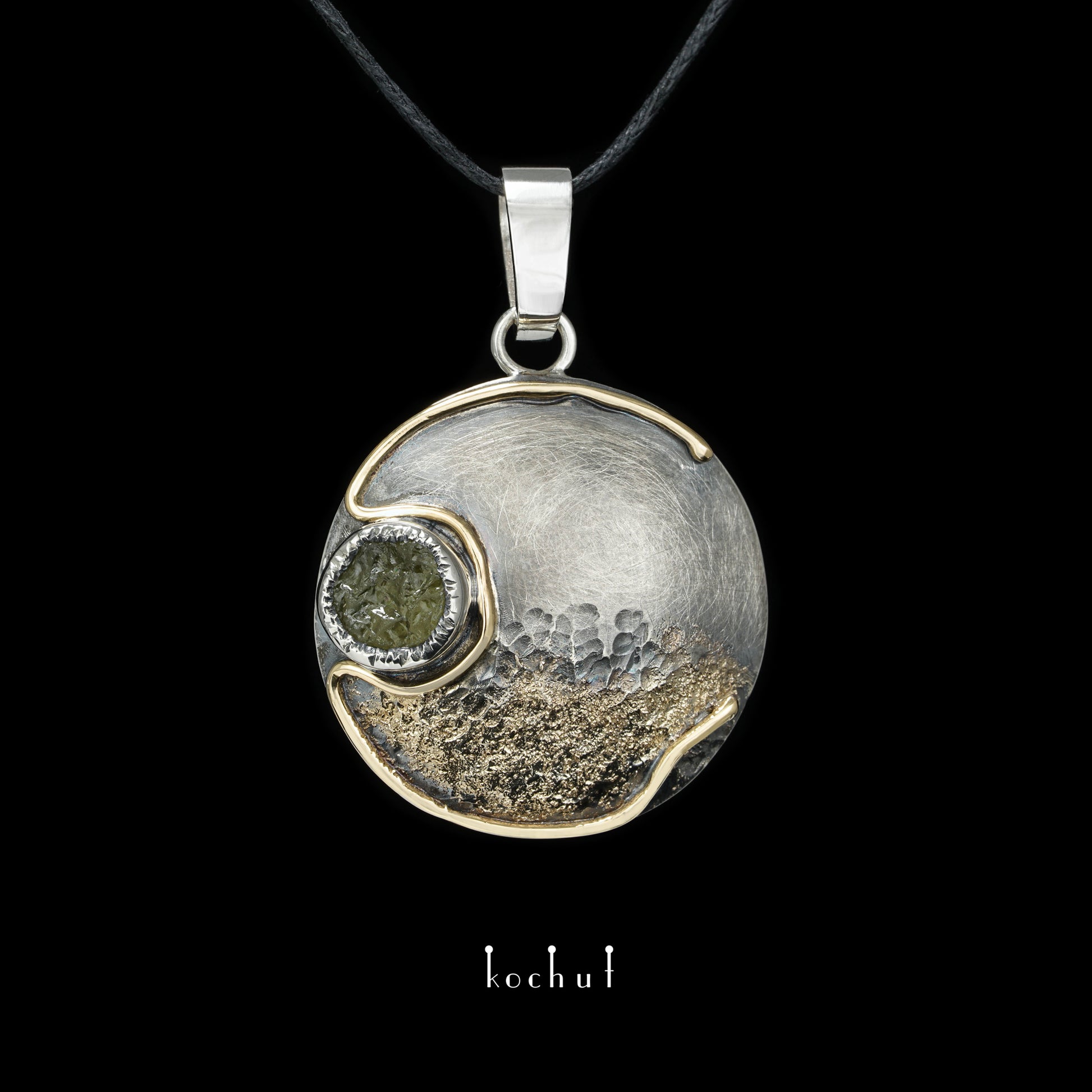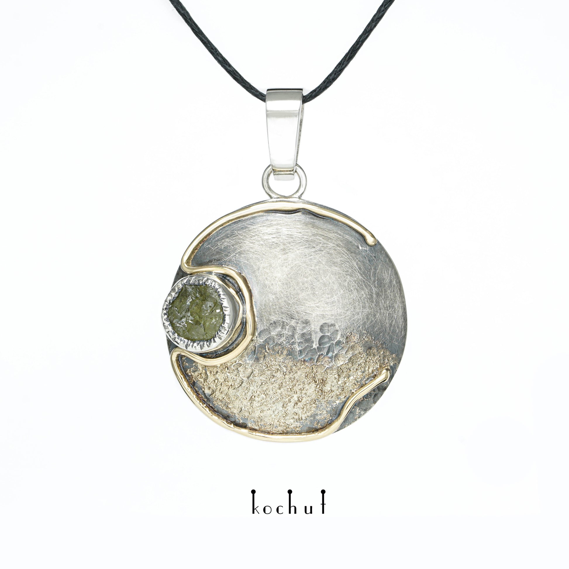 Kosmischer Anbruch — Anhänger aus oxidiertem Silber und Gelbgold mit grünem Granat-Kristall
