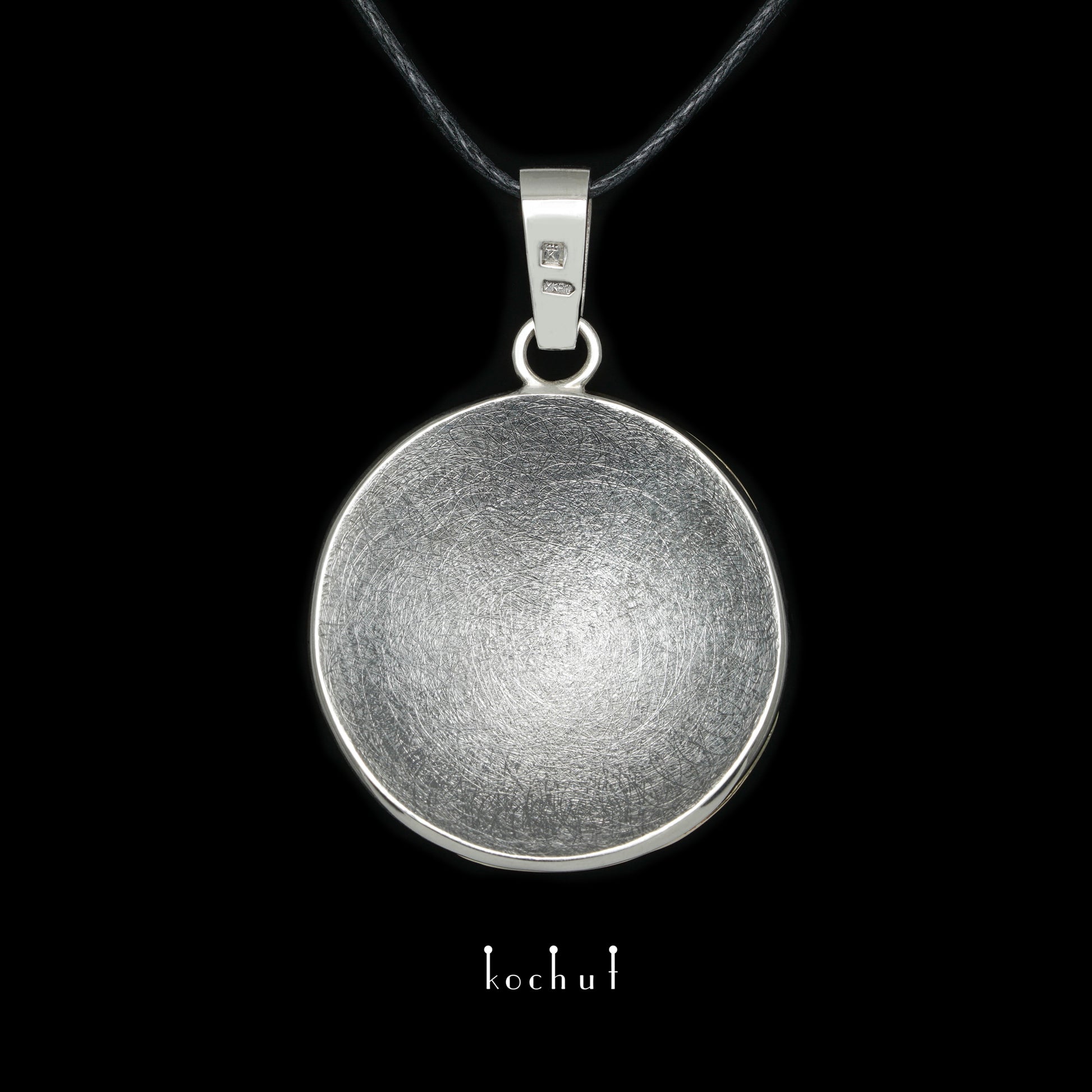 «Cosmic Dawn» ist ein Anhänger, der als Ode an die grenzenlose Weisheit des Universums geschaffen wurde. Er wurde aus oxidiertem Silber in Form des Sonnensystems und seiner Planeten gefertigt. Auf der Seite des Anhängers sitzt ein grüner Granat, der den kosmischen Raum schmückt, den wir innerhalb des Schmuckstücks geschaffen haben.