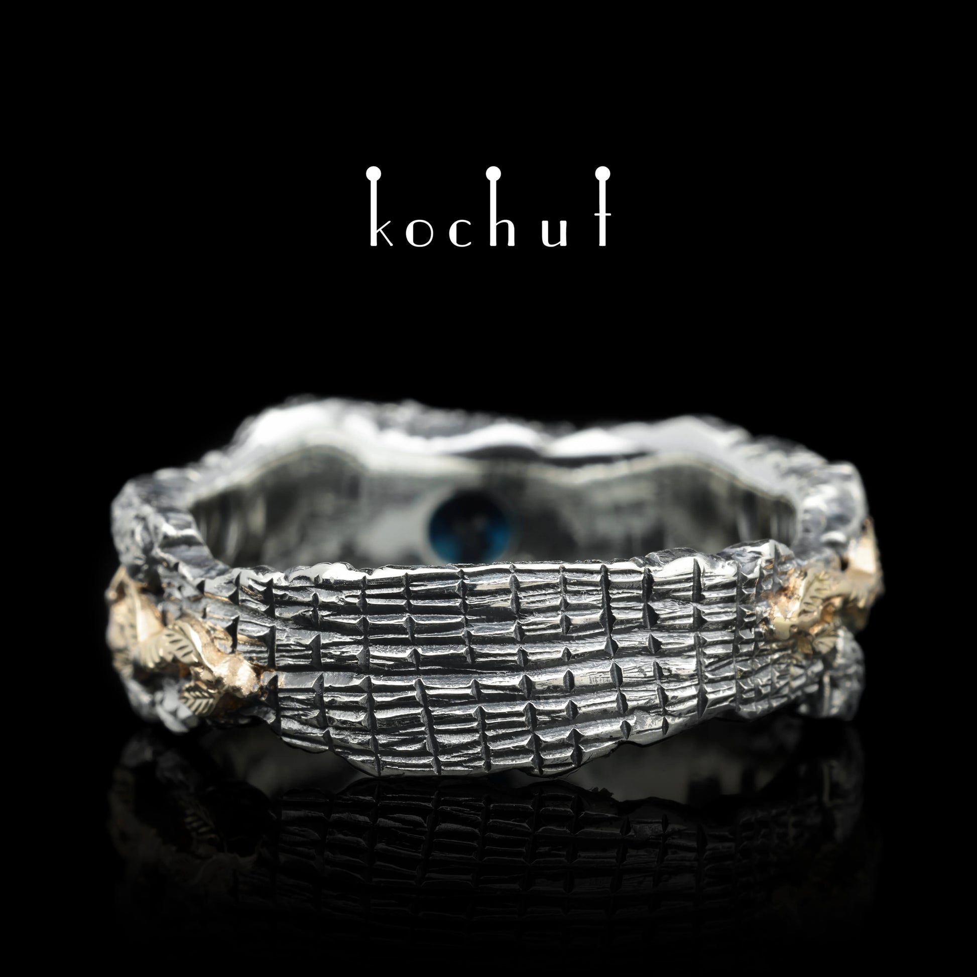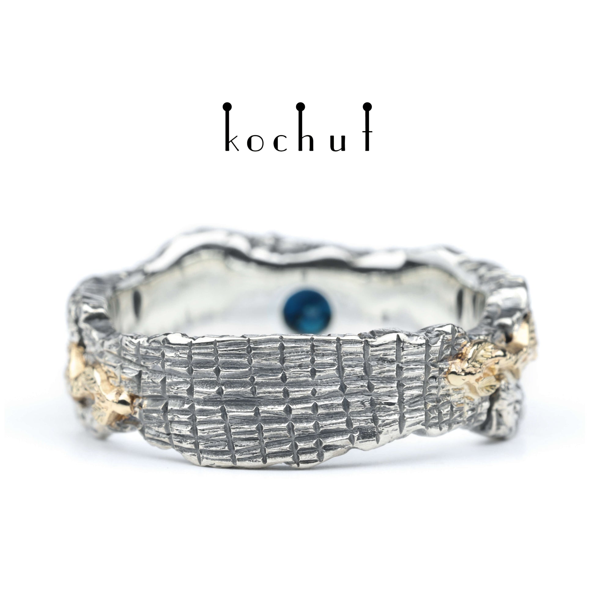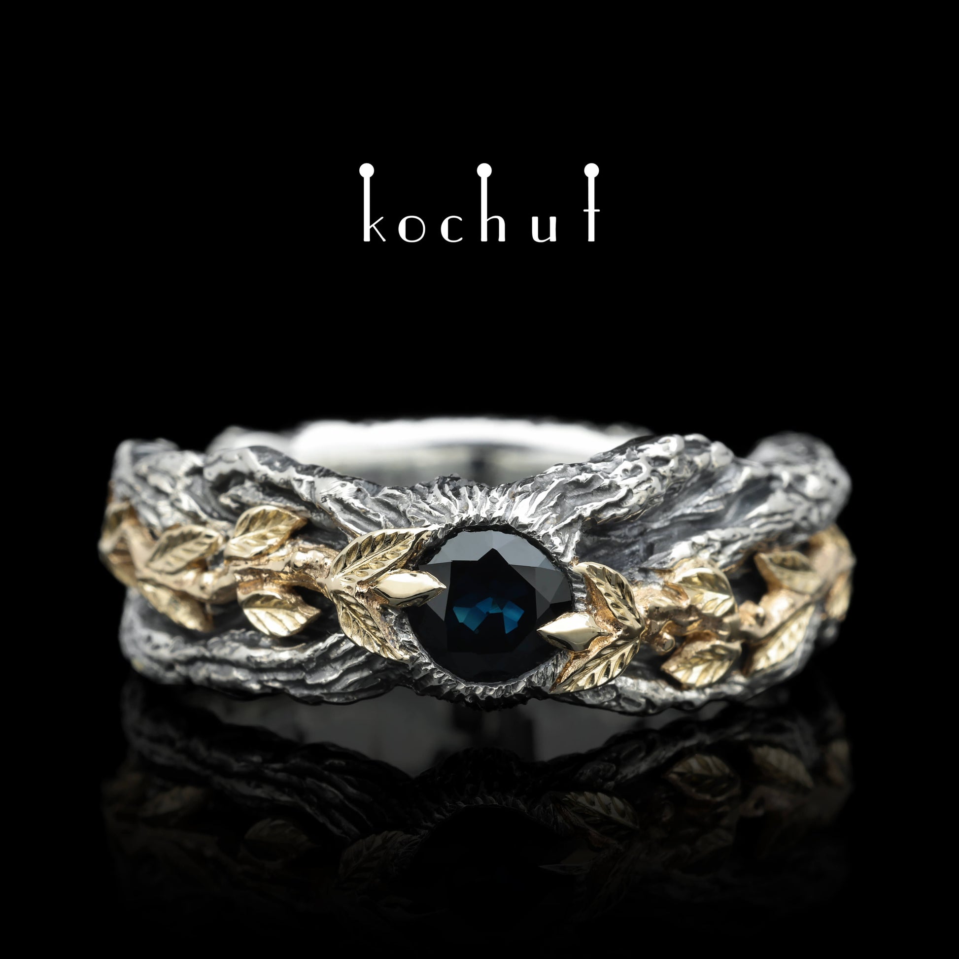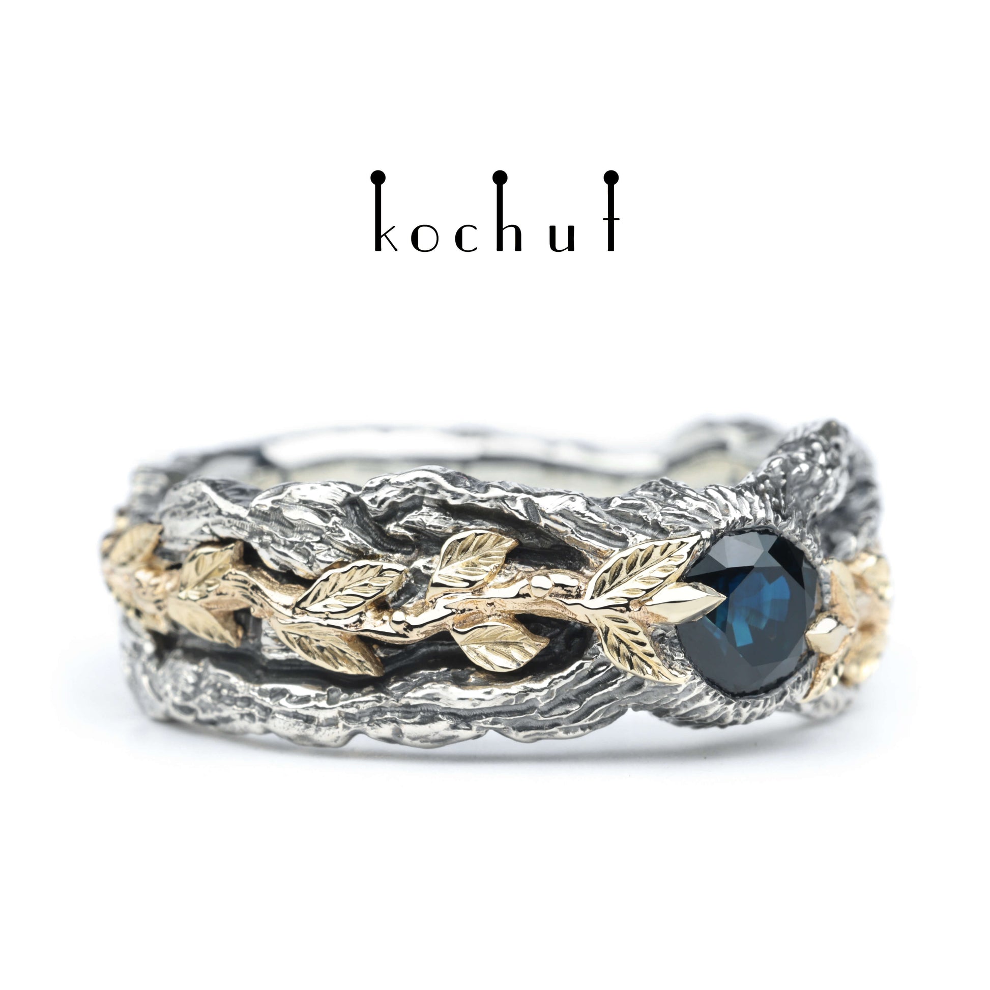 Der Grundkörper ist aus texturiertem Silber gefertigt und mit Oxidation überzogen. Goldene Blumenlinien führen sanft zu einem symbolischen Stein – einem blauen Saphir vor goldener und silberner Kulisse.
